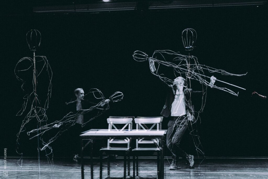 O coregrafie fascinantă de gânduri și emoții scrise, citite, rostite, dansate, minunat aduse împreună, tălmăcite și revelate cu ajutorul a doi iscusiți actori: Alina Petrică și Lari Giorgescu. Cu excelente abilități vocale, de rostire și de mișcare, cu o mobilitate de zile mari și o bucurie vizibilă de interpretare, cu mare chef de joc și de joacă, cei doi actori îi cocoață pe Ea și pe El într-un car alegoric, pe care-l învârt cu dibăcie în scenă printre cuvintele căciulene, într-o ședință complexă de terapie a cotidianului care le-a năpădit existențele mizere, muncind din răsputeri să-i curețe intestinele pline de bube, sânge, puroi, muci, vome și mucegaiuri, pe care le învelesc priceput în puf de păpădie, aripi de fluture, baloane colorate și sfori de zmee, pentru a le lansa mai apoi către un multsperat niciodată, de unde are să se mai întoarcă doar vindecarea.