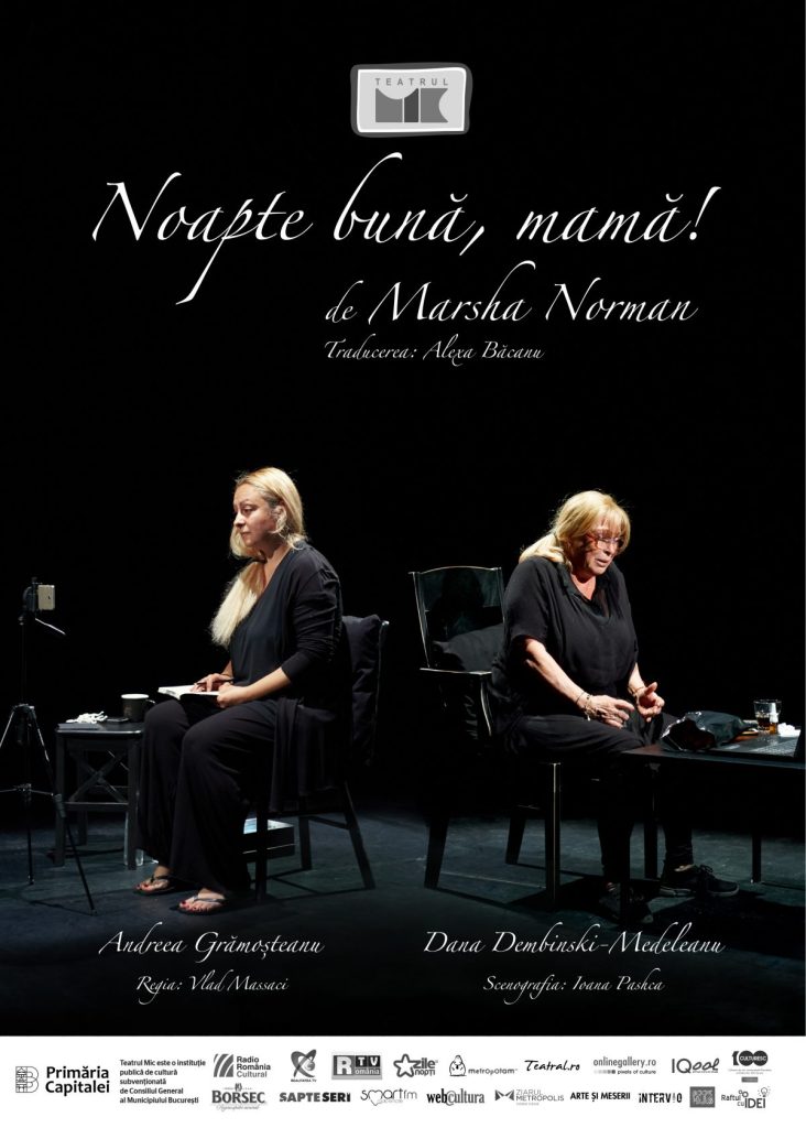 „Noapte bună, mamă!” este un spectacol din programul „Teatru pentru actori… și numai cu actori” al Teatrului Mic, care-și propune concentrarea pe detaliile interpretării actoricești și mai puțin pe viziunea regizorală. Este o demonstrație despre cât de mult se poate extrage din munca regizorului cu actorul, o confesiune de viață, dar și o confesiune profesională, pe o temă extrem de generoasă emoțional, a regizorului Vlad Massaci și a actrițelor Andreea Grămoșteanu și Dana Dembinski, ajunse la vârsta maturității artistice.