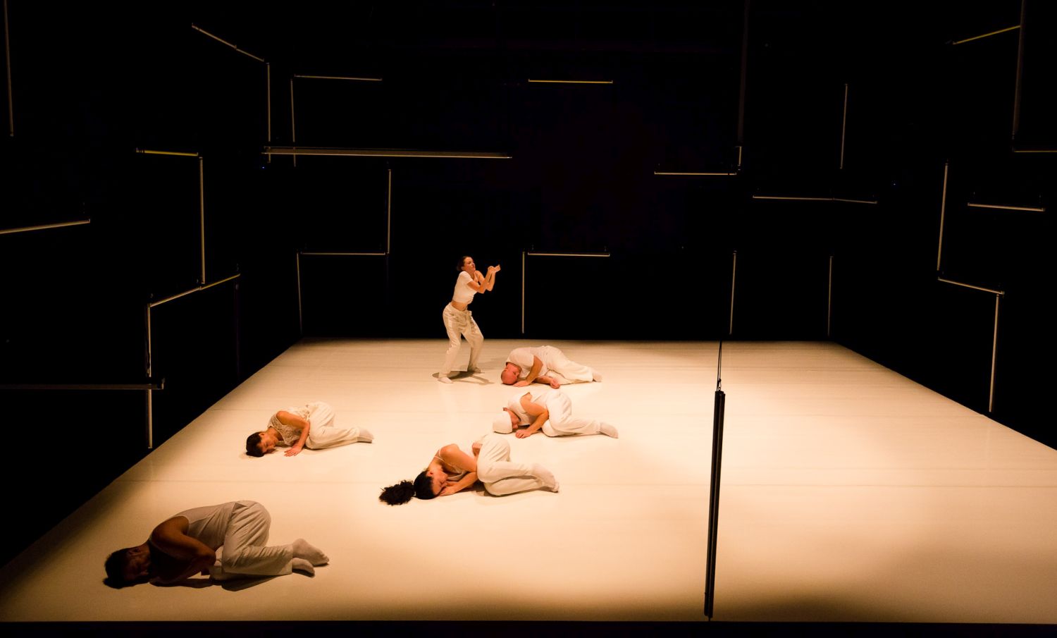 Șase actori dansatori excelent acordați de Andrea Gavriliu într-un artist-corp perfect, un instrument muzical uriaș cu coarde (vocale!), ciupite întru armonică de un sextet plutitor-compulsiv, un corp ca o cutie de rezonanță în care se mișcă precis fiecare sunet ce-i împlinește clar fiecare gest, un corp târât prin cotidian și tras de urechi cu o mână, în timp ce cu cealaltă îi freacă arcușul de abdomenul plat, îmblânzindu-i coardele până la Elvis (!) într-un regal de sunete, unde și vibrații trimise către Univers (bravas Mihai Dobre!) și întoarse ca un boomerang în corpul ăsta vibrant în care au fost propagate anume pentru a fi tălmăcite pe scenă.