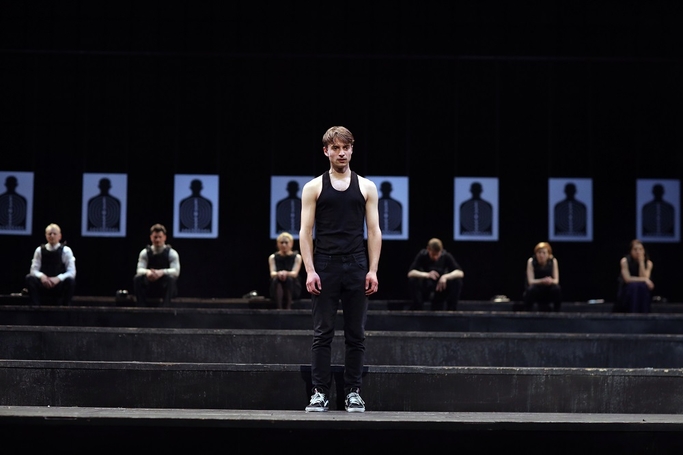 Foarte interesant folosit tot spațiul scenei Mari a Naționalului, ce beneficiază pe deplin de complicitatea scenografei Velica Panduru și directorului de imagine Marius Panduru, ce pun la cale memorabile tablori teatrale, la care tot să ai de privit, de la încărcatele scene de teatru rus din casa plină de obiecte, cu tavan jos, ori cea în care actorii sunt aliniați în spatele unei mese lungi ce asigură, pe rând, prim-planul sub candelabre pentru elementele precis extrase și prezentate publicului, și până la cele scăldate în lumina ledurilor dispuse dreptunghiular în jurul oglinzilor de pe măsuțele de machiaj ce se ridică aliniate din trapă (să nu ne lase să uităm de provizorat, că sunt doar cu toții artiști în continua audiție și trăiesc dramele necesare acestei condiții, fiecare actor și în propria existență, supusă oricând pericolului unei schimbări iremediabile de traiectorie și de sens, un comentariu în sine al faptului că totul e temporar, efemer, că se poate întâmpla oricând orice de aici din cabine până acolo, sus, pe scenă). De departe cele mai puternice rămân cele rezervate tăcerilor, spațiile imense, goale, frumos luminate și exploatate fonic pe negrul scenei pentru a articula forța și dinamismul unor monologuri ori scurte dialoguri, în care se performează fără obiecte, fără costum (!) ori chiar fără personaje (țintele ce marchează poligonul de tragere), din vreme în vreme anume incomodate de proiecțiile de pe fundal ori de pe ecranele coborâte pentru portretizări efemere, autentice (deseori eliberate de preocupări estetice, filmărie de aproape aducându-le în vizualul deformator al camerelor de telefon din zilele noastre, mult prea aproape de chipul zugrăvit, de care fuge de obicei toată lumea ca să nu-și etaleze defectele), dar și pentru citate cehoviene și mici comentarii jebeliene pe marginea acestora.