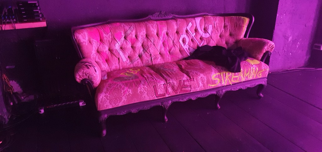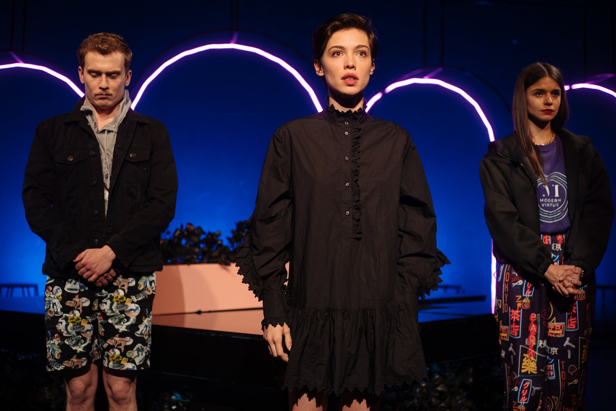 O miză uriașă pe o temă foarte serioasă trimisă intenționat în banal, cu suficientă detașare și chiar cu destul umor ca să o putem digera, într-un vizual minimalist, aproape schițat de scenografa Alexandra Panaite în contururi de neon (care asigură, prin schimbarea culorii luminilor, dinamica necesară, deloc obositoare, pentru a delimita spațiile de video-chat ale celor patru vloggeri, pentru a face trecerile de la o scenă la alta – nu foarte bine gestionate prin alte mijloace de avertizare care să acopere lipsa de cursivitate ce rezultă din fragmentarea poveștii prin timpul necesar schimbului de costume și logistică -, și pentru a creiona atmosfera LIVE-ului, ca un concept vizual lait-motiv al întregii montări – cuvânt scris și pe canapeaua managerului -), reflectate inteligent în blatul lucios al mesei/mise en scène-i vlogului/catafalcului Marei, ce-i asigură adâncime în alte dimensiuni, în oglindă, într-o prelungire tristă și nepăsătoare a lumii-spectator la acest râs tragic, isteric și sarcastic deopotrivă, un strigăt de disperare peste doliul ce se va ridica de sub tot negrul ăsta care i-a asigurat altădată strălucirea.