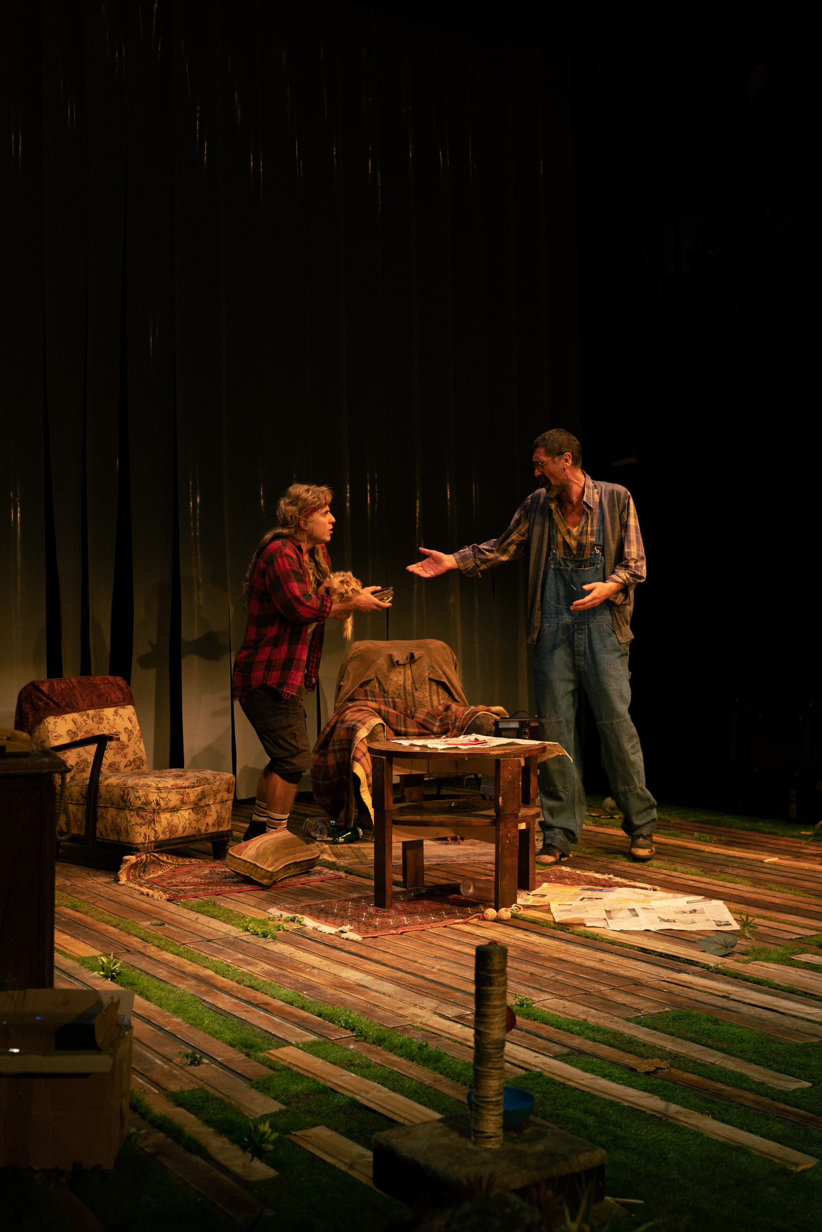 Furia lui oarbă se îndreaptă precis împotriva tatălui său Donny (un credibil vulnerabil Vitalie Bantaș, ce-și stăpânește cu umor personajul mucalit, disimulant, uneori fals speriat, alteori resemnat ori puternic și determinat, toate fără niciun fel de stridențe, undeva în limitele autocontrolului precis dobândit de-a lungul numeroaselor expuneri la violențele fiului), care s-a dovedit prea puțin responsabil de această dată, și un cunoscut al familiei, un foarte fragil emoțional Davey al lui Andrei Brădean (bun biciclist și dansator!), atent condus și el prin nuanțele infinitei naivități pe care o presupune personajul, suspectul principal al săvârșirii omorului pe care lipsa de vigilență a tatălui l-a făcut posibil.