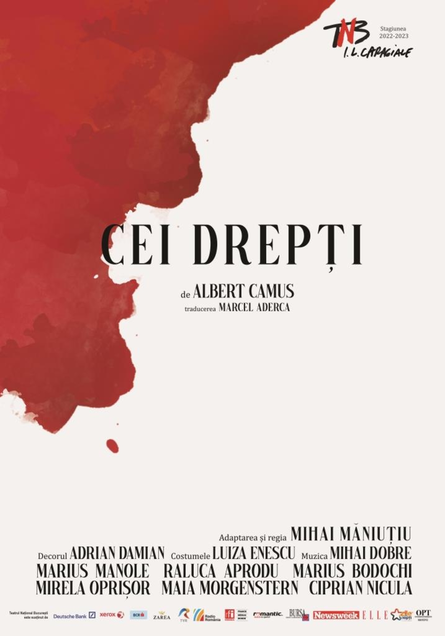 O poezie a revoltei imaginată de Mihai Măniuțiu în complicitate cu Adrian Damian și Luiza Enescu (fermecătoare povestea scenografică, un vizual de mare valoare în sine, purtat cu pricepere și coerență în costume, ce potențează lirismul dur al narativului) pe scena Sălii Pictură a Naționalului bucureștean. Povestea existențialistă din spatele unui asasinat, strunită adecvat de Mihai Dobre, care-i îmbracă atent în sunete stridențele cât să nu-i scape vreodată din mână (păstrând surprizele acusticilor ample pentru a unifica inteligent zgomote din tumulturi diferite), dându-le fiecăruia dintre personaje răgazul necesar de a-și premedita, a-și lansa, a-și accepta și a-și aprofunda acțiunile, toate în ideea formulată de eroii camusieni că până și-n distrugere există ordine, există liniște. De această dată teatrală, la toate nivelurile.