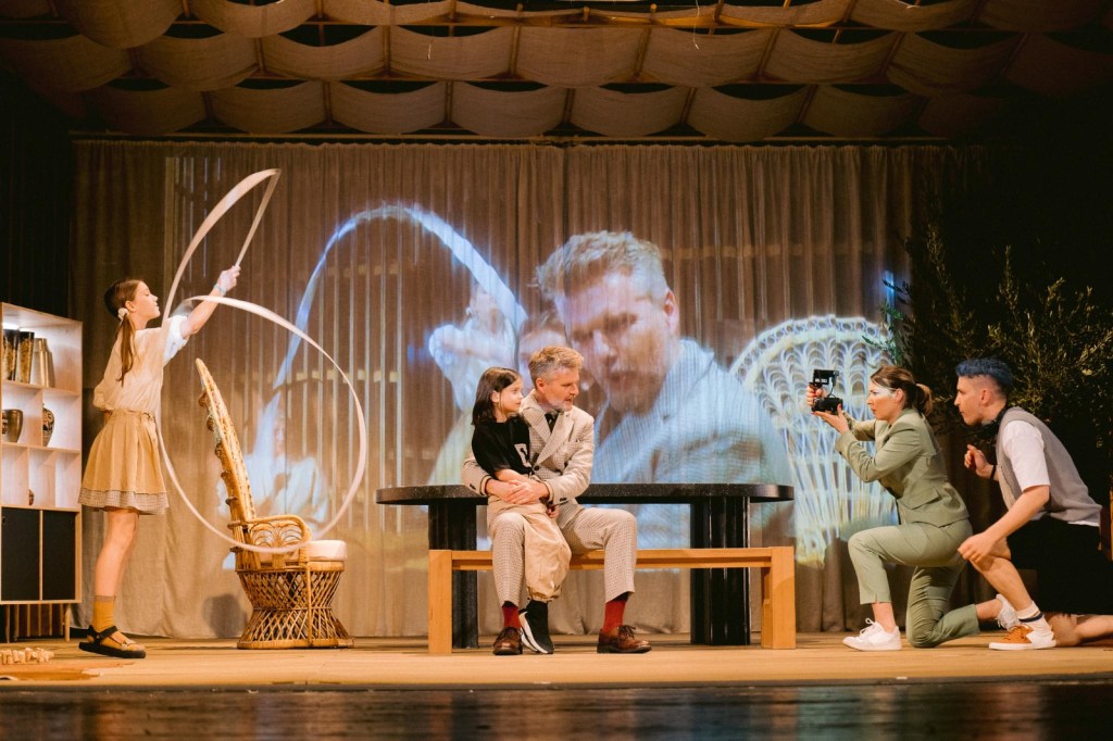 Printre interviuri, știri TV și conversații pe videochat, captate de tot felul de dispozitive multimedia și proiectate pe fundalul scenei, ținând-o mereu în frâiele actualului și recognoscibilului, printre basme, incursiuni mitice și jocuri familiale, cât să mai treacă din timpul ăsta groaznic petrecut împreună de niște eroi damnați la o izolare de rit nou, în care sunt nevoiți să-și construiască cu grijă tragediile cât să fie extras din ele tot ce e nevoie pentru a vorbi despre rolul femeii în societate, este adusă în față o excelentă Antigonă-narator, foarte bine condusă de Hana Selimović, amfitrionul tuturor festivităților și ceremonialurilor găzduite de cetatea Tebei. Confruntată violent cu traumele ce i-au marcat familia și viața, povestite inteligent în capitole de sine stătătoare, pe înțelesul tuturor, spre a-i clădi pertinent un background solid pentru sacrificiul la care a purces și cauza pe care continuă să o susțină chiar și după moarte, Antigona se lasă purtată deștept între epoci și teme, asigurând buna înțelegere a miturilor, dar și predarea de ștafetă către noua generație. Atunci și acum devin doar niște accesorii temporale insignifiante pentru subiecte care-și dovedesc cu prisosință actualitatea și necesitatea abordării lor pentru a vindeca traumele de ieri și de azi.