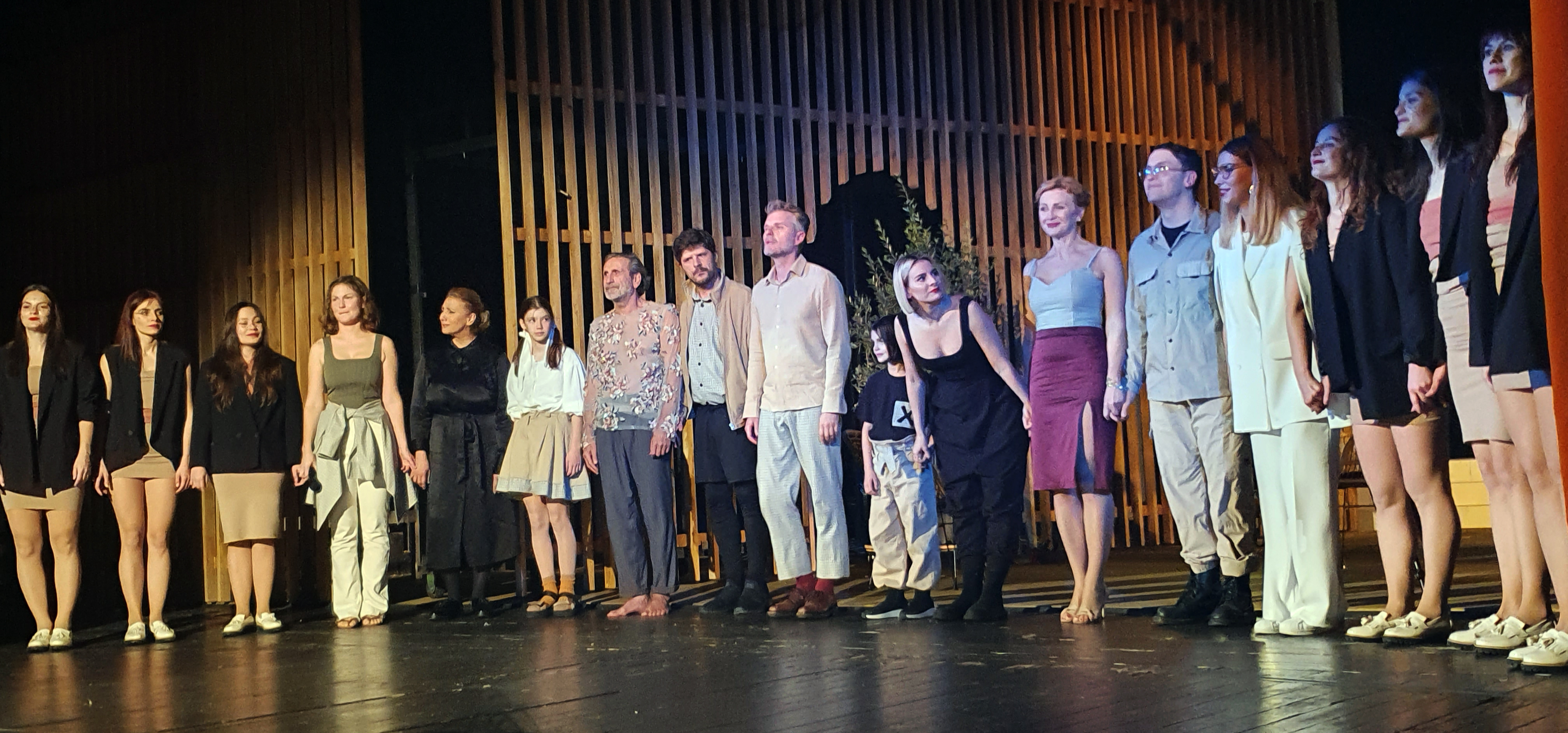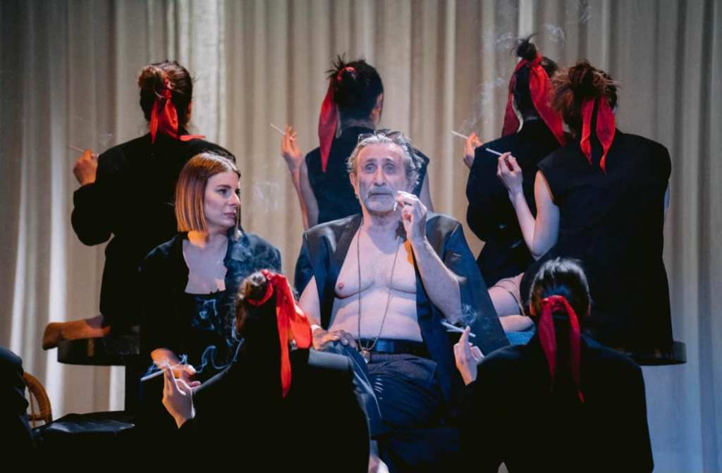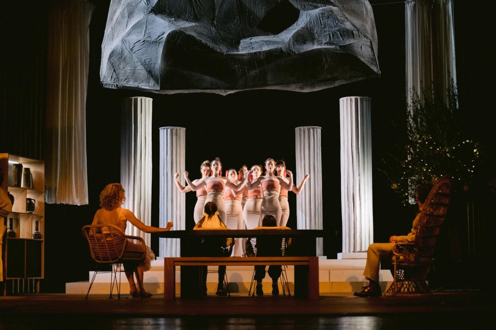 Și-n tot Sofocle-ul din jurul familiei lui Oedip sunt băgate mereu bacantele lui Euripide (Aleksandra Pejić, Danica Nikolić, Katarina Bradonjić, Mina Pavlica, Ivana Pančić, Simonida Mandić), care vrăjesc minunat la spectator (mai ales în episodul de teatru în teatrru, cariatide în mișcare ce-și însoțesc arabescurile executate de trupurile preschimbate în statui printr-o deșteaptă idee de costume!) împreună cu păsările ce se învârt pe deasupra și croncăne taman azi peste pomul vieții, cântând în vârf ce i se întâmplă la rădăcini. Menade dintr-un cortegiu de sine stătător, apărând savuros spiritul lui Dionisos, niște nimfe cu furie mistică și mișcări deștepte de dans contemporan, excelent antrenate de Andrea Gavriliu, care deretică prin casă, așează masa și se țin de serbări la aniversarea lui Oedip, susținând cu umor cauza feminismului și îmbrăcând în ritmuri inteligent alese de Adrian Piciorea toate motivele tragice din care își extrage seva. Doar ca Ismena (fata bună, perceptivă și naivă că, deh!, e rac! a unei actrițe cu mișcări suave și voce de înger, Sonja Isailović) să-și poată lansa liniștită mai apoi ultimul album, într-o eră în care femeile s-au obișnuit deja cu puterea și știu să o folosească în slujba mai binelui și armoniei, pentru care încă mai continuă să lupte. Însoțind abil trilurile păsării ce cântă metafizica disperării din plânsul Antigonei, pe care-l aud și îl împărtășesc celelalte femei care invadează cetatea, prevestind schimbarea pe obrazul ce încă mai caută să-și curețe pata socială.