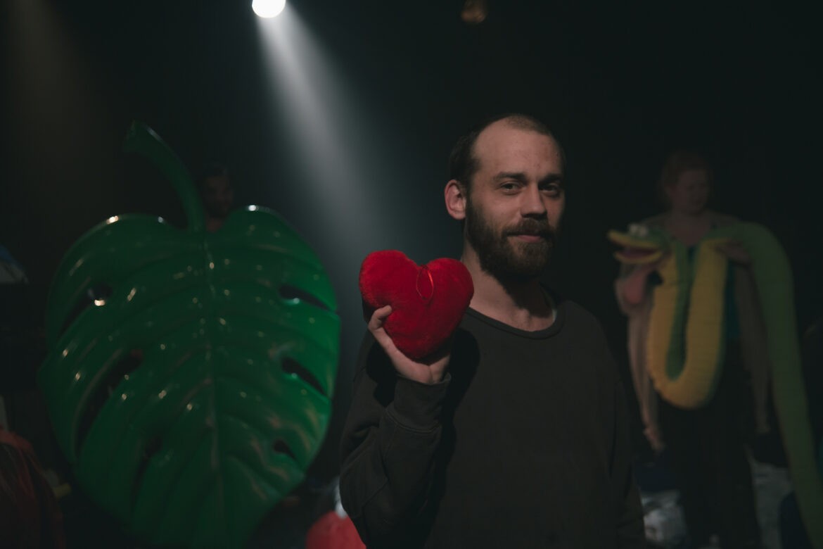 Și în toți cei marcați de astfel de amintiri de familie, cu iubirea lor cu tot. Adonis Tanța, cu farmecul deja cunoscut, reușește să facă și aici, ca în fiecare poveste-puzzle cu care are de-a face în acest tip de spectacol, o confesiune emoționantă despre iubire, așa cum arată ea rostogolită prin familie, cu care înfășoară atent amintiri despre dragostea primită de la cei dragi, mai ales de la mama (impresionant și în scena despre iubirea maternă care o are în prim plan pe Andrada Balea, poate o fată care a învățat prea puțin despre afecțiune!, așa cum va dovedi în monologul prinzătoarei de păr), culminate cu scena spălatului confesional pe cap, pe emoții și pe gândurile pe care pare că le aude mai bine șoptind în liniștea tocmai construită. Despre o iubire dinăuntru, pe care o poartă apoi mândru pe străzi, printre toate dovezile de iubire pe care le culege cu grijă Cătălin Filip, hoinărind emoționant pe căile cele mai bătătorite, la ora la care ele au devenit pustii tocmai ca să se audă mai bine ecoul iubirii. De la pupitru se anunță tablourile 10-14, petrecute între pereții plini de vibrații ai clubului, unde și-o fi descătușat toată tensiunea acumulată până acum și o fi reușit să-și verse prea-plinul. Ca să facă loc poveștii naive a Degețicăi contemporane (a delicioasei Alina Mișoc), care are nevoie de timpul, grija, protecția și atenția celorlalți, pe care le primește din plin în chipuri nebănuite, ce vor stârni și ele hohote de râs. Puțin înainte să primească în freză pumnul dulcegăriilor special pregătite de Octavian Voina în scrisorile schimbate cu iubita lui din liceu, păstrate la loc de cinste în colecția de corespondență de dragoste. Între ele se va remarca și ultima scrisoare a Nadejdei Iakovlevna Mandelștam către iubitul ei Osia (Iosif), care va aplica pumnul în plex și va așeza lacrimile la locul lor, stabilind supremul preț pe care-l poate un om plăti (Adonis Tanța…), cum îi șade bine oricărei iubiri care se respectă.