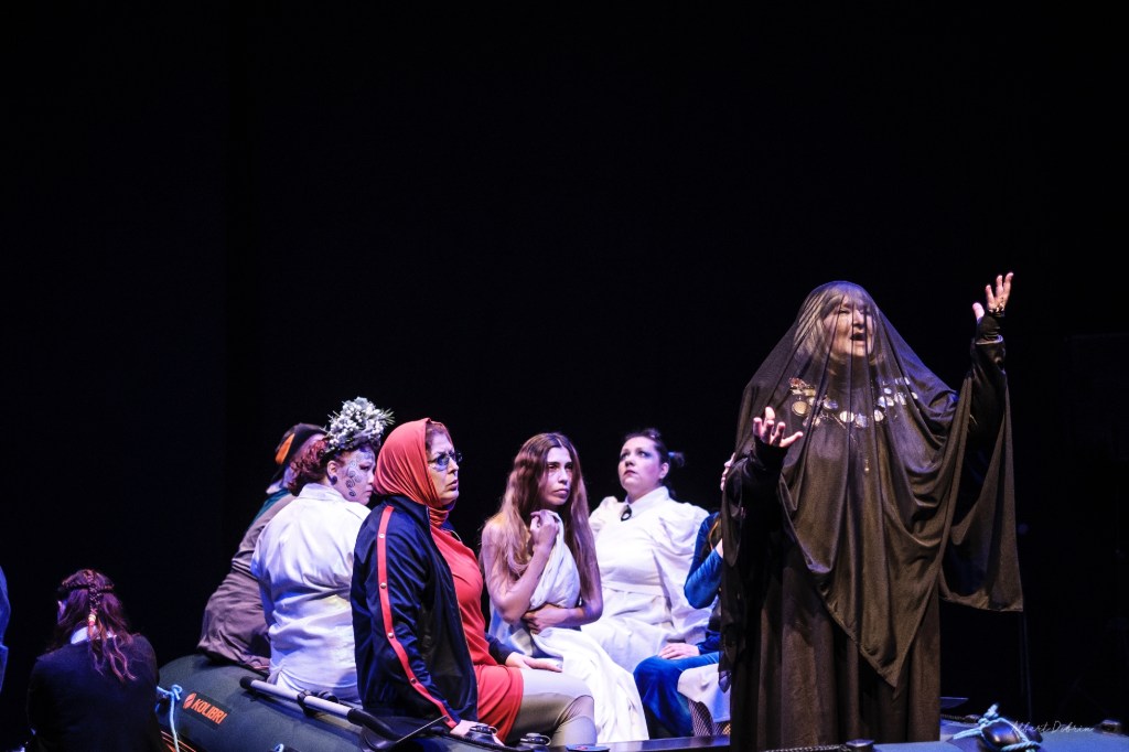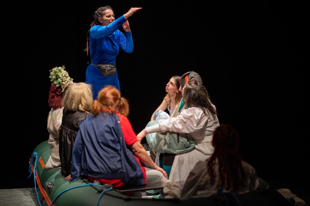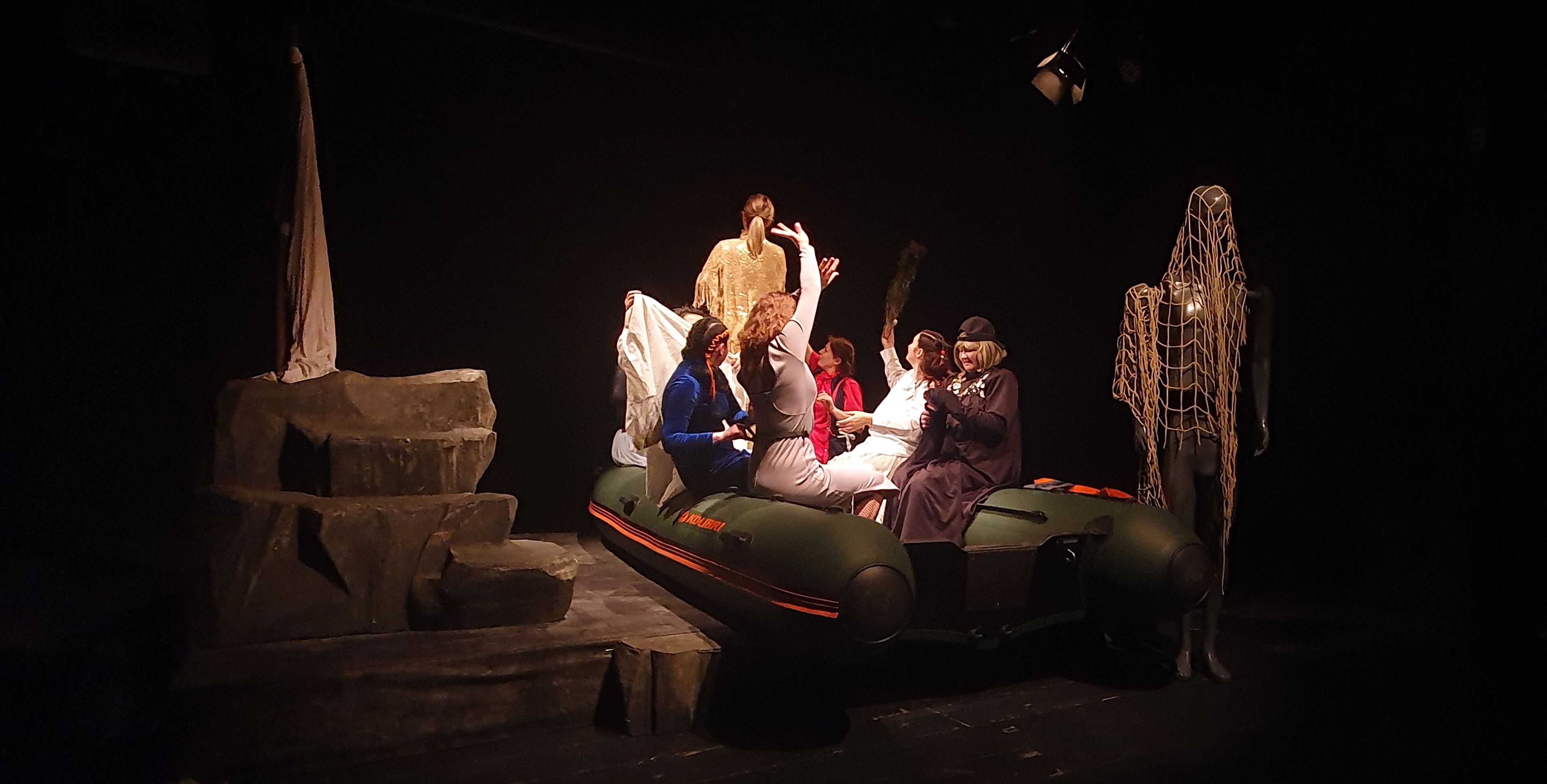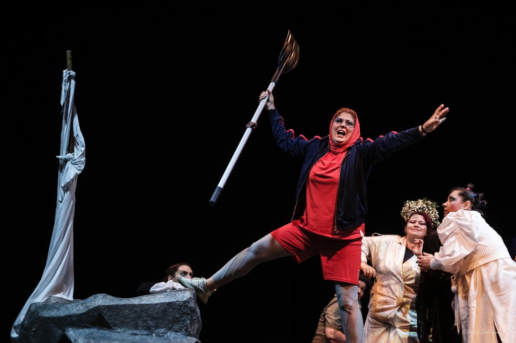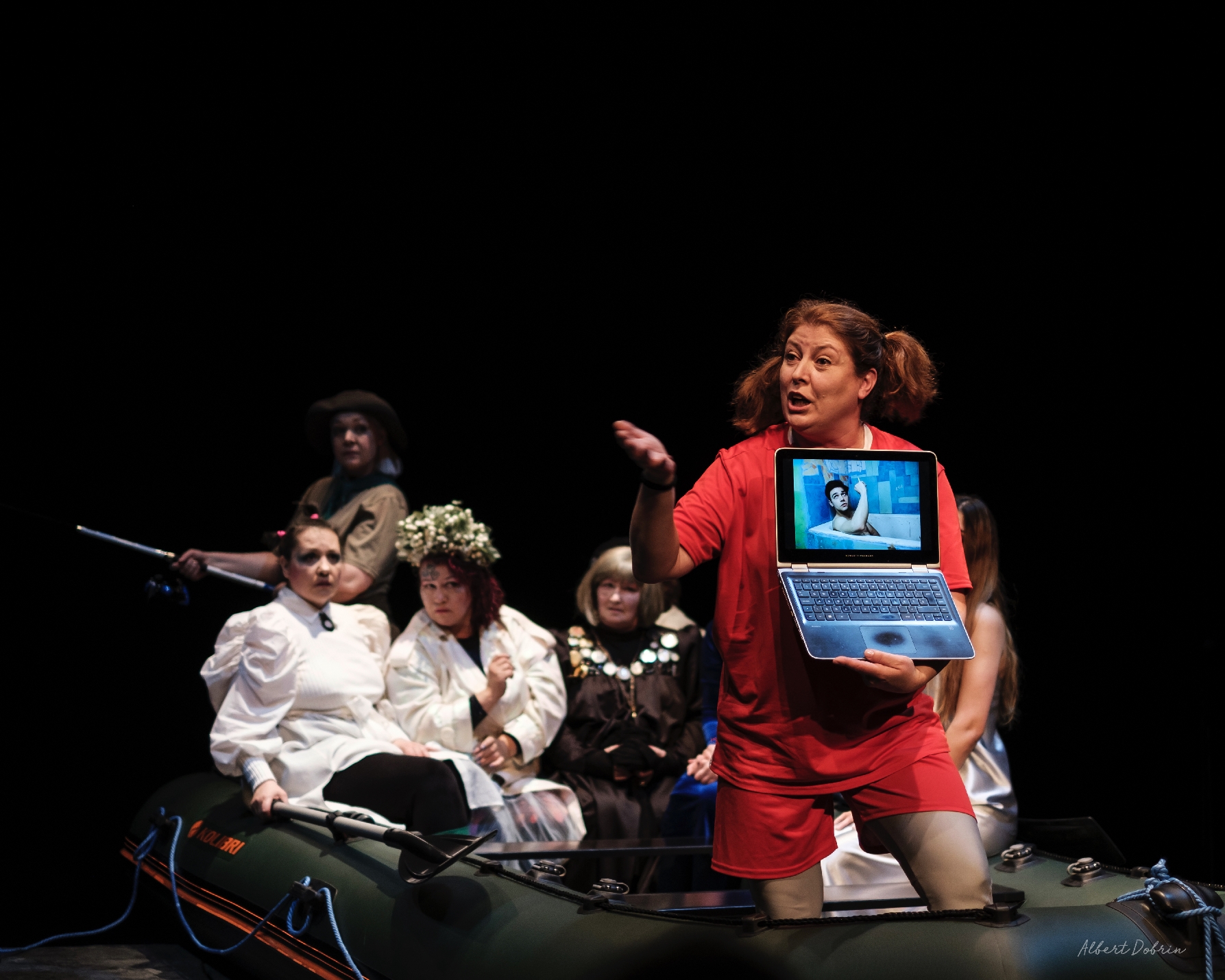 Așa arată feminismul de pe barca pneumatică sosită să o salveze pe Ariadna. De unde (după șoc) se ridică iar anticul, la polul cromatic opus, printr-o Penelopă păstrată îndurerată sub vălul negru al văduviei, femeia-lacrimă scormonind după iubirea pierdută prin cenușa Troiei, adresându-se resemnată lui Ulise. De sub vălul care-i acoperă fața, Crenola Muncaciu dă pertinent glas acestei Penelope, femeia care și-a urmat soțul împlinându-și destinul pe tronul ei de regină în Itaca, asigurând nu doar trecerea bruscă de la alb la negru, dar și mutarea abilă între vârstele femeii, deschizând calea tuturor eroinelor să-și adauge poveștile sub crinolina generoasă pe care o deschide abil poalelor feminismului pe care și le pot pune acum liniștite în cap.