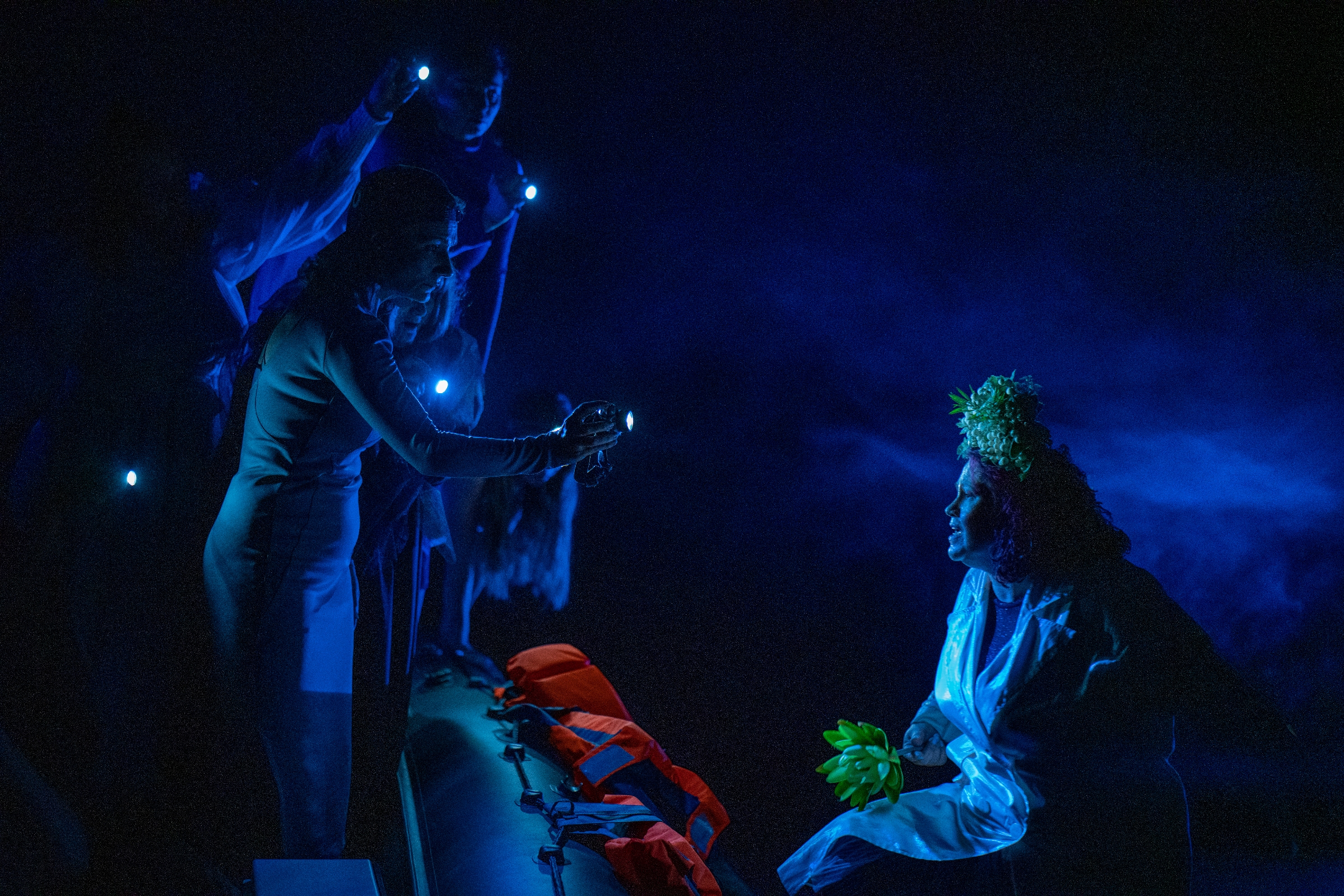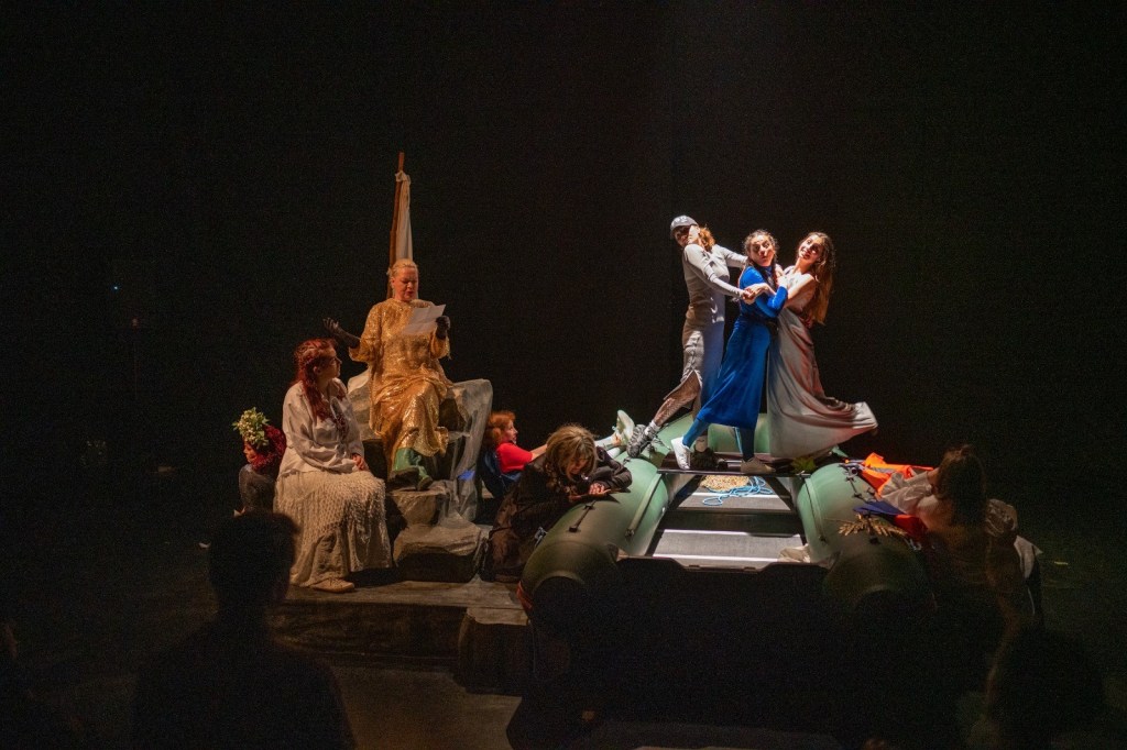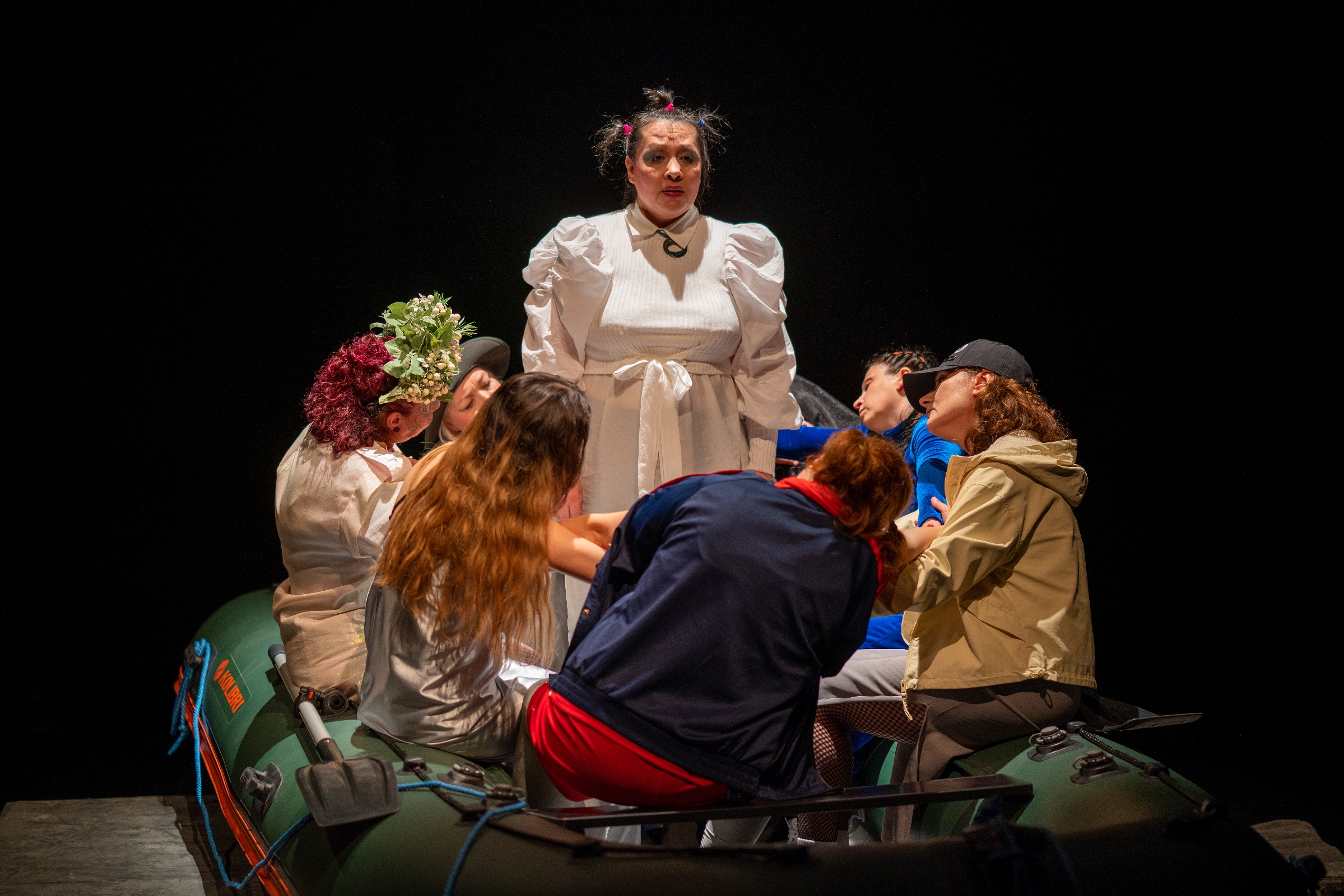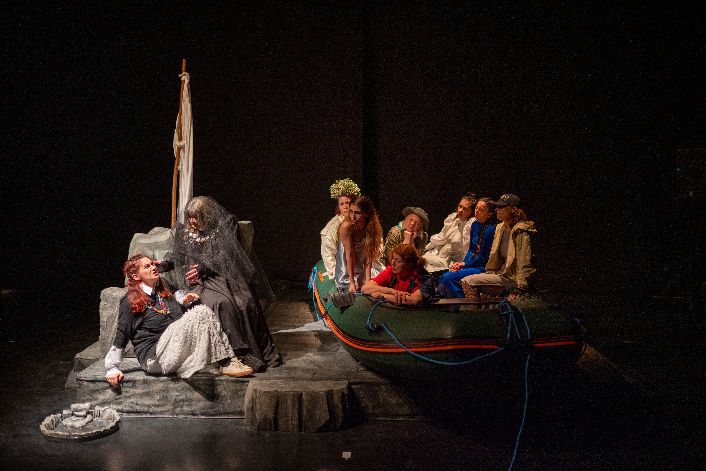 Un echipaj feminin de 8+1 la vâsle într-o barcă pneumatică. Kolibri. Înaintând îndrăzneț prin apele patriarhatului, sătul de atâta uitare și așteptare, doar ca să împingă lumea bărbaților înainte. Nimfe, nereide, naiade, driade sau chiar zeițe, totuna. Figuri feminine mitologice, Eroine vâslind cutezător prin istorie, iscălind cu rănile iubirilor nedrepte de care au parte scrisori de dragoste către bărbații lor, „eroii”.