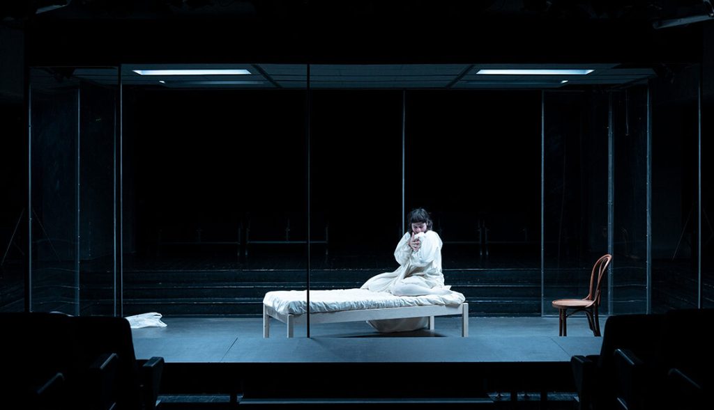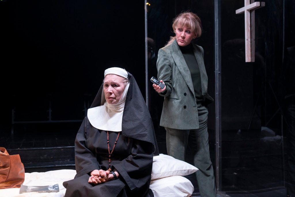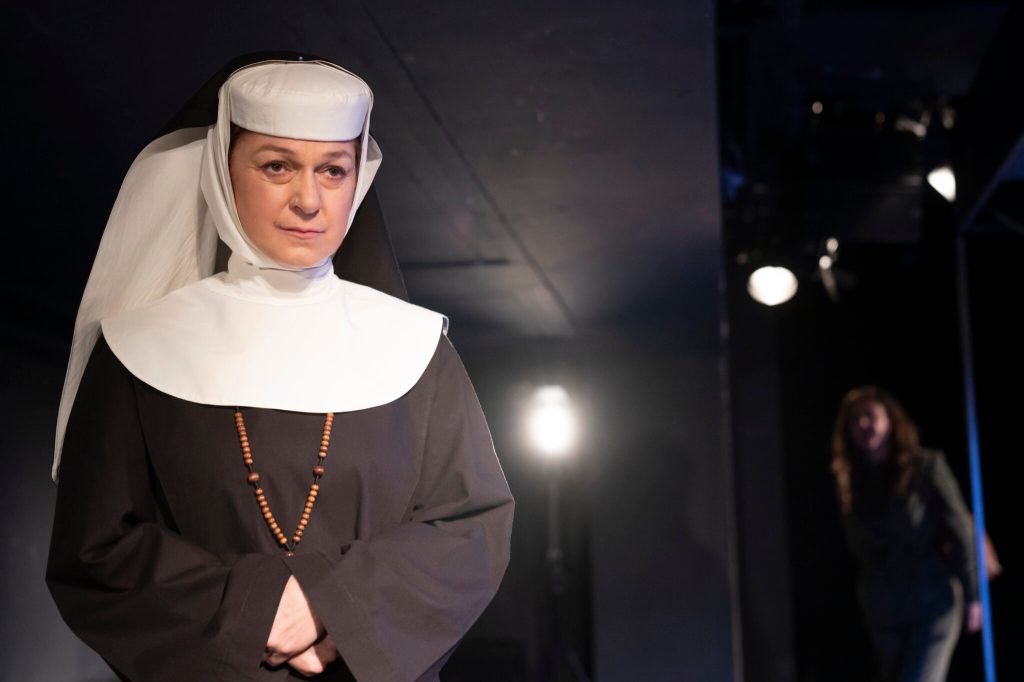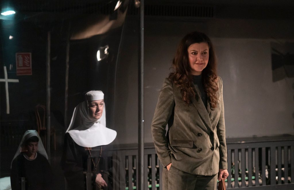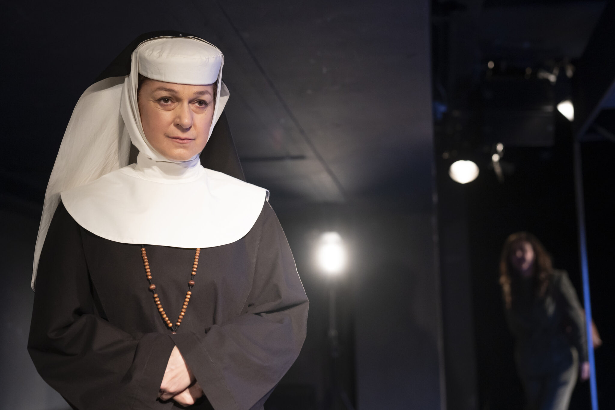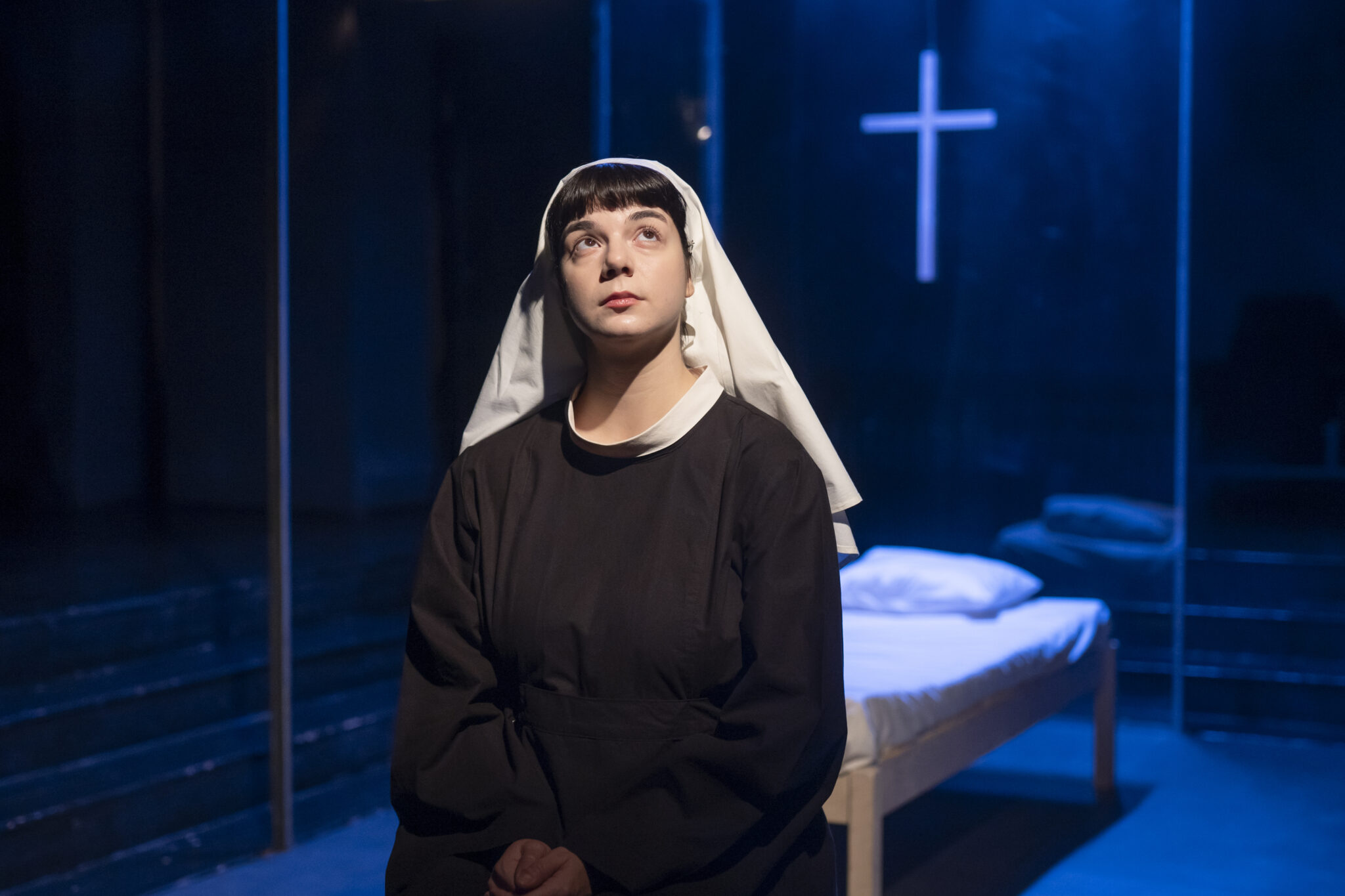 O ajută foarte mult și concentrarea acțiunilor ei într-un singur spațiu, un perimetru deloc generos fizic care-i imprimă un fel de stabilitate aproape intim-dumnezeiască, pe care regizoarea l-a impus iscusit în complicitate cu scenograful Valentin Vârlan: odaia lui Agnes, un acvariu din plexiglas cu deschideri generoase pe pereți, toți transparenți, ce păstrează intimitatea unei chilii (așa cum e subliniat și prin austerul propus) dar permit în același timp traversarea lui în toate direcțiile, fără a-i știrbi dimensiunea sanctuară, în timp ce publicul, așezat chiar și pe scenă în jurul acestui acvariu, se simte cumva dator cu un anume tip de respirație cu care să nu maculeze aerul sacru al acestei experiențe, personajele mișcându-se pe câteva culoare create printre spectatori, ceea ce contribuie esențial la senzația intimității împărtășite în spațiul mănăstirii, pe care doar costumele și crucea luminoasă îl anunțaseră inițial.