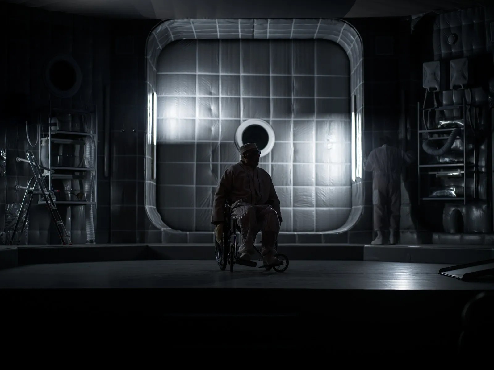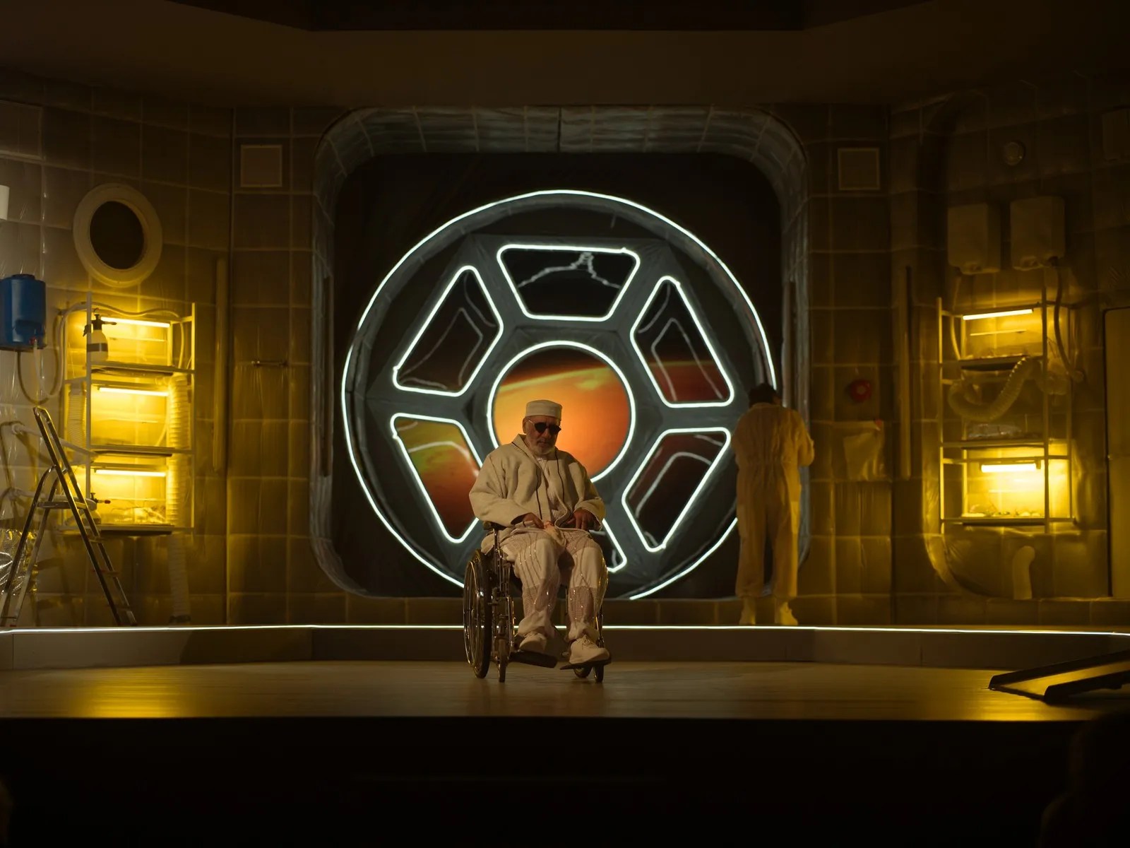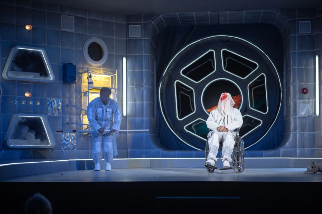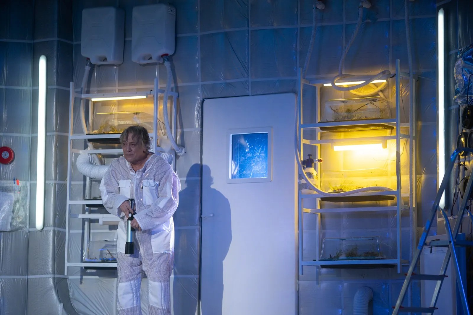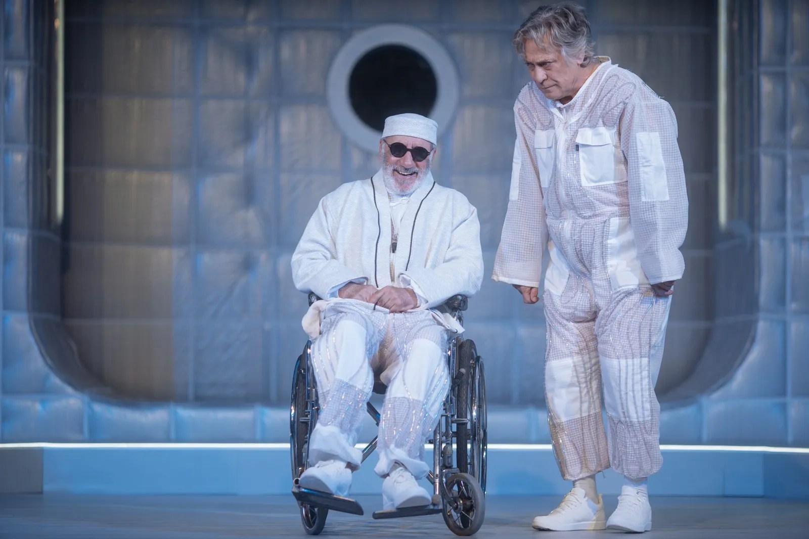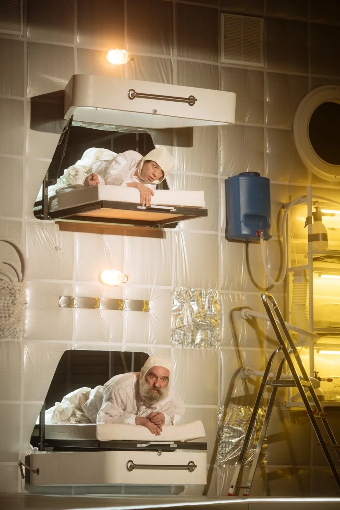 Degeaba încearcă să surmonteze, chiar cu umor, cu ironie ori sarcasm, condiția mizeră în care se zbat de cine știe când. Condamnați la ștergerea din istoria propriei umanități într-un capăt de Univers marcat de albul-spital-spațial (décor/costume) în care Adrian Damian le-a imaginat cu mult curaj sfârșitul, colorat vremelnic doar de lumina care pătrunde diferit prin cele două ferestre laterale ale acestei pseudoaeronave-ospiciu, un laborator spațial de supraviețuire în ale cărui acvarii de pe pereți se încearcă inutil cultivarea unor plante ce se încăpățânează să nu le mai promită vreun alt început, ei mai rămân o vreme agățați de insula suspendată pe care mai pot fi admirate numai prin lunetă ultimele semne ale trecerii omului pe pământ.
