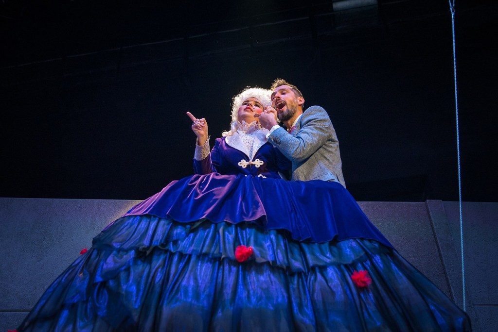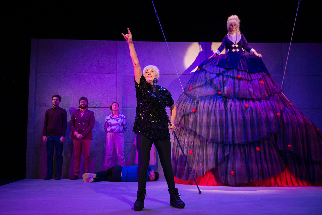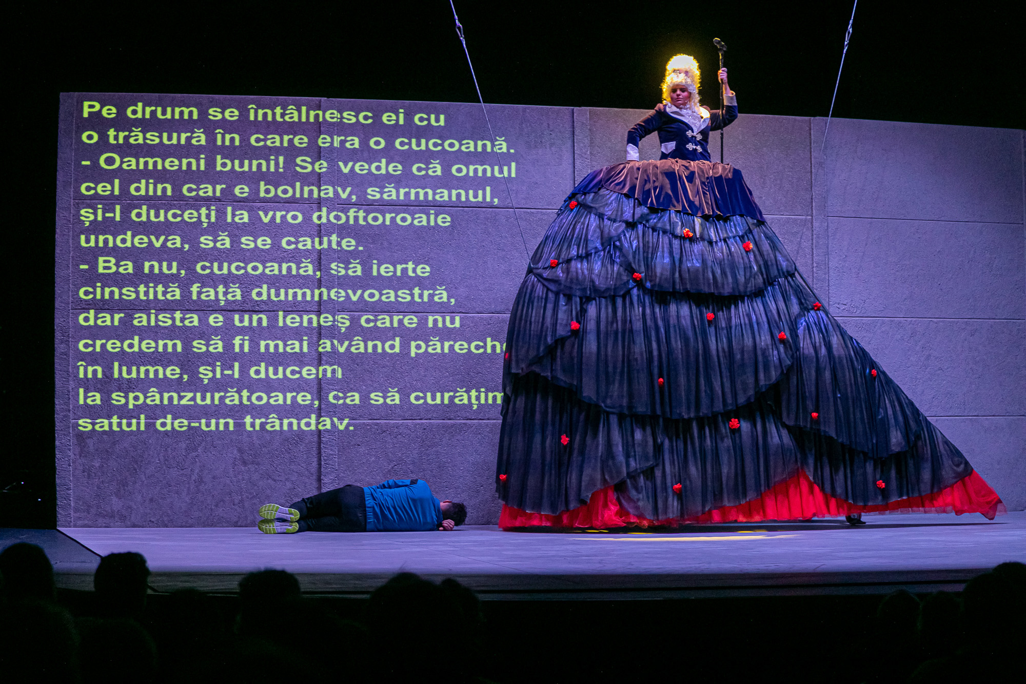Nu oricum. Ci chiar prin complicitățile celor în diverse grade sătui, minunat caricaturizați în ambele extreme ale ierarhiei puterii. În fruntea lor e așezat impunătorul personaj despotic, încredințat foarte inspirat Ruxandrei Maniu, care-l strunește autoritar-sarcastic prin scenă, augmentat spectaculos vizual (cocoțat în vârful costumului imens care îi îmbracă impetuos obrăzniciile, răutățile și aroganța, ce te și miri cum încap cu toate în trupul mic cu voce tunătoare, urcat întru compensare pe o scară înaltă pe post de prăjină cu care doar ea își poate ajunge la nas – bravas, bravas Mihai Păcurar!) anume pentru a fixa relații clare de putere.