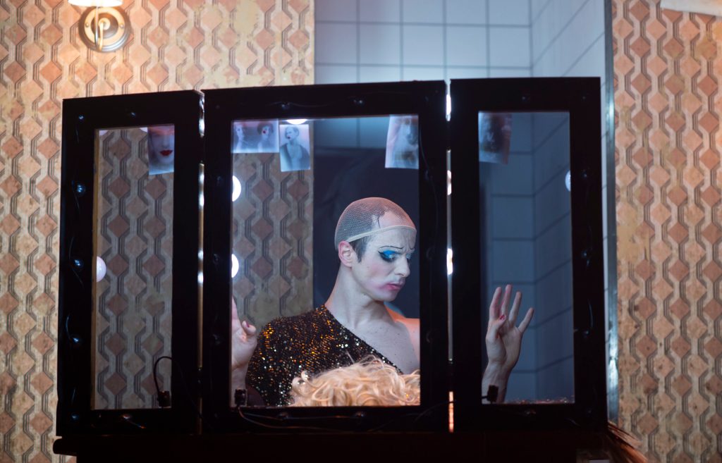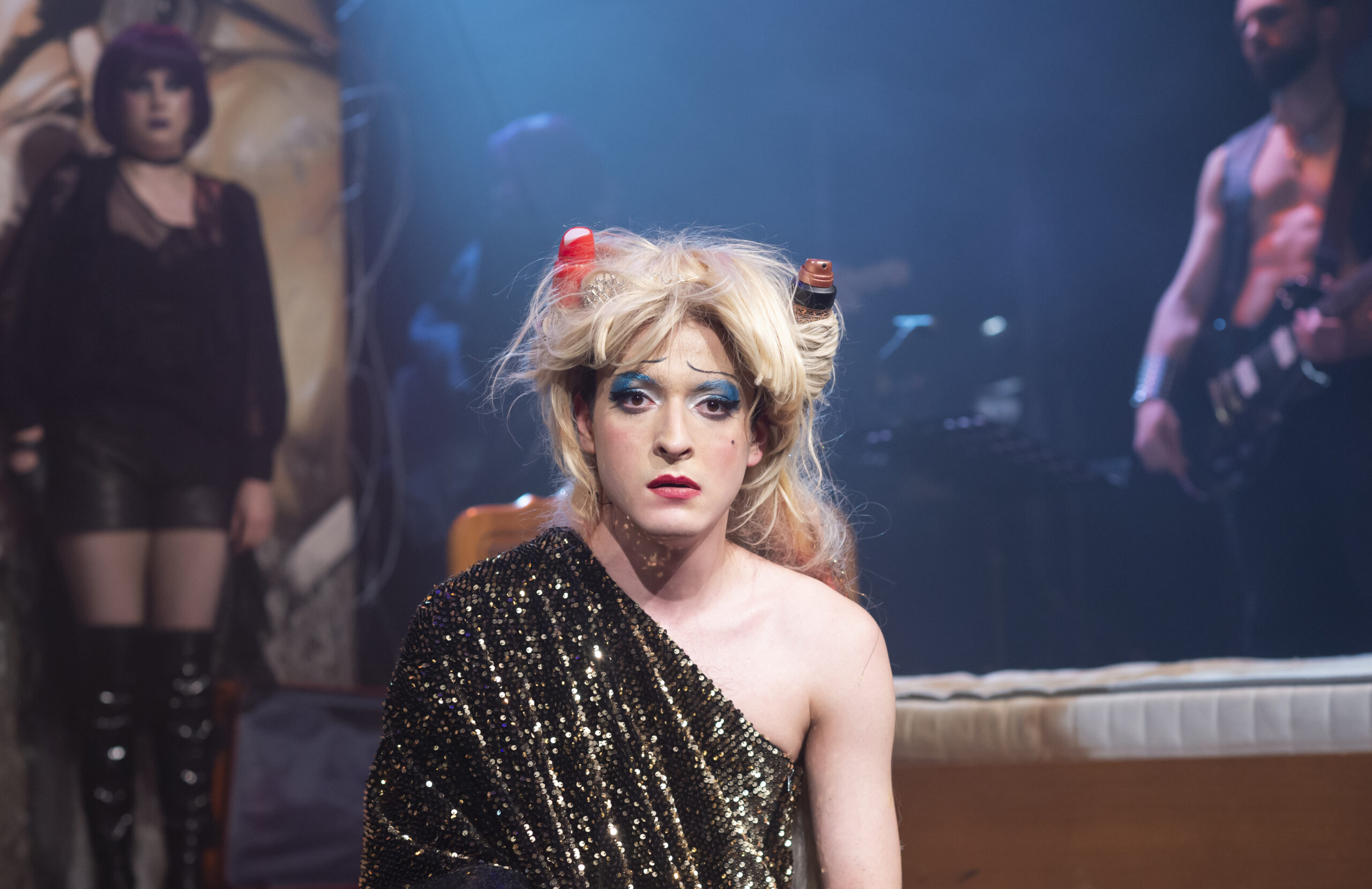 Destinul lui stă mereu la umbra marii industrii a showbiz-ului, căreia Adriana Grand i-a imaginat în spate un spațiu imens și gol, foarte generos în economia scenei, puternic luminat și învăluit în mister cu ajutorul fumigenelor, un tărâm magic de nepătruns (în ciuda încercărilor repetate ale lui Hedwig) mărginit de zidul protector ridicat în fața pericolelor succesului care amenință orbitor din spatele lui (al Berlinului/indifernței/stadionului/etc.) greu de accesat sau escaladat. A cărui strălucire rămâne amenințătoare, mereu aproape și totuși atât de departe, păstrându-l pe Hedwig și band-ul lui „The Angry Inch” la periferia marilor evenimente muzicale, înghesuindu-l dinadins aproape de marginea scenei, într-un spațiu strâmt și sărăcăcios al fatalității, al neputințelor, al derizoriului, într-un decadent laborator artistic de tip rulotă în continuă mișcare prin epoci și prin năzuințe personale (asigură coerent vizualul în fiecare dintre momentele invocate), ce-l impinge parcă pe Hedwig pe drumul către înainte, făcându-l să-și dorească mereu mai mult, să-și depășească sau măcar să încerce să mai îmblânzească din mizera lui condiție de artist marginal.