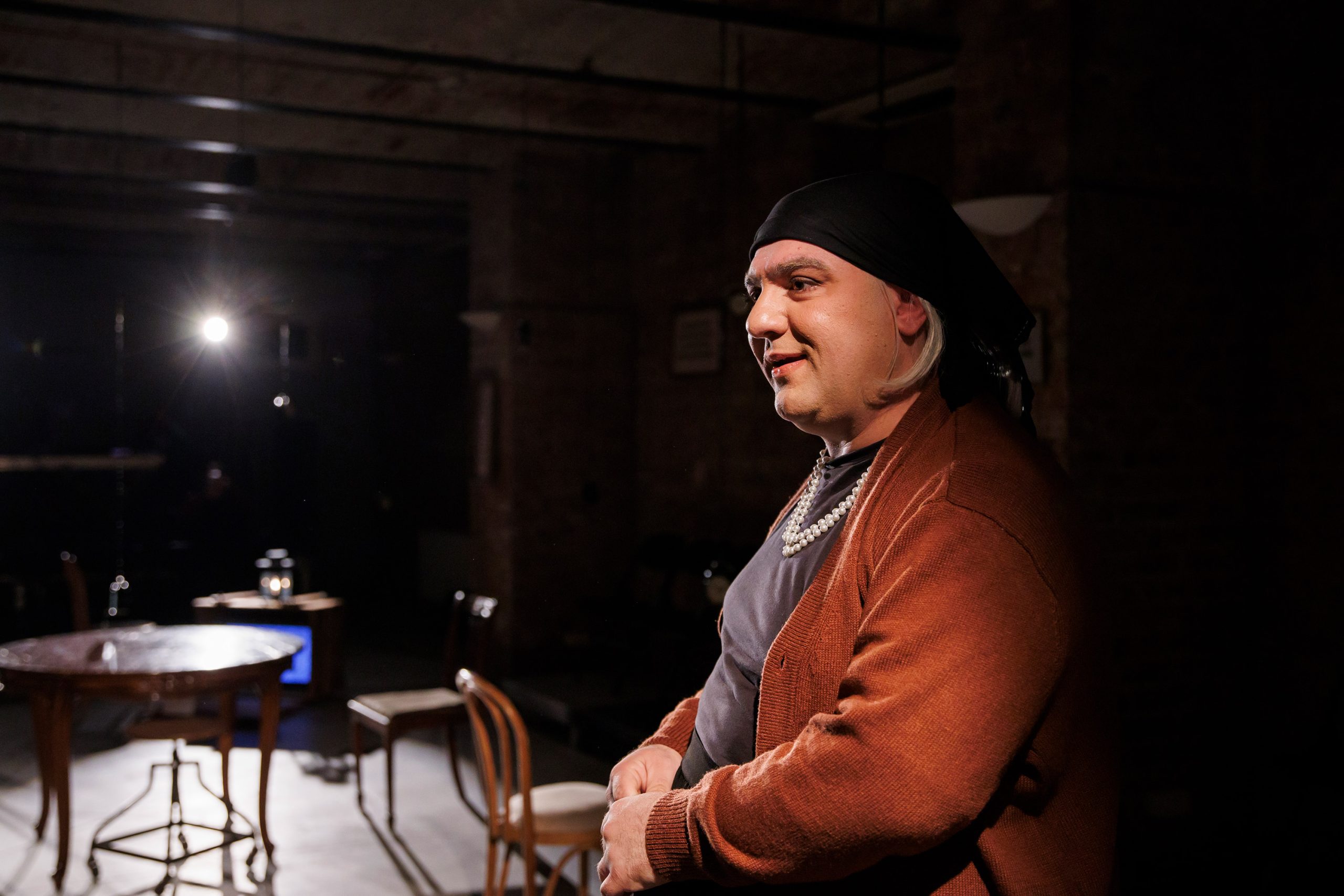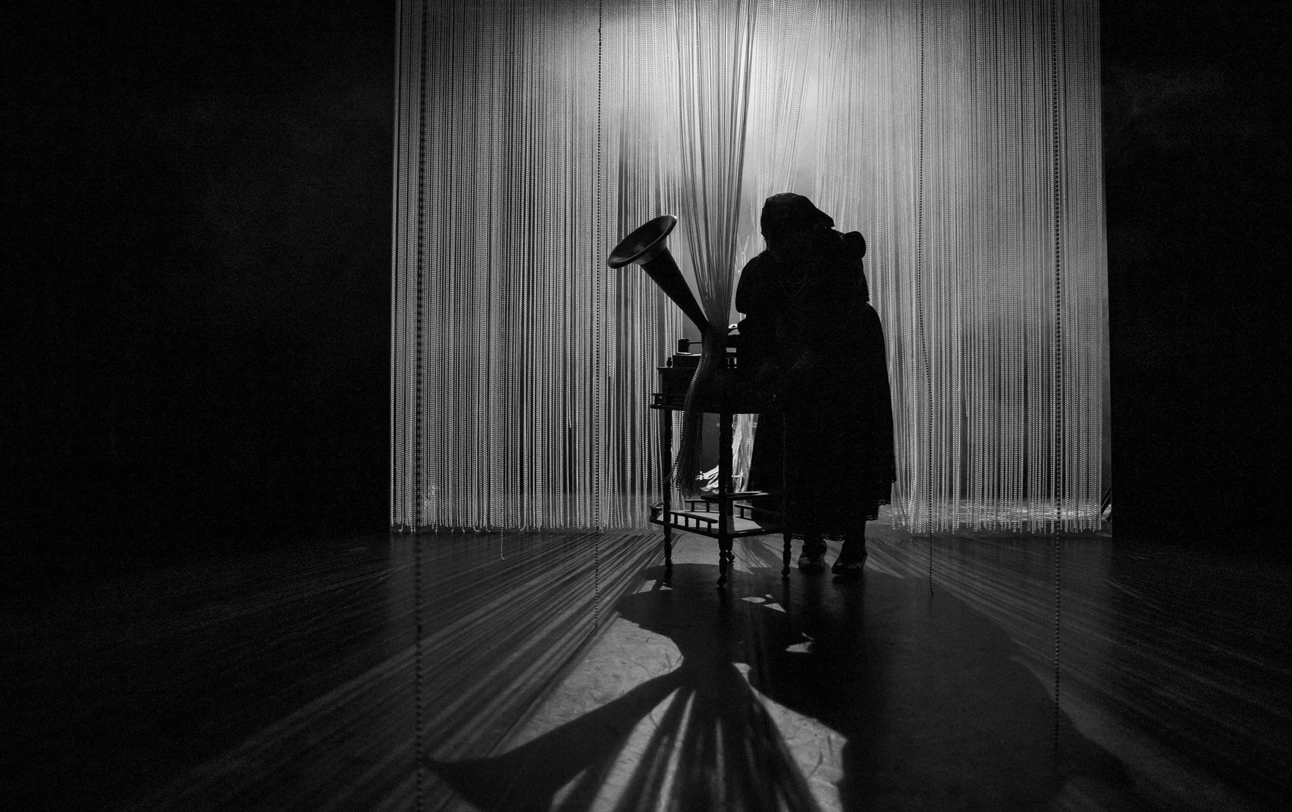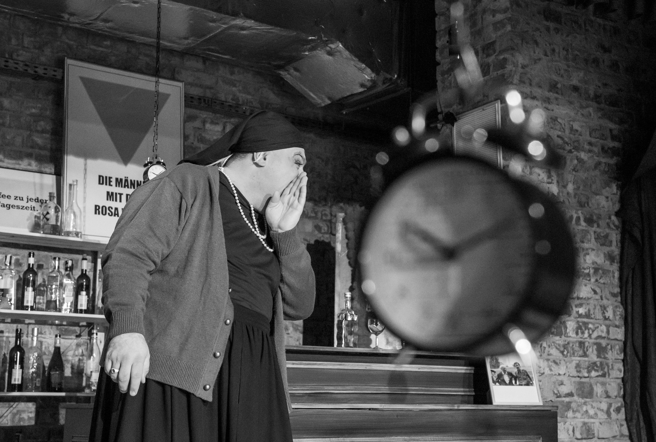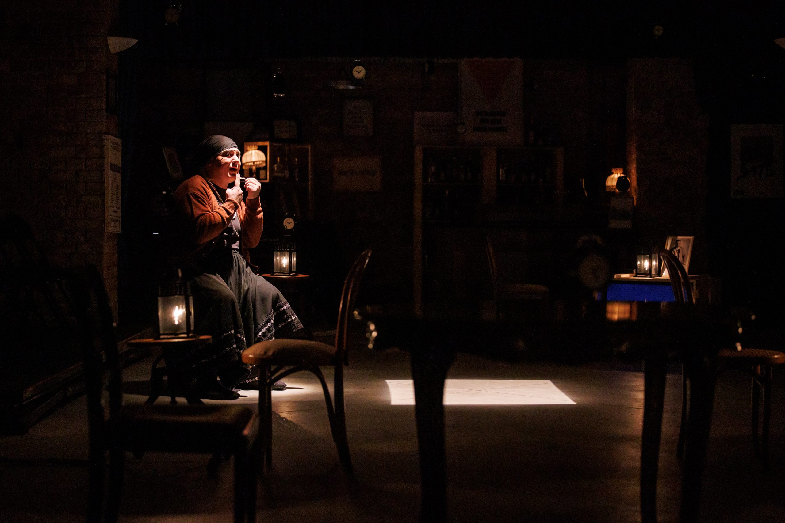 Excelente opțiunile de individualizare ale celor două spații de joc, cu miresmele Ioanei Pashca, care semnează pertinent scenografia și lighting design-ul, făcând mai întâi (sus) schița unui muzeu al amintirilor vivante, delimitat inițial de pereții de franjuri de perle asortate cu cele de la gâtul Charlottei, între care se ridică frumos colbul așezat pe cuferele de amintiri vivante, cu mobile miniaturale și instrumente muzicale vechi, extinzând apoi abil spațiul muzeal (jos, în pivniță) către un lăcaș al întâlnirillor de suflet, al iubirii și împărtășirii într-un club intim, prohibiționist, un loc tainic de refugiu, de autentic, de afirmare a identității și de libertate, fie ea și controlată, în care pot fi urlate în șoaptă, la lumină mică (minunat eclerajul în ambele spații), departe de urechile curioase ale autorităților (intercalate din când în când prin interogatorii), toate emoțiile cu care se confruntă tinerii tăcuți ai Berlinului dinspre partea de Est a Zidului, ce simt nevoia să-și facă auzită vocea sub oblăduirea blândă a Charlottei, care a pătimit multe ca să ajungă să-i adune și să-i lase să vorbească liber unii cu alții, și măcar din timp în timp preț de câteva ceasuri (din nou, excelentă ideea timpului limitat de ceasurile deșteptătoare!).