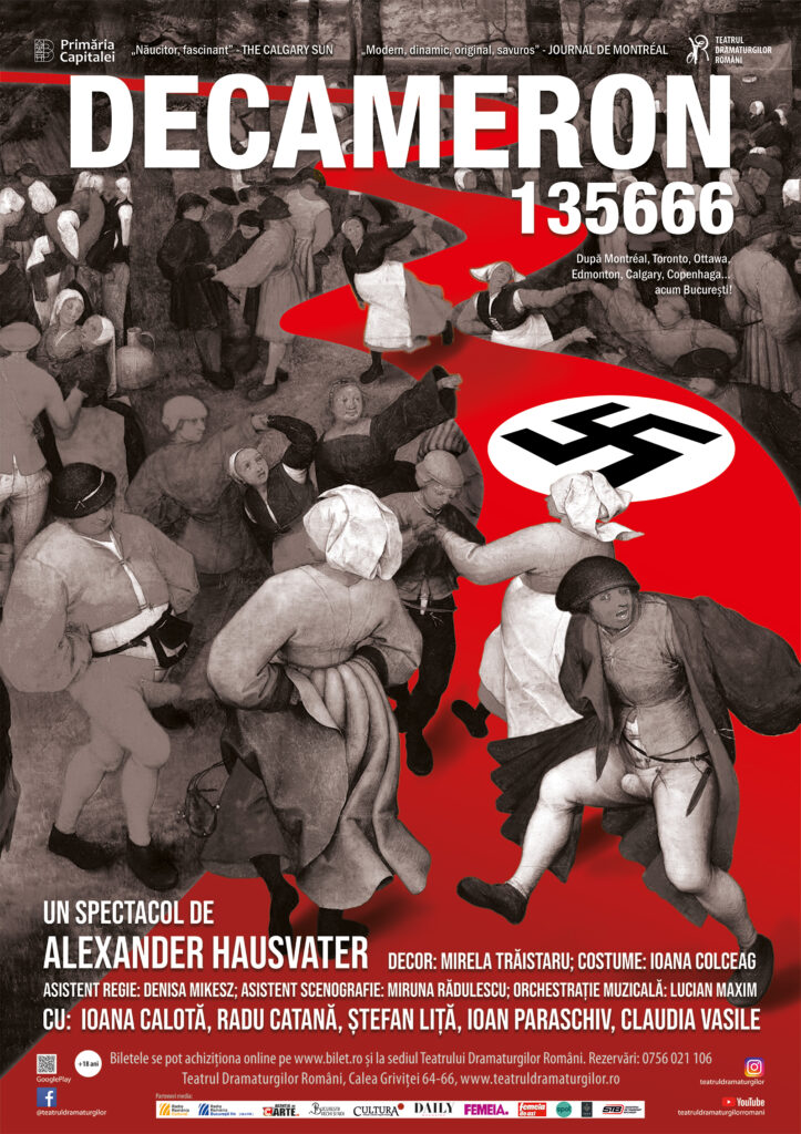 Așa ți se va arăta „Decameron 135666”, spectacolul montat de Alexander Hausvater după fragmente din celebrele povești ale lui Boccacio, un teatru cu sufletul la gură la comanda unui ofițer nazist pentru un public cu sufletul la gură la comanda unui cotidian post-holocaust, al cărui mental și vizual a fost puternic impregnat în ultimul secol de ororile celui mai important act de cruzime din istoria umanității, ce nu se va putea șterge curând din emoționalul nostru.