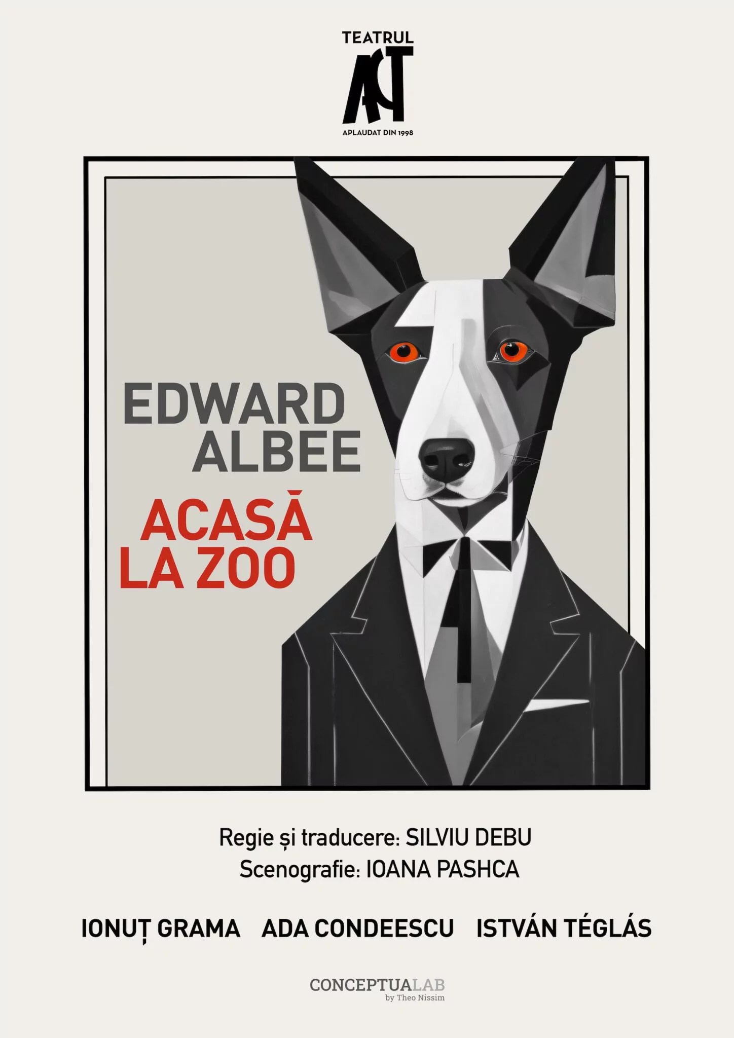 Așa arată „Acasă/La Zoo” montat de Silviu Debu la Teatrul Act după textele lui Edward Albee, care combină „The Zoo Story” din 1958 cu piesa într-un act „Home Life” scrisă în 2004. Un spectacol de actorie în care lucrurile se înalță teatral din textul rostit, într-un conversațional abil ticluit și strâns fedeleș între gratiile cuștii unei căsnicii rutinate de Ionuț Grama și Ada Condeescu (în rolul unui intelectual cuminte și soția lui, casnică), desțepenit în cele din urmă și la nivel de mișcare în momentul eliberării fiarei care-și permite să se dezlănțuie încercând evadarea, împlinită la superlativ după intrarea în scenă a lui István Téglás, provocarea din exterior a poveștii acestui cuplu.