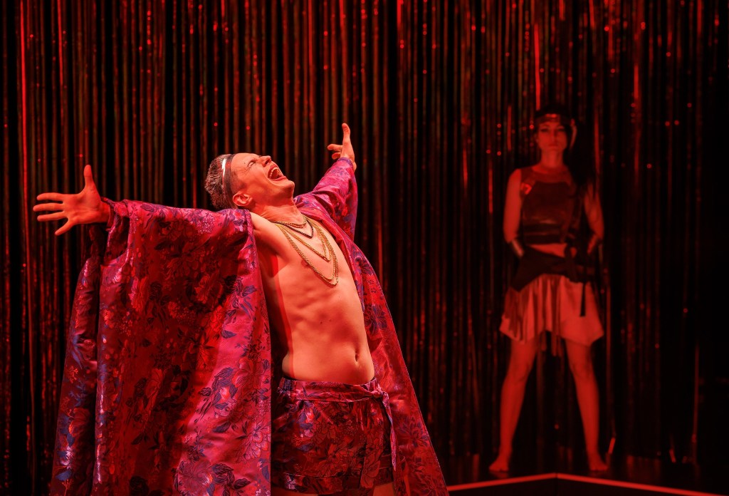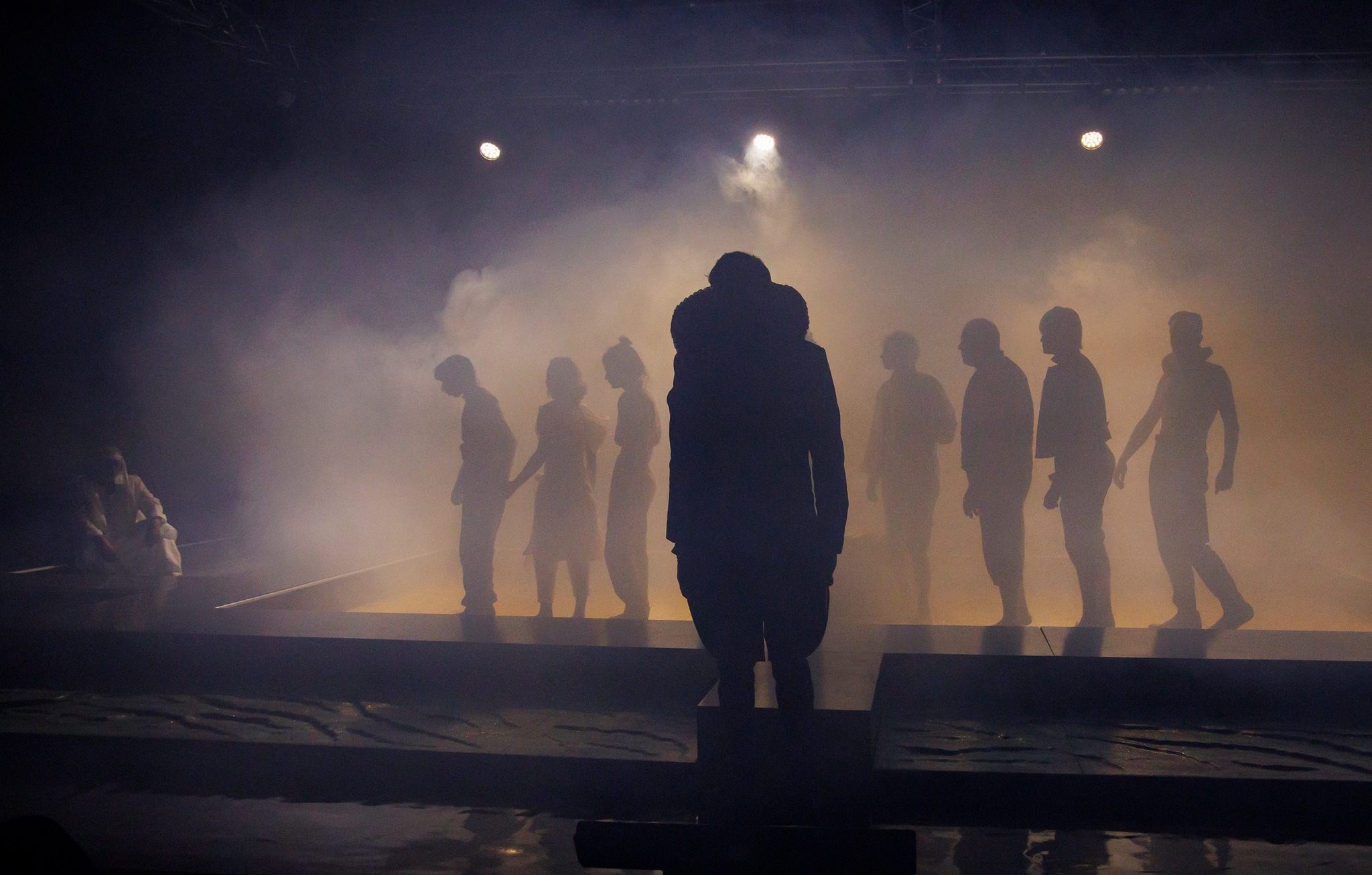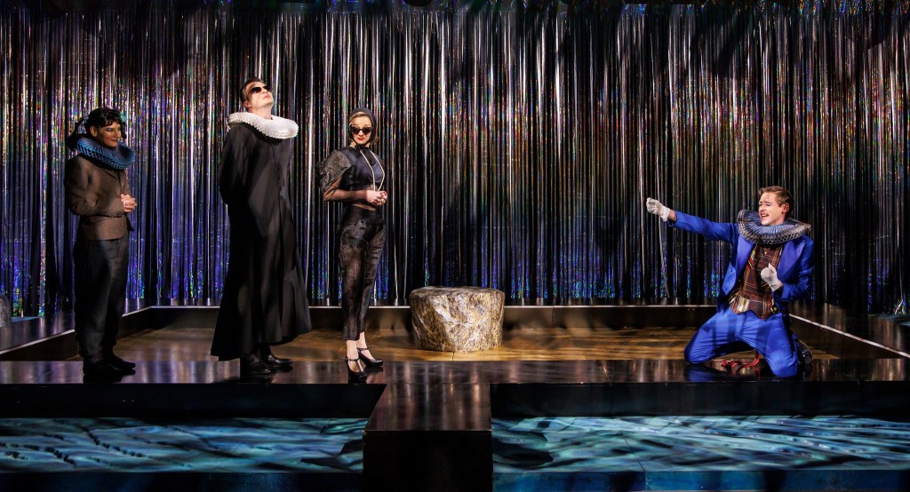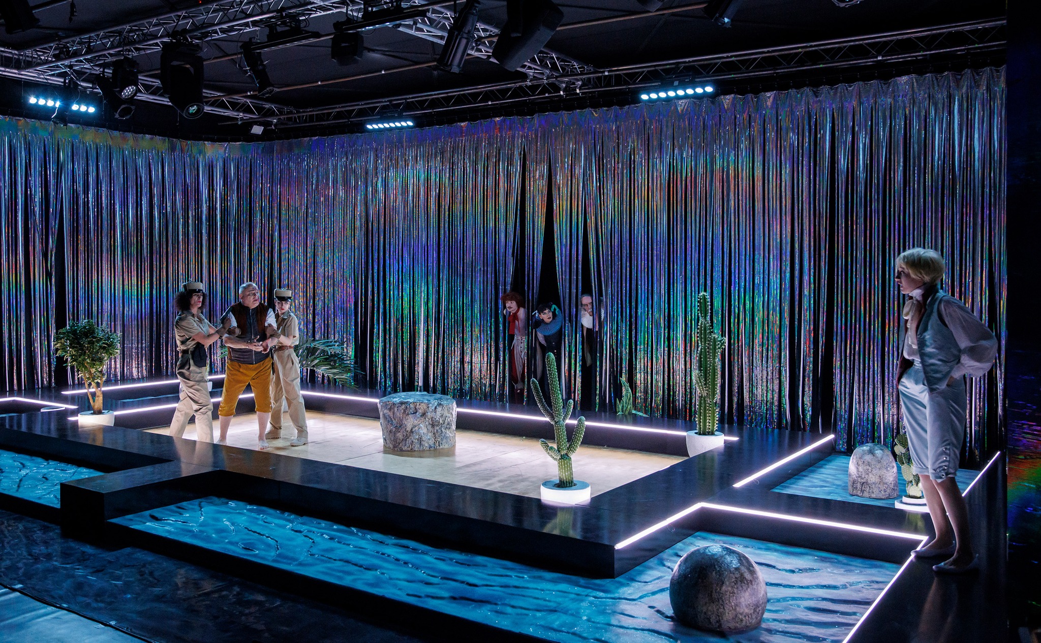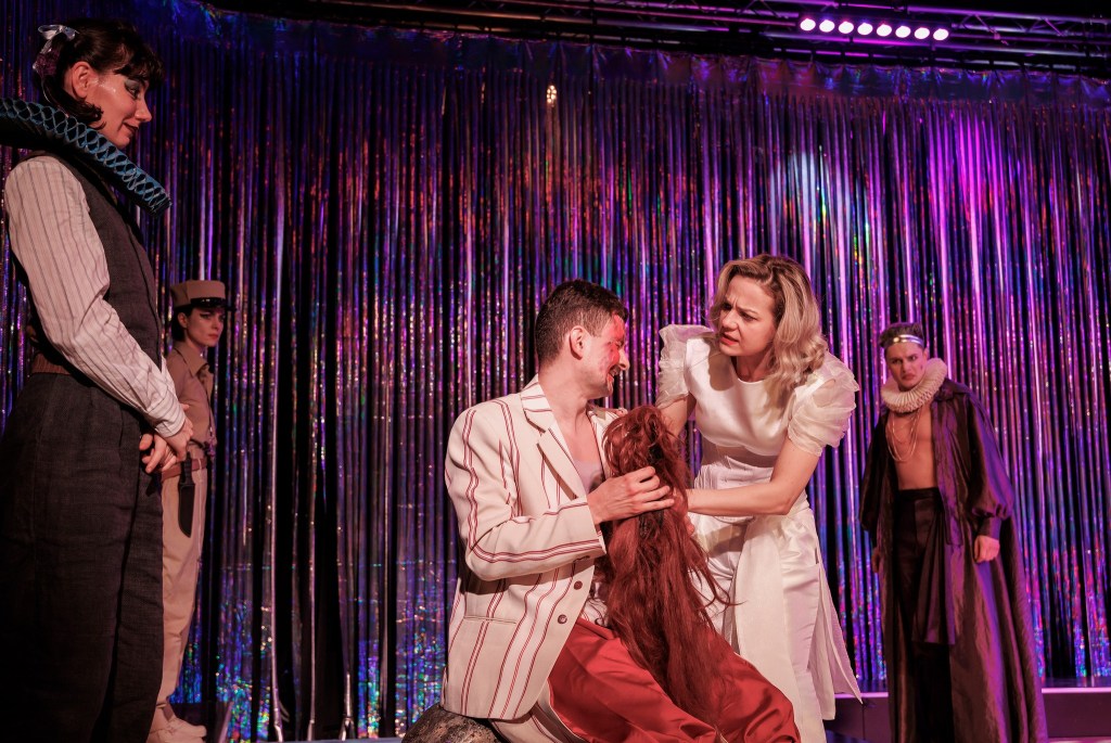 O piscină cu energie a unui teatral nou-nouț, esențializat vizual, înconjurată de ziduri din franjuri poleiți ce închid deștept spațiul de joc (în jurul perețillor, nu foarte înalți, ai piscinei) și îl deschid în același timp către curiozitate și promisiuni (ce nu se lasă așteptate) lărgind doar pe alocuri perspectivele, cât să alăture deștept la nevoie extraspațialul cetății și cleveteala de la curte (pe care o simți efectiv desfășurându-se fizic în jurul scenei, felicitări, Carmencita Brojboiu!) dar și să permită catwalk-ul in progress al personajelor pe marginile piscinei (mai ales pentru extrapersonajul-colectiv Nebunul, asigurat la superlativ de trio-ul Ștefan Mihai-Ecaterina Lupu-Liviu Manolache, care acompaniază savuros sincron, pe alocuri, jocul actorilor din spațiul central). Reflexiile pe care le permite poleiala îmbracă abil spațiul, diferit la fiecare schimbare de lumină (lighting design Cristian Niculescu) pentru a modifica lejer convențiile (spațiale și temporale) de la o scenă la alta, fără prea multă nevoie de elemente de decor (cele câteva sunt ingenios folosite), accentul vizual fiind pus inteligent pe costume, care surprind și ele ironic (!) atmosfera epocii.