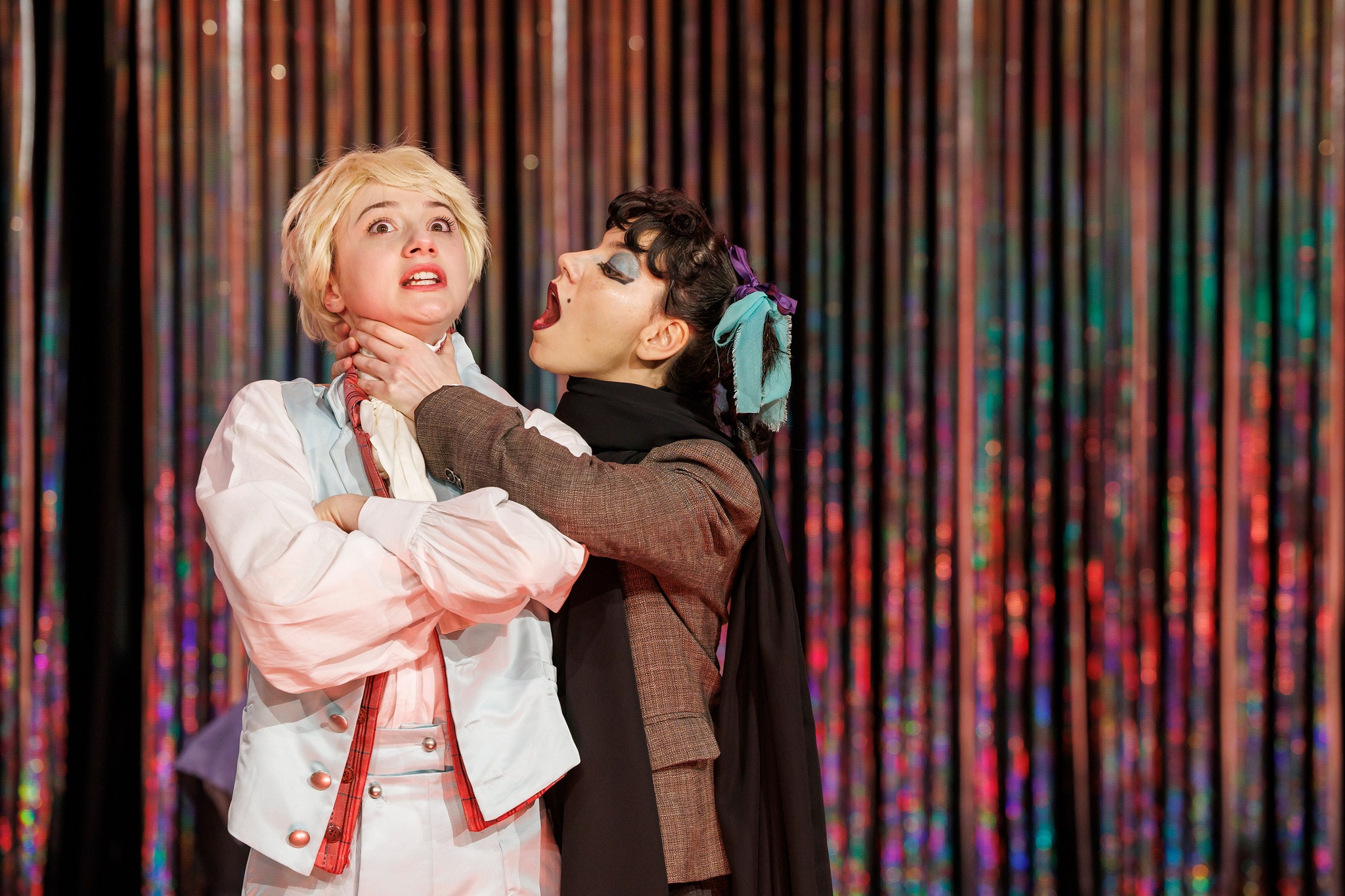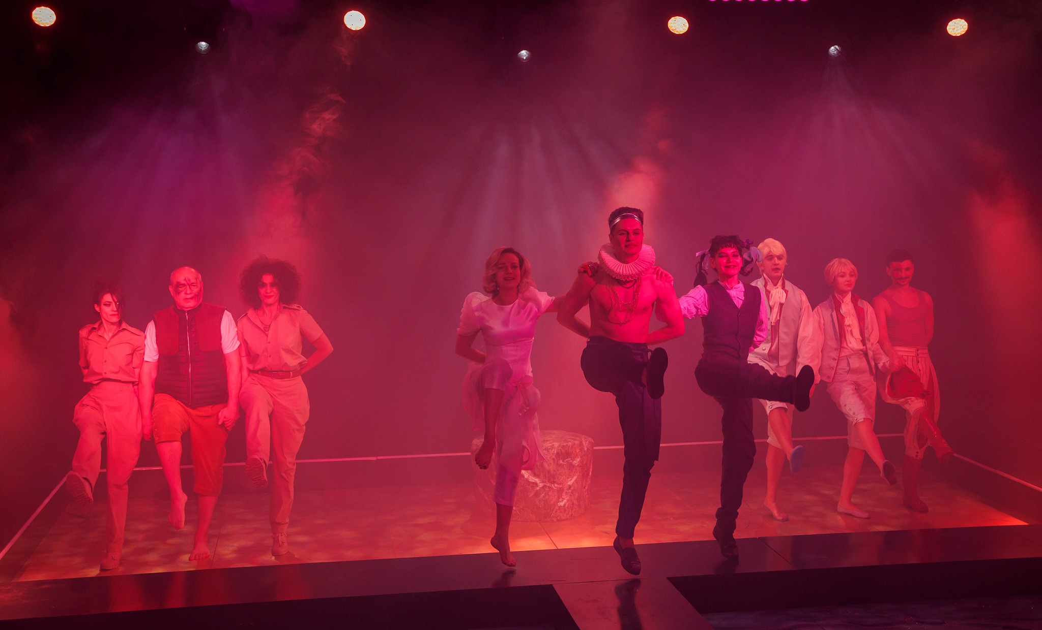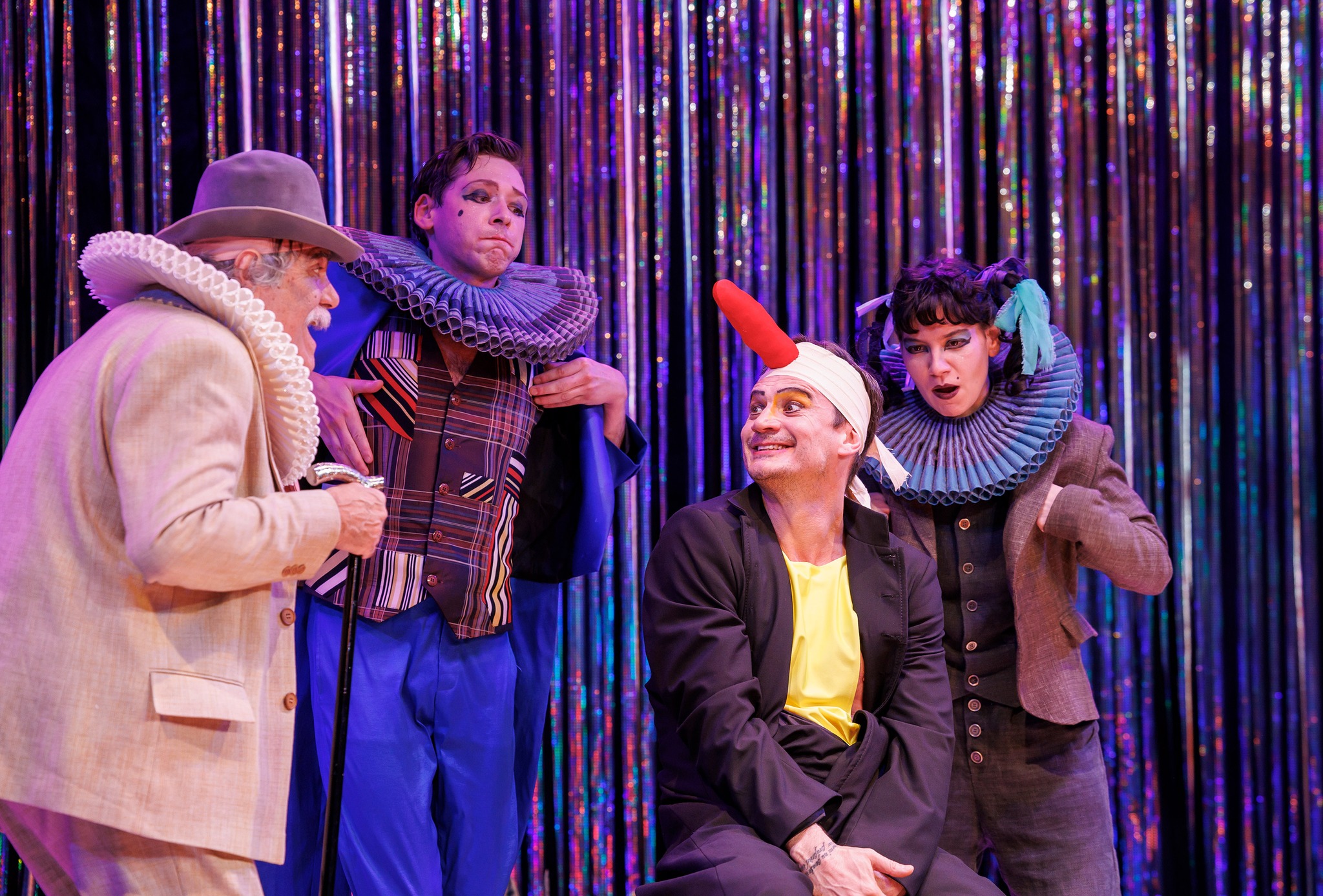 De sub culori și colerete, actorii constănțeni dau viață cu multă iscusință personajelor shakespeariene care-și ciocnesc în spirit dramele romantice, zgomotos, ironic și autoironic, minunat exagerat pentru a le surprinde multele straturi discursive pe care le-a pus la dispoziție marele Will și de care s-a folosit cu atât de multă iscusință Andrei Șerban, asigurându-le partituri aproape egale în economia emoționalului spectacolului, devenit astfel un perpetuum mobile al unui imens madrigal elisabetan, mișcat de mici galanterii lirice și acustici idilice (sound design Alex Popa), pe ritmuri dintre cele mai diverse ca să-i asigure spumos spectacularul și să-i valideze tânguielile în atât de multe feluri comice, adunate fluid într-un unitar fonic fascinant care-i asigură, nici nu știu cum, o muzicalitate shakesperiană de grup. Din care se desprind și în care se repliază pe rând oamenii cetății pentru a naviga prin cotidian și a ne convinge să participăm la jocul de-a îndrăgosteala, în care e posibil orice (chiar și dragostea deplasată a lui Antonio pentru străinul Sebastian, căreia Iulian Enache îi asigură o frumusețe aparte în doar două apariții în care-și pune deștept semnul de exclamare în dreptul interpretării!).