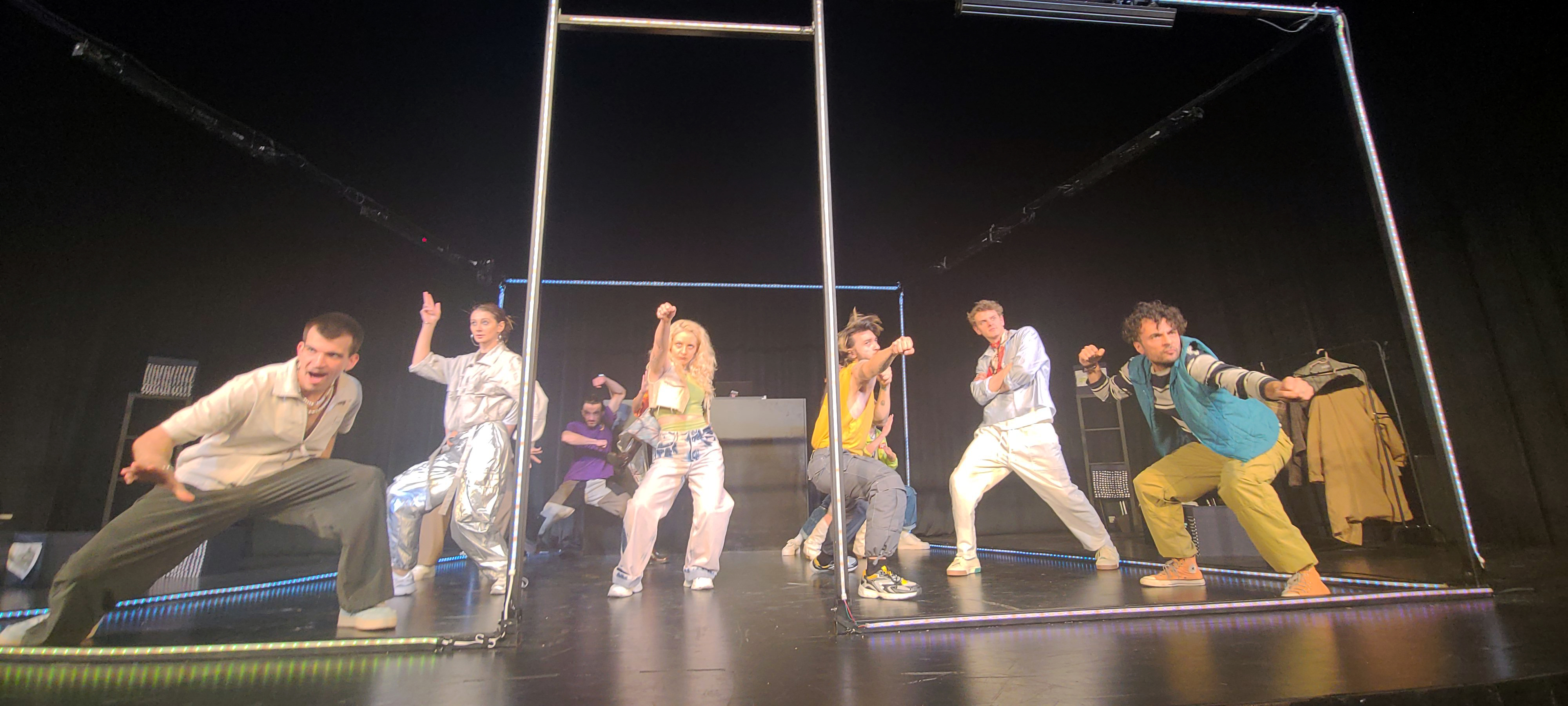 Interiorul unui cub uriaș, ridicat în scenă de scenografa arh. Ana-Maria Mănăilă doar prin câteva linii luminoase care îi schițează scheletul, încercând să stabilească simbolic granițele intimității ce urmează a fi întruna călcate. De bocancii plini de noroaiele traumelor dobândite de celelalte vârste încă din vremea copilăriei, când alți bocanci au călcat aceleași granițe, atunci ale lor, făcându-se că nu le observă. Prevăzut (tot din linii luminoase) cu o ușă pe care mulți o vor ignora cu bună știință, dacă n-o vor fi trântit-o teatral înainte, și asta numai și numai dacă nu a fost deja scoasă din țâțâni (!), în numele unei educații autoritare care se impune fără discuții acestor răzvrătiți ai vieții.