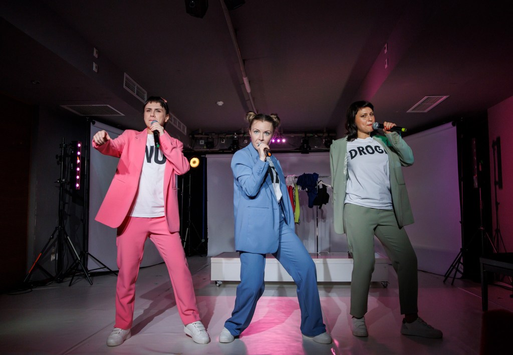 Înarmate toate trei cu solo-uri consistente ce le pun în valoare calitățile de interpretare și dau spumos viață partiturilor dramatice, învârtind cu emoție și mult umor narativul printre ping-pong-urile de afirmații și negații (!) în care îmbracă iscusit complementar istoria fragilei trupe și portretul efemer al artistului necopt în vremuri tulbure politic și social, strecurându-și abil, separat și împreună (printre știri senzaționale și testimoniale proiectate pe ecrane de la tv sau de pe net, în special despre consumul de droguri și jocuri de noroc, în timp ce caută niște arginți de la o corporație de profil), poveștile lor de viață pline de tristețe, abuz și adicții de toate felurile.