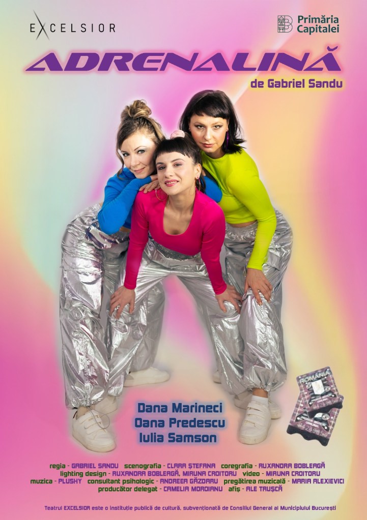 Aflat la a treia incursiune (nu se mai poate numi tatonare) dramatică în culisele succesului și prețului lui în peisajul muzical românesc, de dată mai mult sau mai puțin recentă (după ce s-a prins mai întâi cu Catinca Drăgănescu într-un proiect de cercetare care prezintă mai multe viziuni asupra vieții și morții Mihaelei Runceanu – căreia Catinca Drăgănescu i-a înscenat deja teatral povestea la Apollo 111, iar Gabriel Sandu o duce mai departe cinematografic în documentarul de lungmetraj „Istoria plină de speranță a Mihaelei Runceanu” -, apoi a realizat împreună cu Elena Morar și excelenta trupă de la Teatrul de Stat din Constanța „10 lucruri pe care le-am pierdut la Festivalul Mamaia“), Gabriel Sandu vine acum cu un nou epic de culise, punctual și pertinent, inspirat din istoria muzicală a propriei adolescențe, care l-a marcat din plin. Construită în jurul unei povești (aproape) fictive, cu rădăcinile înfipte în atmosfera încă plină de ambiguități artistice a anilor 2000, unde așează deștept superficialul unor vremuri în care trei fete crescute cu Fetițele Powerpuff s-au trezit peste noapte vedete într-o trupă de adolescente cu o istorie nefericit de scurtă, „Adrenalină” spune de fapt poveștile a trei destine traversate de adicții, care au venit să le substituie nevoia neînțeleasă de un hormon poate prea devreme descoperit în aclamații și huiduieli cu efecte nebănuite. Căutând fiecare să fabrice în felul lui propriul medicament care să poată replica proprietățile emotiv-stimulatoare ale unui mușchi cardiomuzical comun, ce le-a adus și le-a ținut împreună bătăile inimilor în același ritm pentru prea puțină vreme, în spatele unui fir roșu (!) care le-a legat afectiv (dar și mediatic, social, politic) într-o singură identitate (recognoscibilă în perioada invocată) pentru totdeauna. Aducându-le împreună după fiecare șut în dos de care au avut parte de atunci încoace, poate din cincinal în cincinal sau odată cu fiecare moarte (!), când își așează fără blândețe una alteia flori pe piept (!), luând în râs viața, cu toate șotiile și cruzimile pe care li le-a așternut în cale.