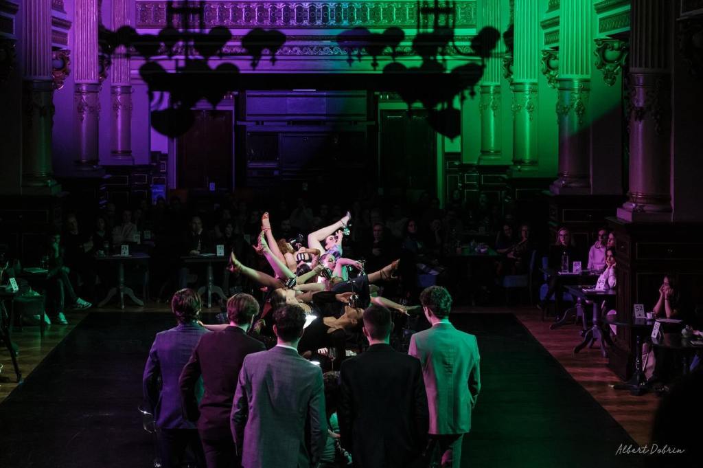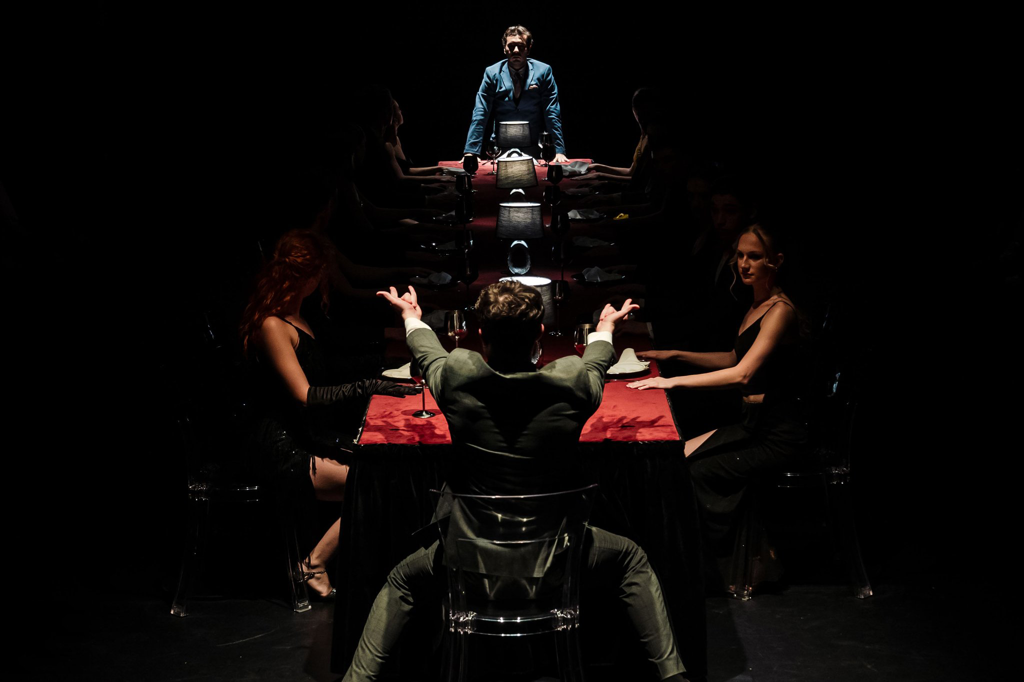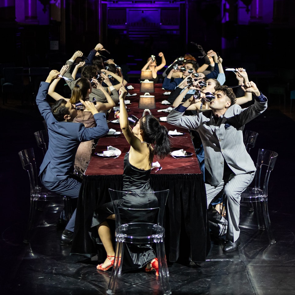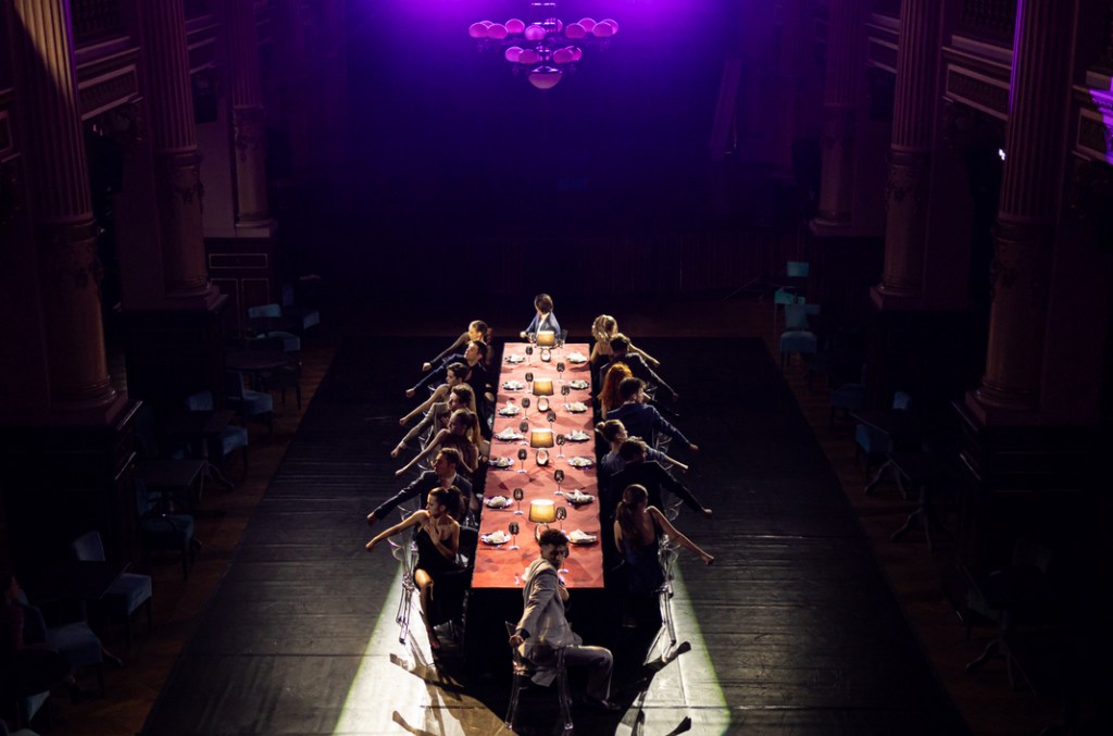 În lumina caldă de candelabru, 16 tineri frumoși și eleganți își aliniază pașii către spațiul central care-i așteaptă cu masa pusă. Pentru o petrecere somptuoasă de zile mari în care-și va căuta fiecare locul potrivit, amușinând încăperea și partenerii de joc cu mișcări precise ce pleacă în ștafetă de la unul la altul până-și găsesc numitorul comun, dând ocol mesei atent aranjate să le găzduiască însoțirea. Printre coardele ciupite discret, mirare după mirare, la fiecare predare de ștafetă prin care gesturile își armonizează zbaterile, o bătaie ritmică de tobe (ce-ți va rămâne multă vreme impregnată pe timpan, excelent Mihai Dobre!) își găsește drumul către fiecare dintre ei, insinuându-se spasmodic în mișcarea de grup care-și găsește consonanța în bătăile marii inimi în care-și unesc arterele emoționalului, punând încet și precis stăpânire pe spațiul de joc, pe spectatori, pe Palat, pe o seară cu petrecere de vis pe care o promit cei ce tocmai și-au ocupat locul la festin.