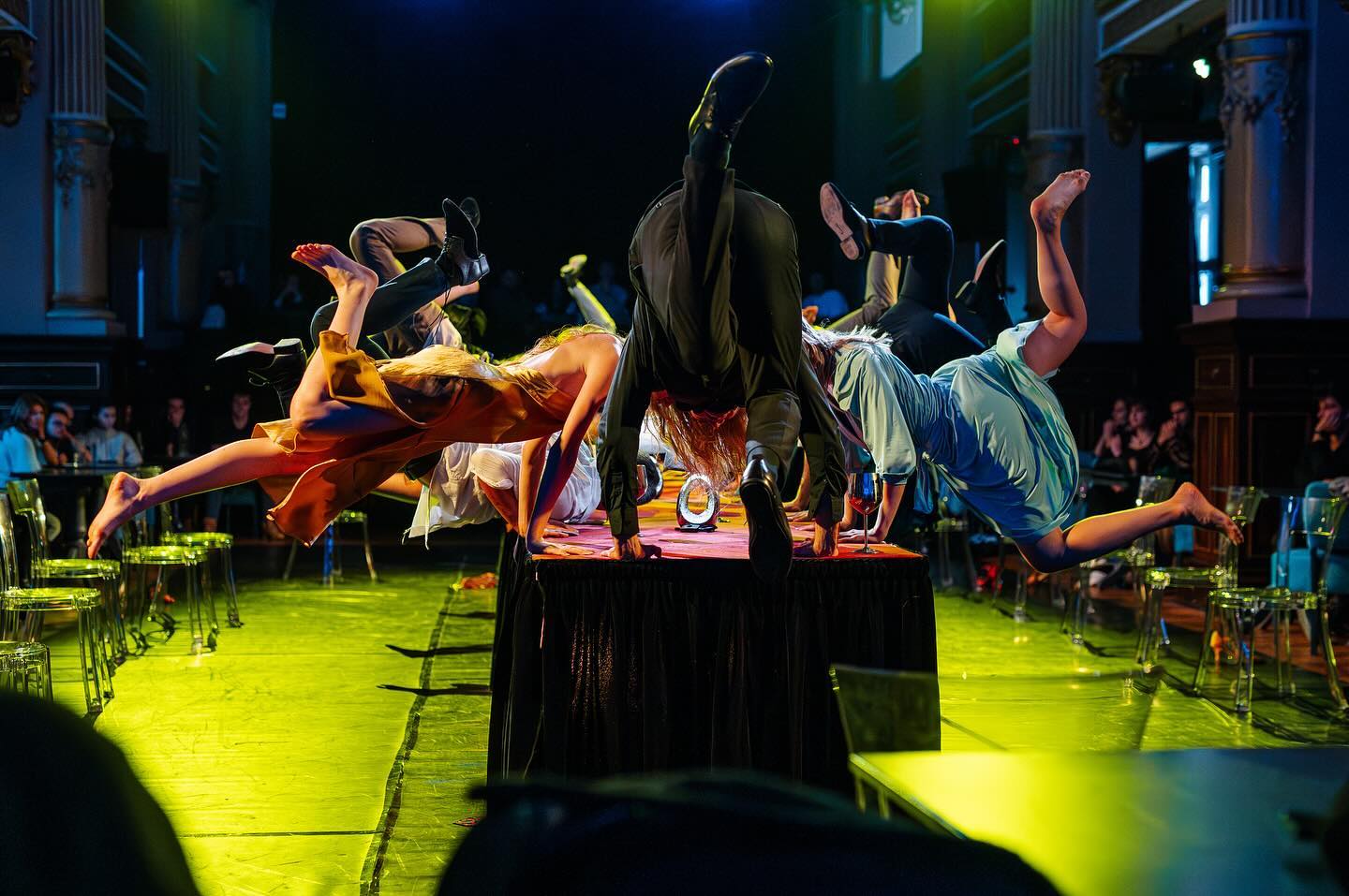 Încă un spectacol al corpului în mișcare perfect conștient de teatralitatea posibilităților lui de exprimare, esențializate și condensate într-un narativ marca deja inconfundabilă Andrea Gavriliu, care și-a găsit împlinirea prin acești talentați performeri ce reușesc să țină spectatorii cu sufletul la gură. 16 studenți în anul III la actorie ai Universității Naționale de Artă Teatrală și Cinematografică „I.L. Caragiale” din București. Sau 16 tineri înzestrați și entuziași ce se extrag atent din eleganța perfect asortată la masa impecabil pregătită pentru fițe de Palat, explodându-ne în față ca niște petarde de bună dispoziție dintr-un club obscur de noapte, târându-ne inteligent prin plauzibilul oricărui fel de uman în care ne întâlnim în cele din urmă inevitabil unul cu altul, construind și deconstruind mișcarea pentru sine și pentru relațiile pe care corpurile noastre nu prididesc să le negociaze în cotidianul în care suntem cu toții angrenați.