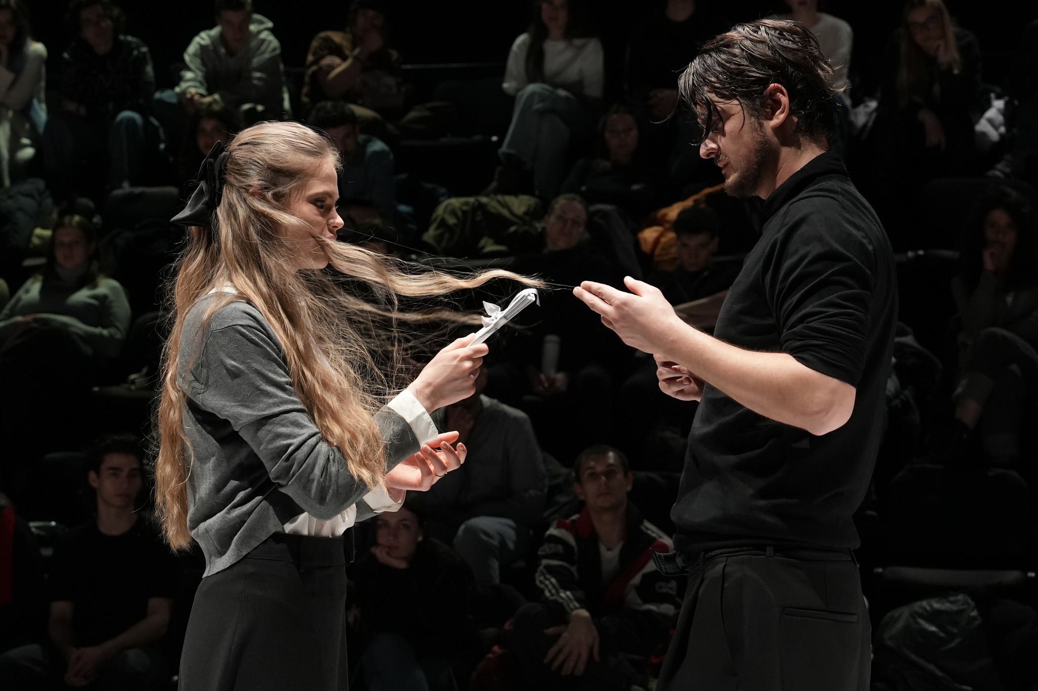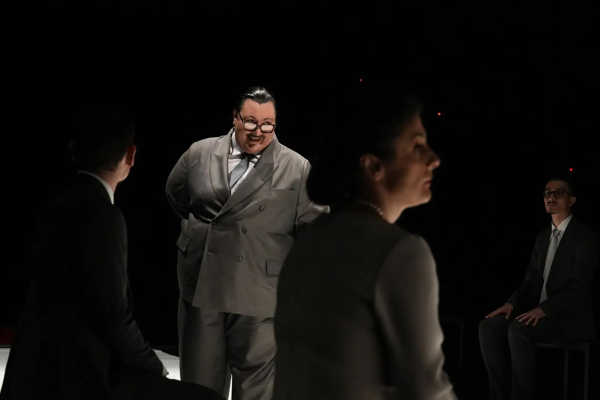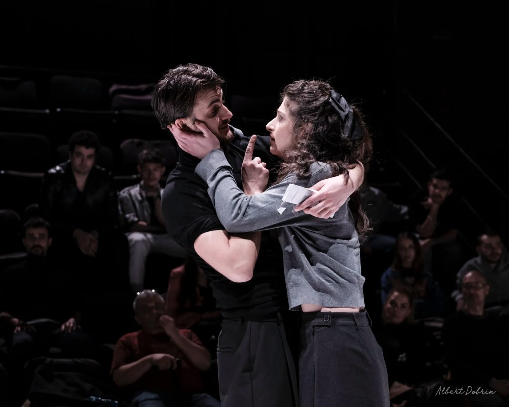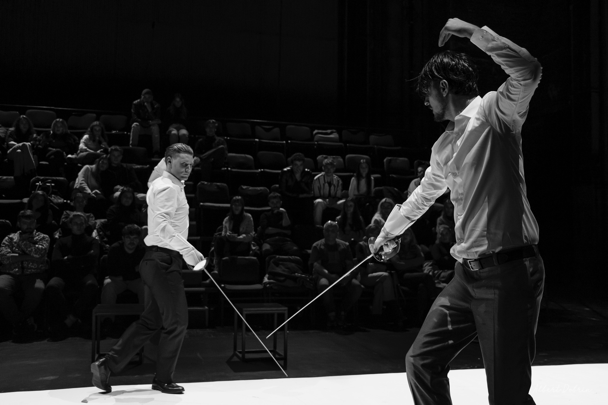 Esență de teatru. Personaje la patru ace pe culoarul companiei unui cotidian atemporal, alergând un Hamlet în pantofi roșii cu toc care dansează pe liniile de plutire ale tuturor, cătând să le țină în echilibru scaunele ce le-au fost încredințate. Pe-al lui (excelent Vlad Udrescu!), pe al fantomei răposatului lui tată care-și așteaptă răzbunarea, pe-al unchiului său ucigaș, pe-al mamei lui incestuoase, pe-al nefericitei lui Ofelia, pe-al vechilor lui tovarăși Rosencrantz și Guildenstern și pe-al trupei de actori cu care au venit, ba chiar și pe al nefericitului lui tovarăș de duel mut, Laertes. Cu Polonius-ul la vedere (senzațională Raluca Păun!), într-o înfruntare esențializată a temelor tragediei, desfăcută deștept pe limba spectatorilor de azi.