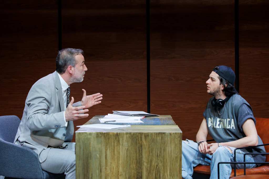 După o rețetă tot mai folosită de regizori în ultima vreme (text inteligent, psihodramatic, cu doar câteva personaje, lucrat cu actori foarte buni) pentru a asigura succesul spectacolelor mici, de buget modest, cu maximum de impact spectacular, cu o scenografie simplă (simplificată chiar și față de propunerea dramaturgului, care ar fi presupus poate și o dezvoltare verticală a decorului) în care tronează un birou și două scaune, arhisuficiente pentru fixarea spațiului de birou al unui director (adjunct!) de liceu (definit încă de la început prin anunțul din difuzoare privind intrarea în vacanța de primăvară), spectacolul lui Alexandru Mâzgăreanu mizeză totul pe jocul celor doi actori, Șerban Pavlu și Vlad Lință. Și câștigă.