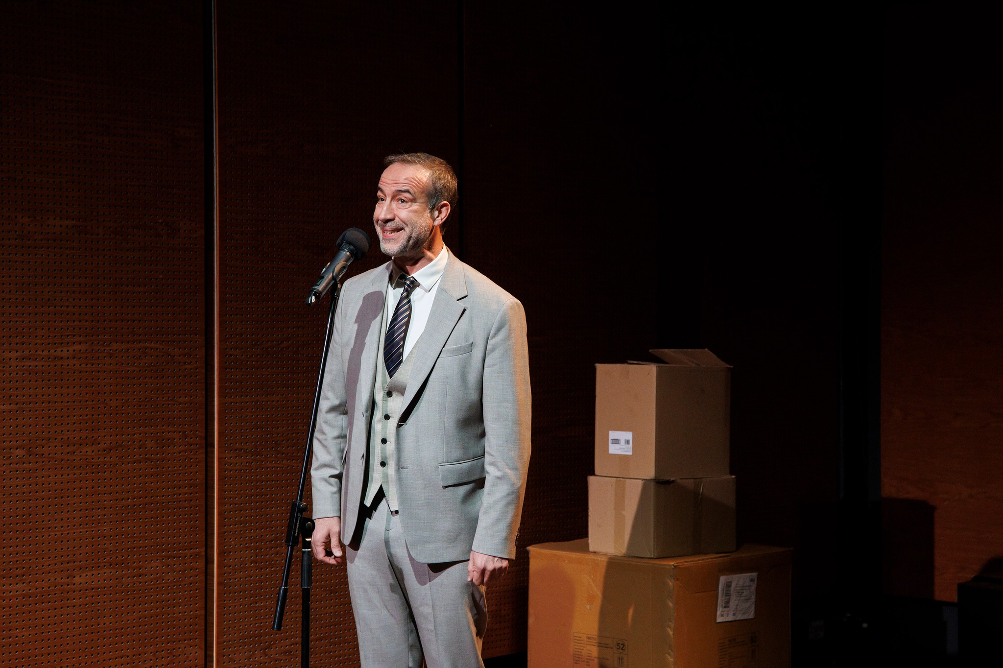După o rețetă tot mai folosită de regizori în ultima vreme (text inteligent, psihodramatic, cu doar câteva personaje, lucrat cu actori foarte buni) pentru a asigura succesul spectacolelor mici, de buget modest, cu maximum de impact spectacular, cu o scenografie simplă (simplificată chiar și față de propunerea dramaturgului, care ar fi presupus poate și o dezvoltare verticală a decorului) în care tronează un birou și două scaune, arhisuficiente pentru fixarea spațiului de birou al unui director (adjunct!) de liceu (definit încă de la început prin anunțul din difuzoare privind intrarea în vacanța de primăvară), spectacolul lui Alexandru Mâzgăreanu mizeză totul pe jocul celor doi actori, Șerban Pavlu și Vlad Lință. Și câștigă.