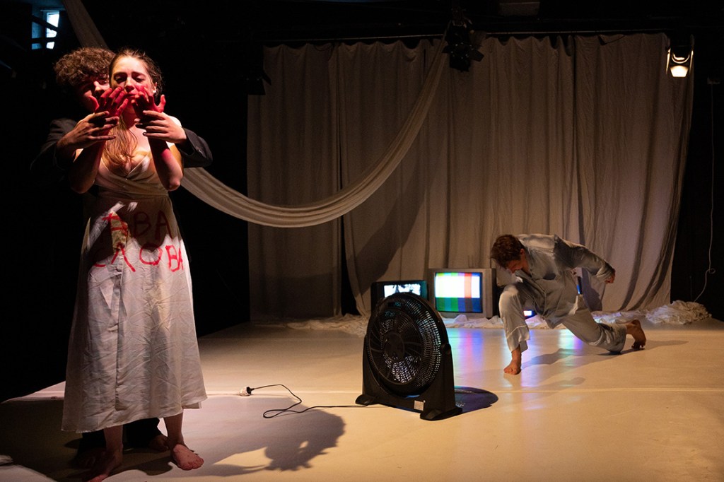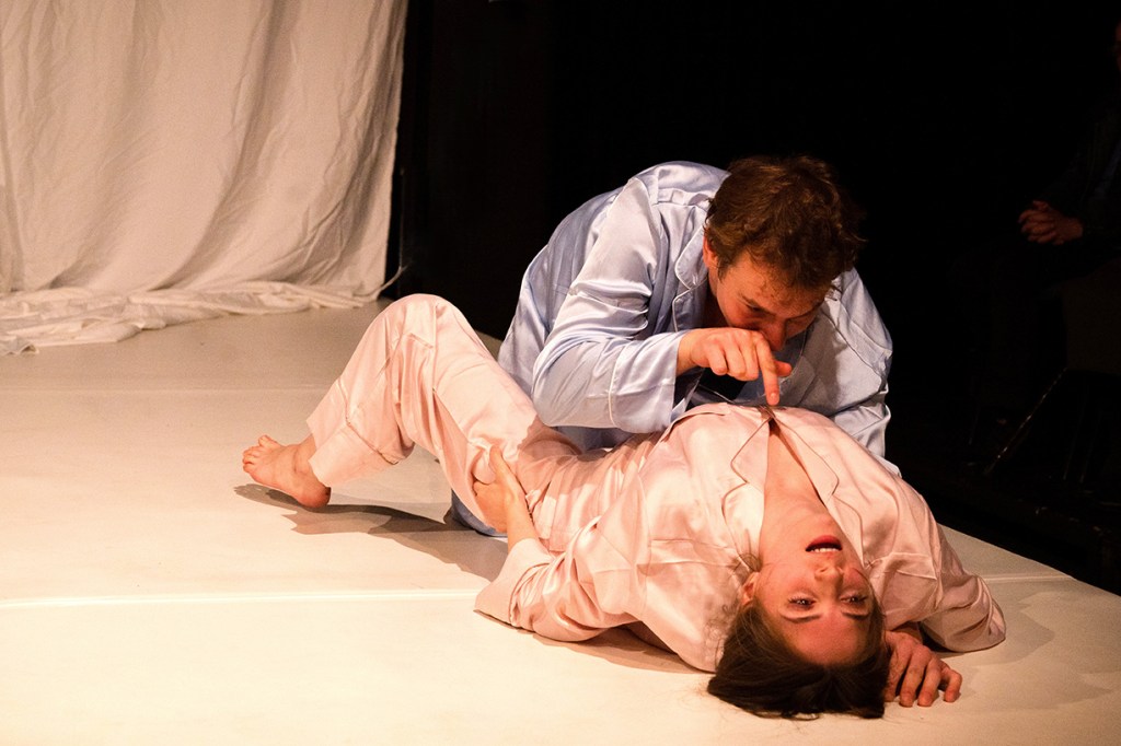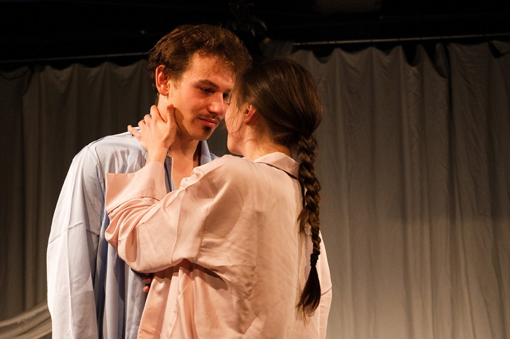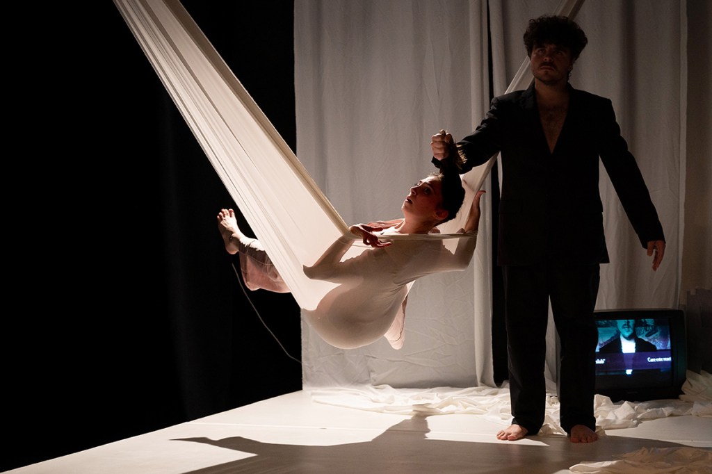 Nu, nu ele, nu celebrele!… Altele, cele mai noi două cuvinte ale îndrăgostiților care-și pregătesc faima, răstălmăcite pe limba unei noi ere care va redefini iubirea: „два слова” („dva slova” sau „două cuvinte”), pe care rușii revoltați au început să le scrie pe ziduri declarând un mare NU RĂZBOIULUI. Poate singurele două cuvinte care mai pot salva poveștile de dragoste pe buzele iubiților în acest colț de lume. Scrijelite cu roșu de ruj, de sânge, de pasiune și de jertfă, traduse mai întâi într-un limbaj al trupurilor atacate și revoltate deopotrivă de războaiele de afară și de cel dinăuntru. O petrecere în pijama pornită parcă anume pentru detensionarea situației de la granițele Ucrainei și cele ale spațiilor personale, unde iubiții tremură zi și noapte pentru siguranța lor și a celor dragi lor negociindu-și la sânge iubireaa. Trei corpuri prinse în dansul convulsiv al unei relații de iubire în vremuri pandemice, zgâlțâită serios de lumea de dincolo de ușă care dă năvală înăuntru prin intermediul ecranelor (inteligent adusă în interiorul cuplului prin intrusul scăpat ca din greșeală dintr-un buletin tv „Breaking News” direct între lenjeriile lor, asigurând trasformarea ei umană și profesională ce-și vor pune decisiv amprenta asupra relației înlocuind glasul de chitară cu microfonul de știri). Înfășurând-o fără milă în kilometri de griji, de focuri de armă, de șenile de tancuri, de refugiați, de răniți, de morți, de știri care mai de care mai alarmante despre violențe armate masive împotriva Sentimentului suprem, independent, suveran, care abia mai reușește să-și lege una după alta respirațiile în două piepturi ce trebuie să-i țină aprinsă mai departe flacăra, pasându-și unul altuia îmbrățișările, îngrijorările, leacul, tusea, paharul de lapte (!), ținute în echilibru fragil pe sfoara subțire a cearșafurilor parcă înnodate unul de altul în pregătirea unei salvări ce nu va putea să aibă loc.