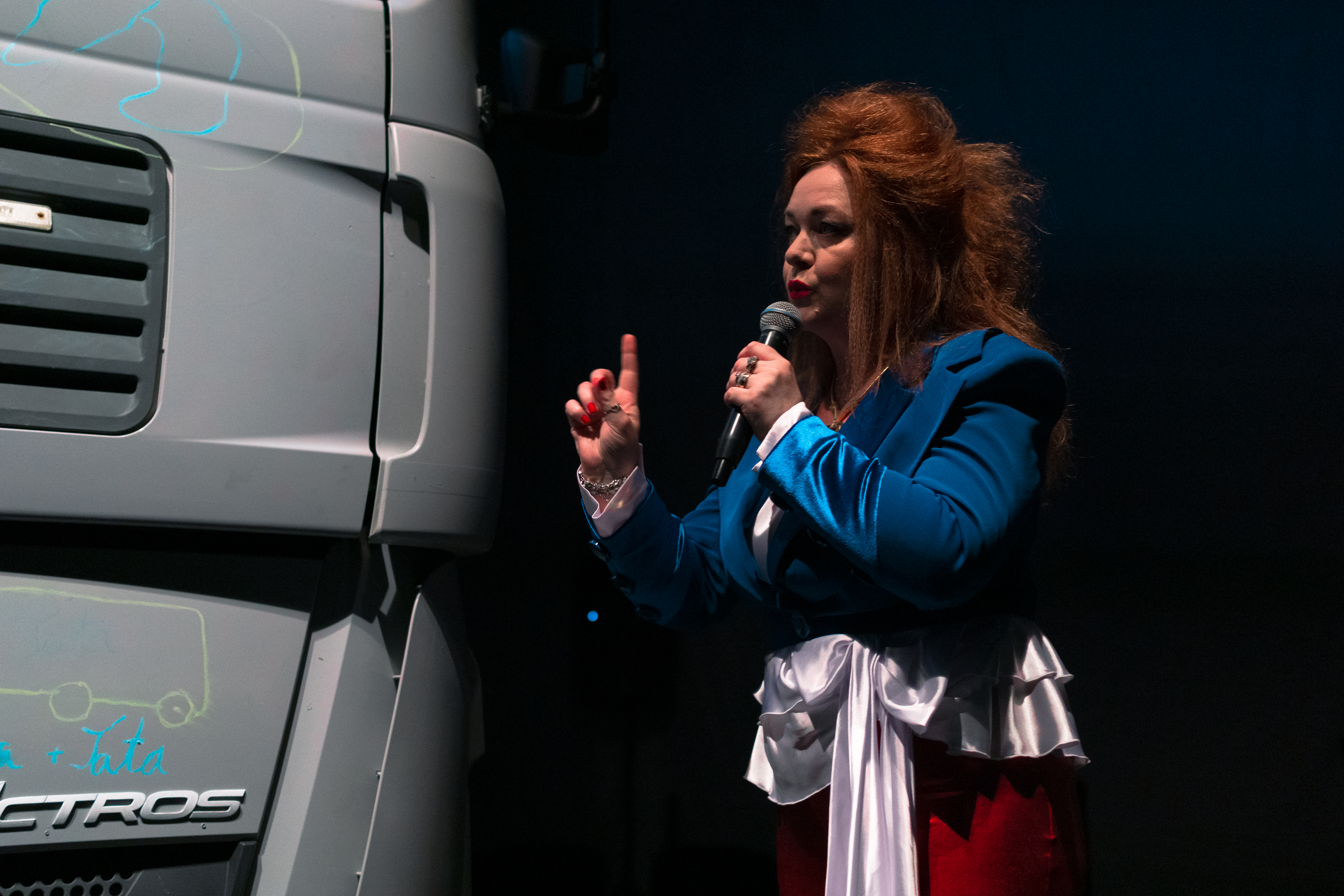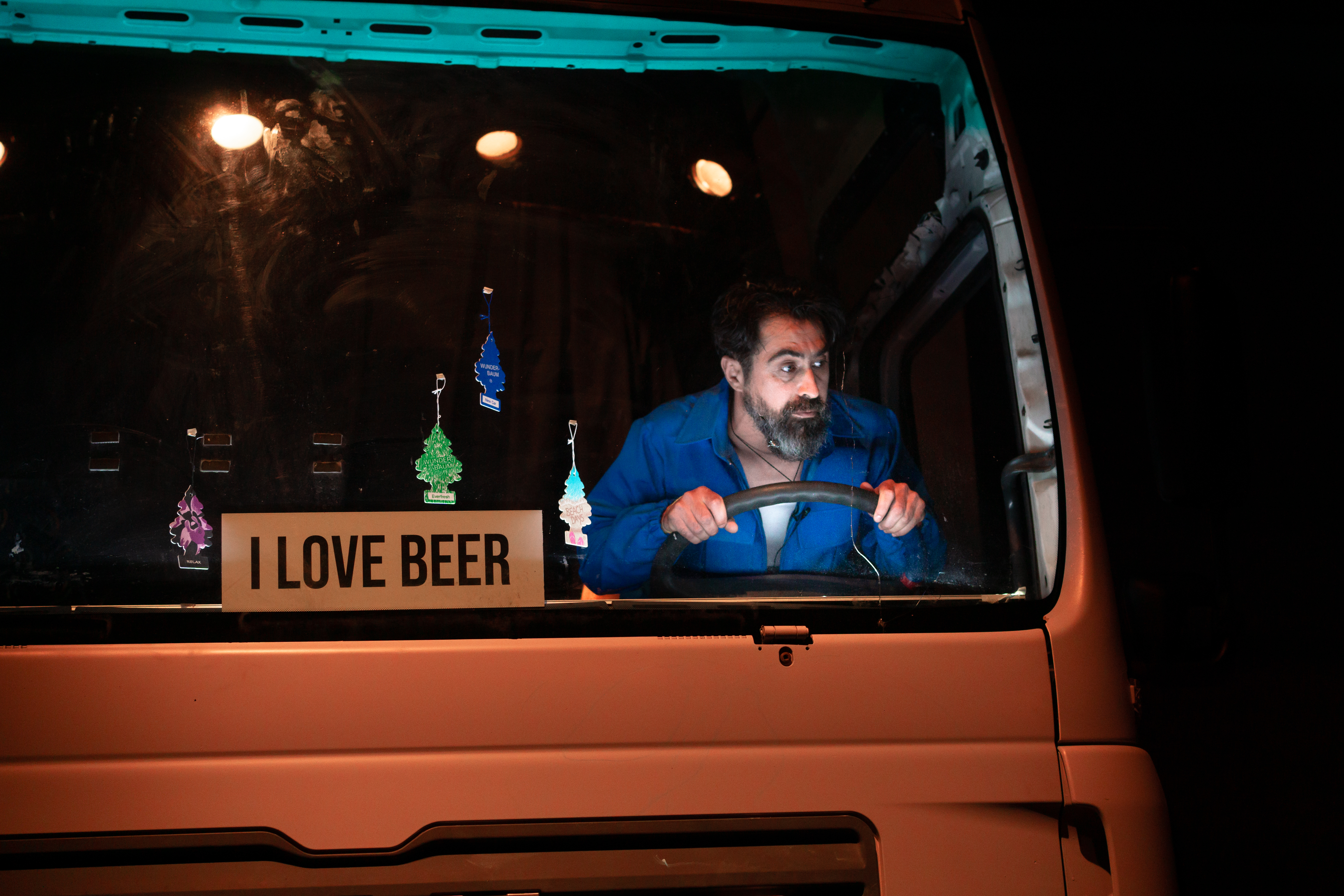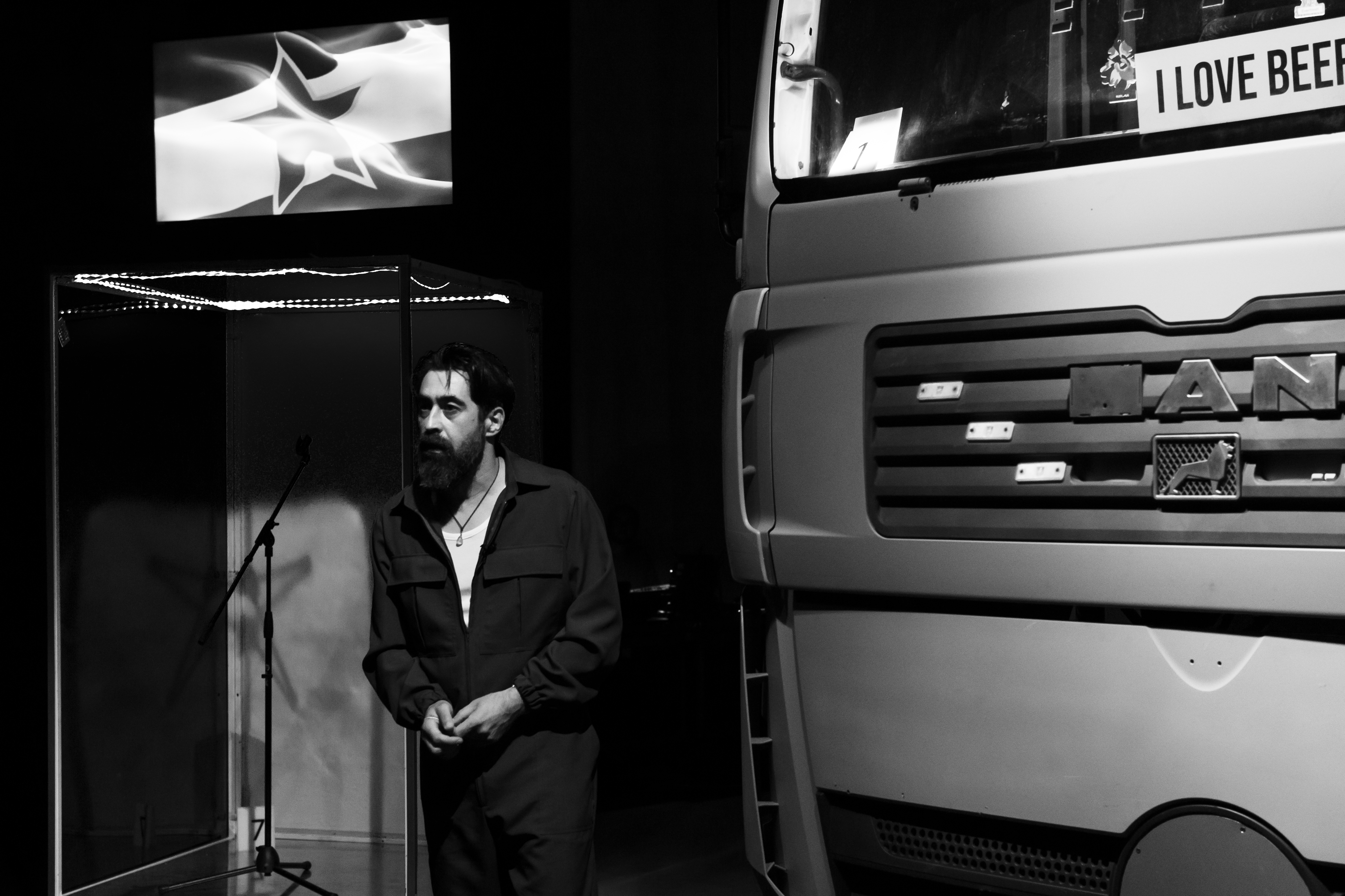 Și din cabina Fahretei te trezești direct în fața impresionantei cabine de TIR (în mărime naturală!) a lui Willem, occidentalul (ne)vinovat cu care pornește călătoria printre dezastrele personale ale sufletelor găzduite de Bosnia-Herțegovina sub semnul „Blue delivery”. Ioan Crețescu face din olandezul Willem un exponat demn de prezentat la intrarea în muzeu. Fost soldat în misiunea „căștilor albastre” (soldații Națiunilor Unite trimiși în misiuni de menținere a păcii în lume!) din Bosnia, ajuns în teatrul de operațiuni la vârsta la care cele mai îngrozitoare imagini ale războiului s-au scrijelit în sânge pe suflet și pe pleoapa pe care n-o va mai putea trage niciodată întru odihnă peste liniștea vreunei nopți, chiar dacă a reușit să treacă de prima linie, de unică folosință, a frontului. Actorul caută să-l strunească pe Willem-călăul în timp ce face recensământul dezastrelor la care a asistat Willem-victima, oprindu-i calculat gesturile la jumătatea intențiilor, trimise în privirile încrâncenate cu care-și însoțește gândurile în timp ce-și mișcă agitat personajul în jurul camionului, lăsat să răbufnească în câteva momente în care coarda prea întinsă peste revoltele lui umane pleznește zgomotos peste toate încercările disperate de a-și explica în cretă absurdul războiului, scos la tablă și testat în fața martorilor unei istorii care pute și căreia vrea să-i neutralizeze duhoarea morții cu brăduți odorizanți.