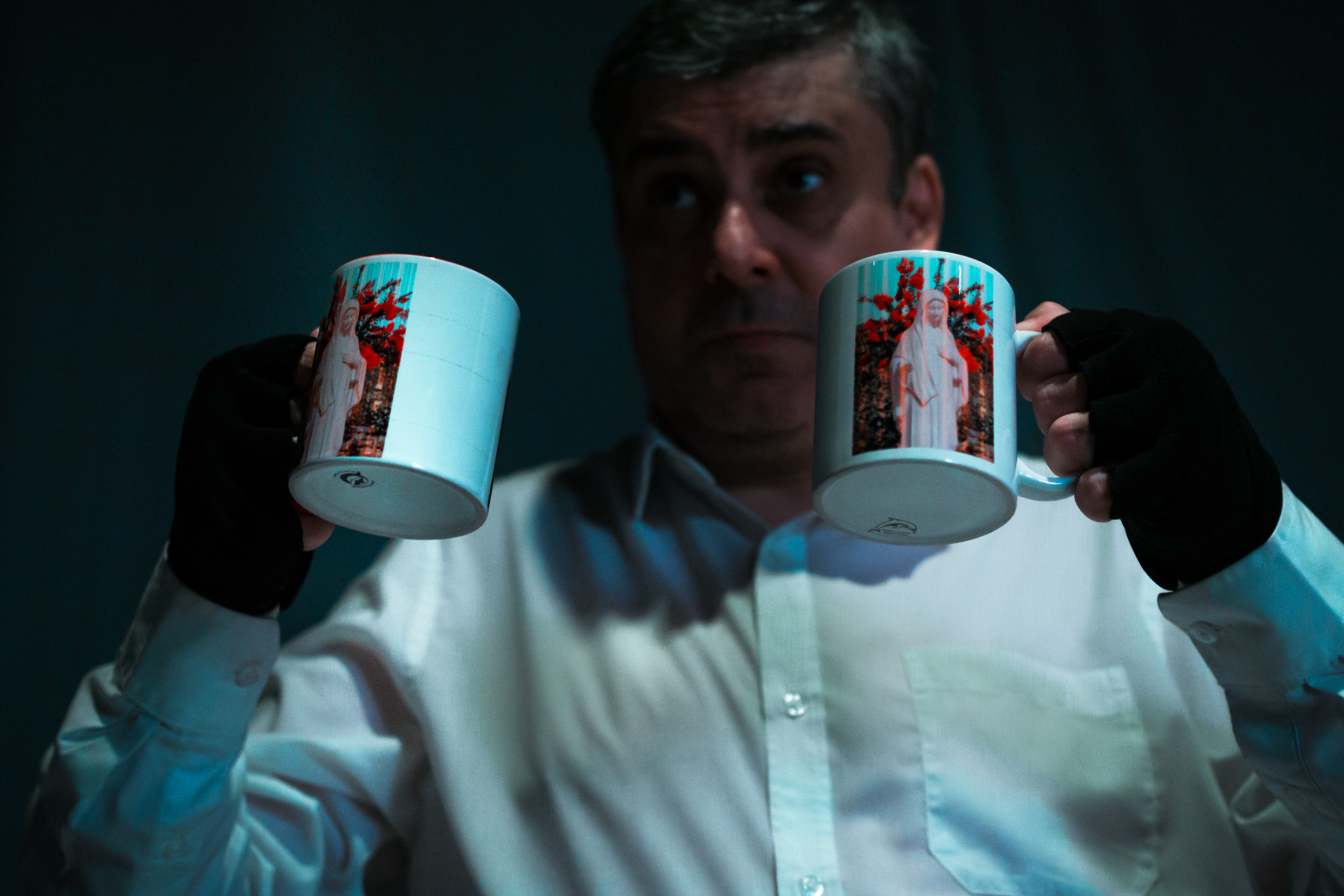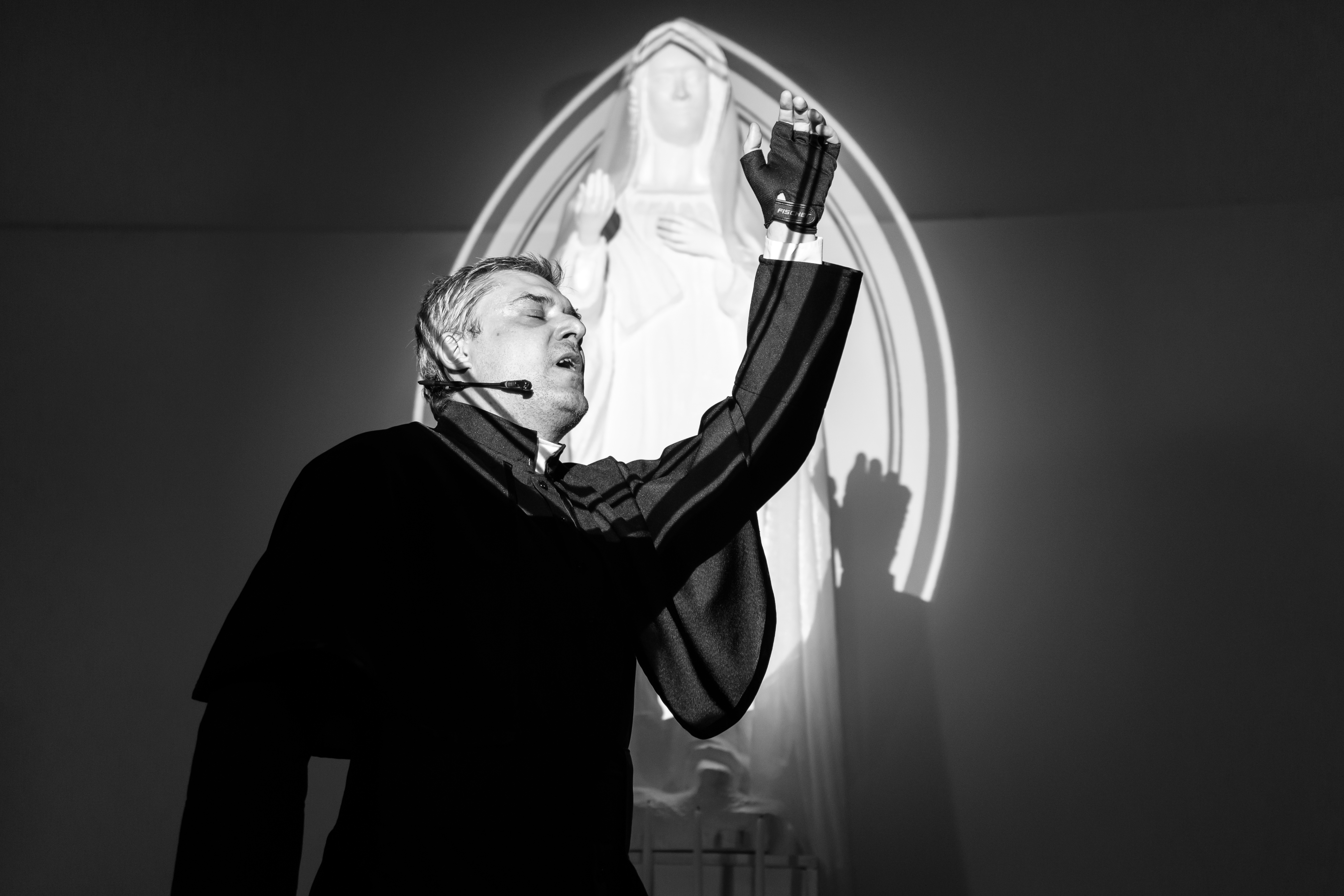 Fie și (aparent) în cele mai nobile scopuri, precum o face părintele Ante în micuța catedrală improvizată în spatele scenei, unde carismaticul Sorin Ciofu ne așteaptă viclean să ne impresioneze cu slujba lui exagerat exaltată dintr-o altă patrie-mamă și să ne binecuvânteze în numele unui „Dumnezeu croat” care și-a făcut simțită prezența între munți prin apariția Fecioarei cu pruncul în brațe (miracolul de la Medjugorje, unde se zice că Fecioara s-a arătat în fața a șase copii în 1981, timp de 7 zile, încredințându-le secrete ale viitorullui lumii, poate chiar și despre războiul despre care vorbim), invocat spre a impresiona spectatorii-pelerini, doar doar se vor simți și vor achiziționa suvenirurile sfințite dezvăluite de sub treptele albe (memorabilă imagine, bravas Șteff Chelaru!) pe care își cațără credința la vedere, ridicând hiperduliile către statuia ciuruită de gloanțe pe ritmurile de mitralieră din imnul de război al sârbilor (și-a băgat coada și Andrei Cozlac!) a Gospei. Spre care este obligat să privească (ghinion!) prin ochi de bosniac și pe care este dator s-o simtă (sâc!) prin inima unui motocicilst sârb, în timp ce mărturisește senin păcatele înaintașilor din Organizația Ustaše(croații ultranaționaliști din al doilea război mondial, aliații lui Hitler, ai căror preoți predicau inferioritatea sârbilor și a ortodoxismului invitând la crimă) spre care ne roagă să privim cu îngăduință, că doar și ei au fost fii ai războiului.