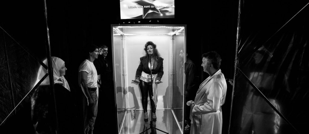 Încă de la intrarea în spațiul care găzduiește de vreo 10 ani spectacolele teatrului „Mihai Eminescu” ești îndrumat către un univers ciudat, pseudoartistic, ale cărui vitrine, amplasate în scenă, facilitează un fel de impro-show ce se va dovedi milimetric construit în jurul unor piese de rezistență ale ororilor războiului, ce se ascund după semitransparența vitrinei prăfuite. Șapte exponate vii dintr-un Muzeu al dezastrelor personale în care ne întâmpină cu entuziasm Fahreta excelentei Gina Patrașcu-Zamfirache care ne va fi ghid, amfitrioana vigilentă și vocea care va imprima muzical (și identitar!) întregul spectacol, deschis (și închis) inspirat cu un hit sârbesc care s-a auzit multă vreme și pe meleagurile noastre (Tajči – Hajde Da Ludujemo, melodia cu care Iugoslavia a participat în 1990 la ediția Eurovision pe care a și găzduit-o), permițând spectatorului să-și calibreze așteptările și să pășească în culisele acestei convenții (cred că asta e cea mai puternică senzație la începutul spectacolului, că ești poftit în culisele Eurovision-ului, unde artiștii și-au pregătit dinadins poveștile cele mai puternice pentru a înmuia inimile spectatorilor ca să adune cât mai multe voturi pentru Bosnia, patria fictivă, afectivă și subiectivă a lui Andrei Măjeri!).