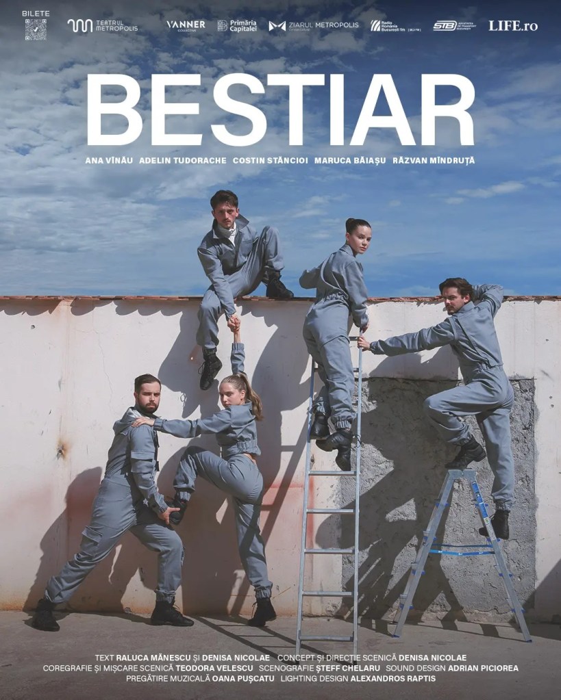 Spectacolul „Bestiar”, după un text semnat de Denisa Nicolae (cea care l-a și pus în scenă) și Raluca Mănescu, produs de Vanner Collective în coproducţie cu Teatrul Metropolis, translatează umanul în regnul animal folosindu-se deștept de realitatea românească, nevoită să țină pasul cu ordinea și ambițiille lumii, evadând de multe ori în imaginar (și de acolo invers!) pentru a o asorta digerabil la pudorile unei generații urbane de secol XXI aflată într-o oală de presiune, pentru care subiectele sensibile pe care le atinge nu mai prididesc să fie periate politically correct spre a nu aduce, Doamne ferește!, vreo ofensă (rasială, lingvistică, sexuală, ocupațională, ș.a.m.d.) vreunui segment de public ce s-ar putea simți lezat. Așa că purcede la fabulo-parabolă.