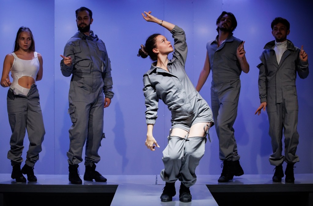 Alegoria permite delicioase definiții și jocuri de limbă cu care cei cinci actori captează și mențin vie atenția publicului în jurul narativului-fabulă pe care-l condimentează generos fiecare dintre ei cu propria aromă și energie, spectacolul fiind lăsat aproape exclusiv în seama actorilor (cărora le pune excelent în valoare calitățile de interpretare, de mișcare, coregrafice și vocale), așezați inteligent de Denisa Nicolae în griul general din decorul-suport propus de scenografa Șteff Chelaru (poate tocmai pentru a nu bruia mesajele), gândit modular, din elemente ce redefinesc ușor spațiile propuse (rotite în diverse chipuri spre a servi drept bănci școlare, catedră, masă aniversară, birouri, catwalk, pereți pentru spații de petrecere sau de repetiție). Un decor futurist, numai bun de celebrat noul din fabricile de absolut ale umanului cu dinamică industrială aflat în plină ascensiune, prelungit în griul-simbol din costumele lor identice (servind deopotrivă ca uniformă de înregimentare și salopetă de lucru pentru meseriile jug-de-aur) în care se văd nevoiți să ducă mai departe povara stigmatului lor de animale numai bune de sacrificat, sperând să le salveze la capătul drumului. Un gri-atelier de lucru în care spațiul (devenit pe rând sală de clasă, pajiște, locuința părinților adoptivi ai Munei, birou în Marea Fermă, talent-show-walkway pentru Fabrica de Talente) este în fapt unul de dezbatere, în care se încearcă integrarea vechiului în design-ul minimalist al ispititoarelor și provocatoarelor vremuri noi (doar o floare roșie după o ureche și, gata!, ai în față imaginea unei dăscălițe desuete, cât o fi ea de Meryl Sheep (!)), susținute pertinent de eclerajul luiAlexandros Raptis și cele câteva elemente-simbol din recuzită (lanțuri, cuțite, foarfeci și bici, obiecte cu care sunt exploatate, chinuite ori sacrificate animalele pe care le întruchipează și care definesc tipologiile umane prezentate în filosofia corporatistă, excelent mânuite de cei cinci sub povața coregrafei Teodora Velescu, care sparge cu ludic, erotic și senzual momentele tensionate ale spectacolului), dar mai ales superb puse în valoare de sound design-ul lui Adrian Piciorea(în care s-a înfiletat firesc și Oana Pușcatu, cea care s-a ocupat atent de pregătirea muzicală a actorilor), un acustic etno-industrial de cea mai bună calitate (reușește să imprime spectacolului o cadență de mașini-unelte, care însoțesc în cheie folclorică pastoralul ce-și ratează superb rătăcirea în vreo buclă infinită de rutină) din care-ți rămân multă vreme în auz trilurile Ciocârliei (prelungite în vocalizele și onomatopeele atent presărate în glasul actorilor), vârâte atent sub arcușuri de vioară și suflate vesel către timpan prin tuburile unui nai uriaș care-i desăvârșește autohtonul.