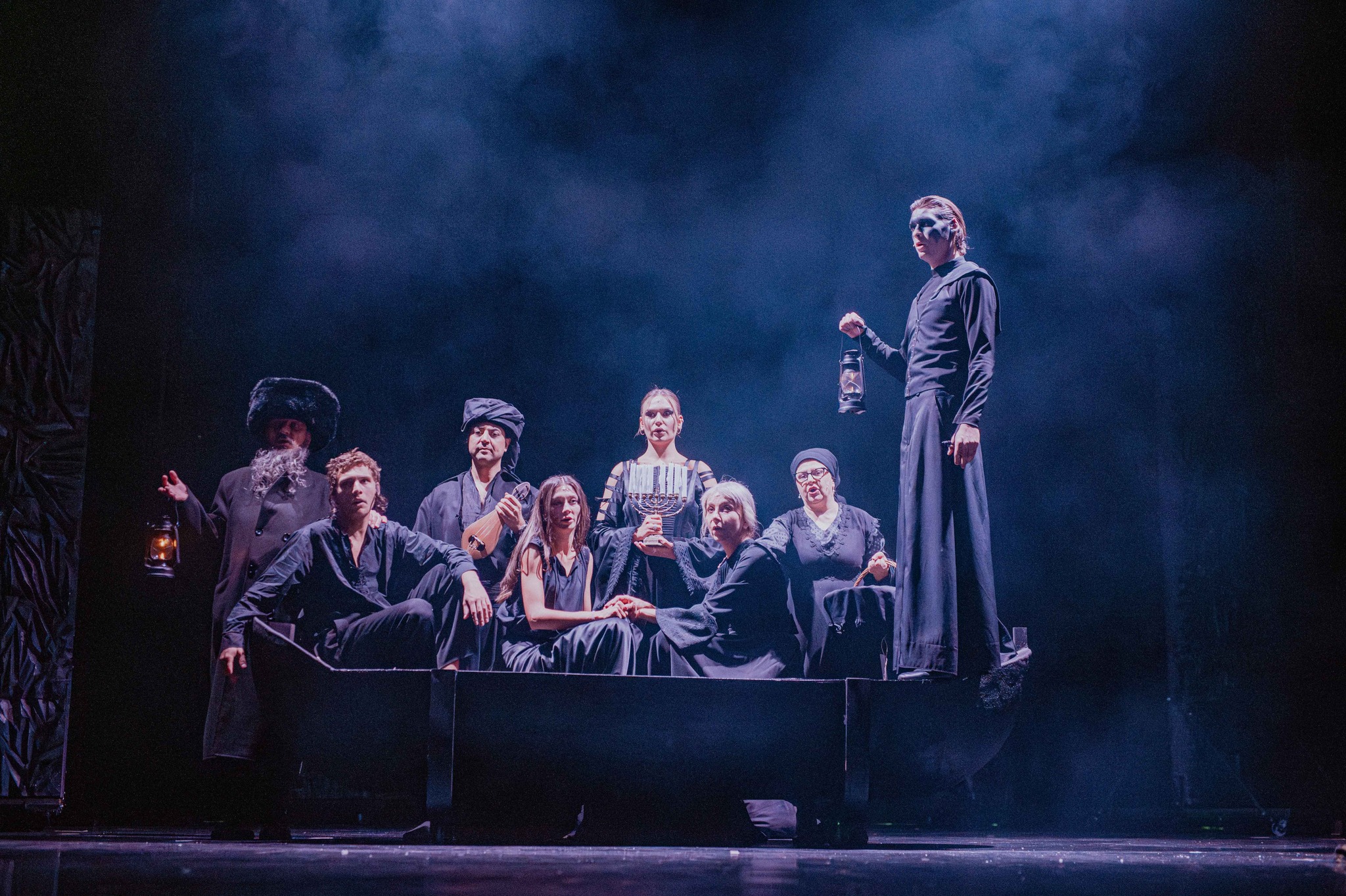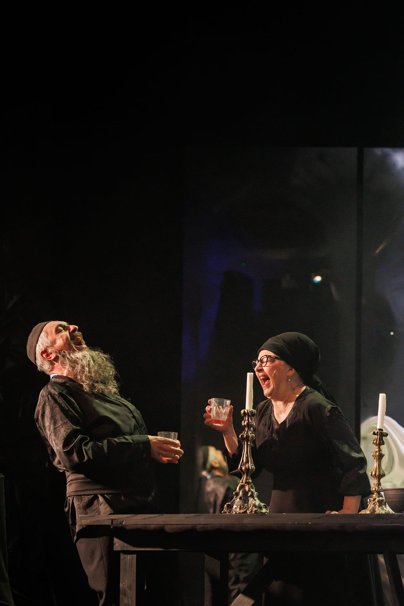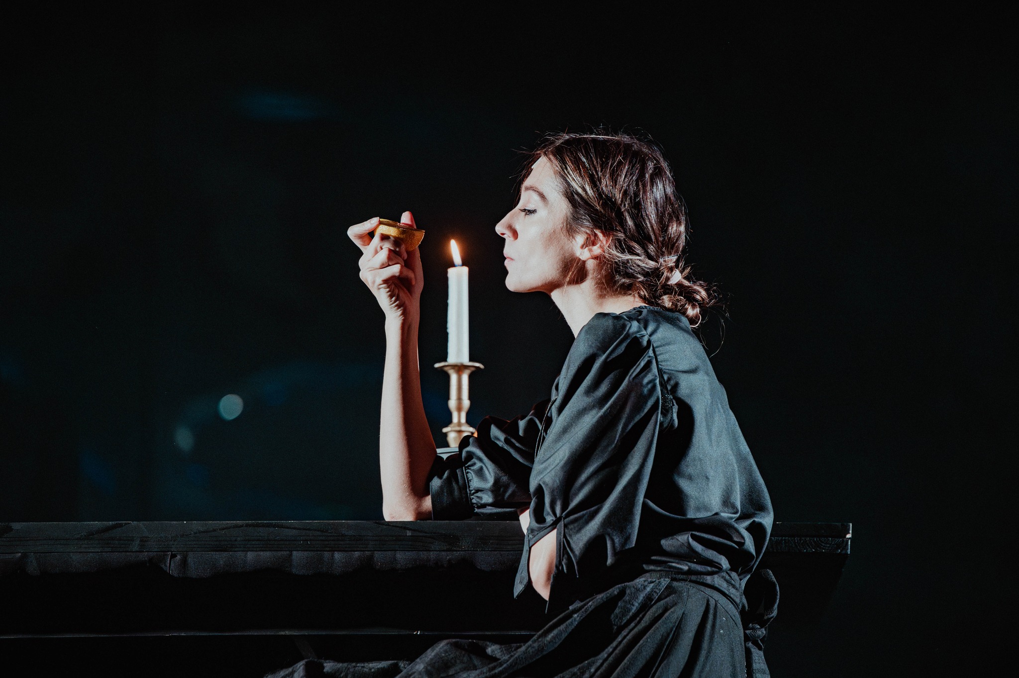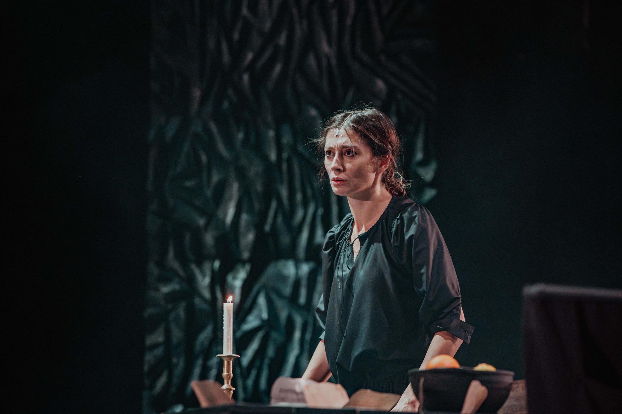 Și pentru a risipi în general fricile tuturor, minunat mișcați prin scenă de Daniel Dragomir în fotografii low-key ce le păstrează misterul negrului sub lumina de obicei puțină (light design Andrei Ignat și Andrei Măjeri), uneori doar a lumânărilor pe care actorii le țin în mână, decupând memorabil portrete single sau de grup pe care puținele pete de culoare (de obicei fructe!) le fixează negreșit în memoria vizuală a spectacolului. Încurajați (și foarte bine pregătiți muzical de Antonela Barnat) ori măcar îmblânziți de Politiki Lyra (fermecător mângâiată live de arcușul lui Feras Sarmini, pentru mine la o excelentă primă întâlnire cu instrumentul și vibrația lui înaltă) care completează tabloul acustic a capella al spectacolului (unde excelează, din nou, Lorena Luchian alături de Vlad Corb, cele două voci care mi-au înfipt în timpan acest sppectacol).