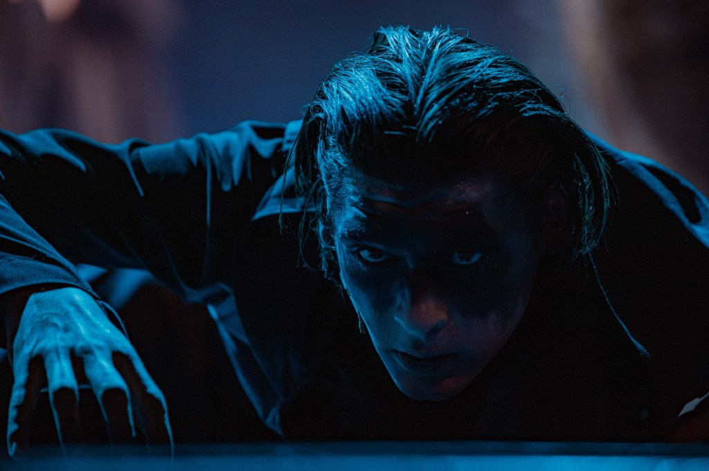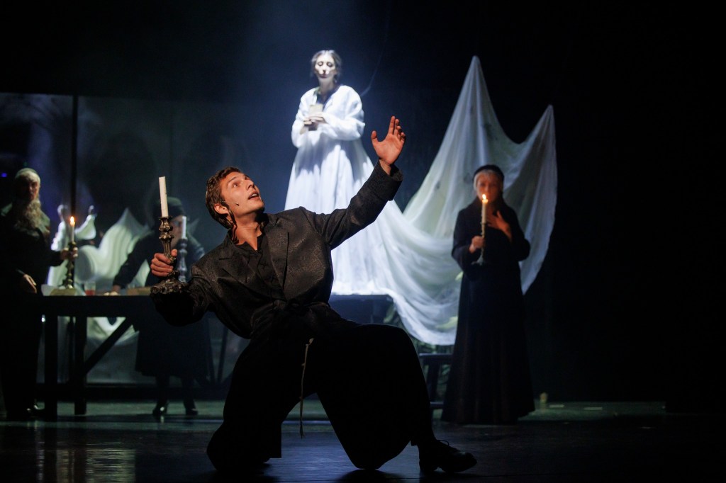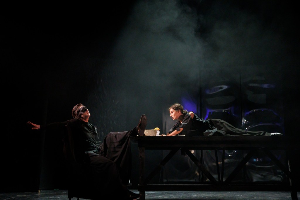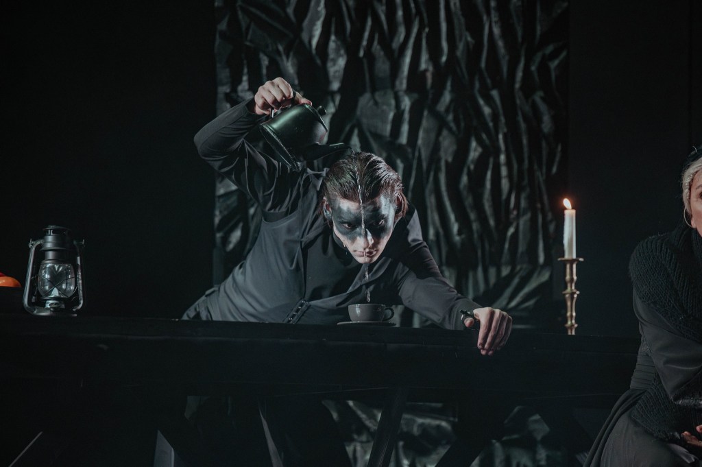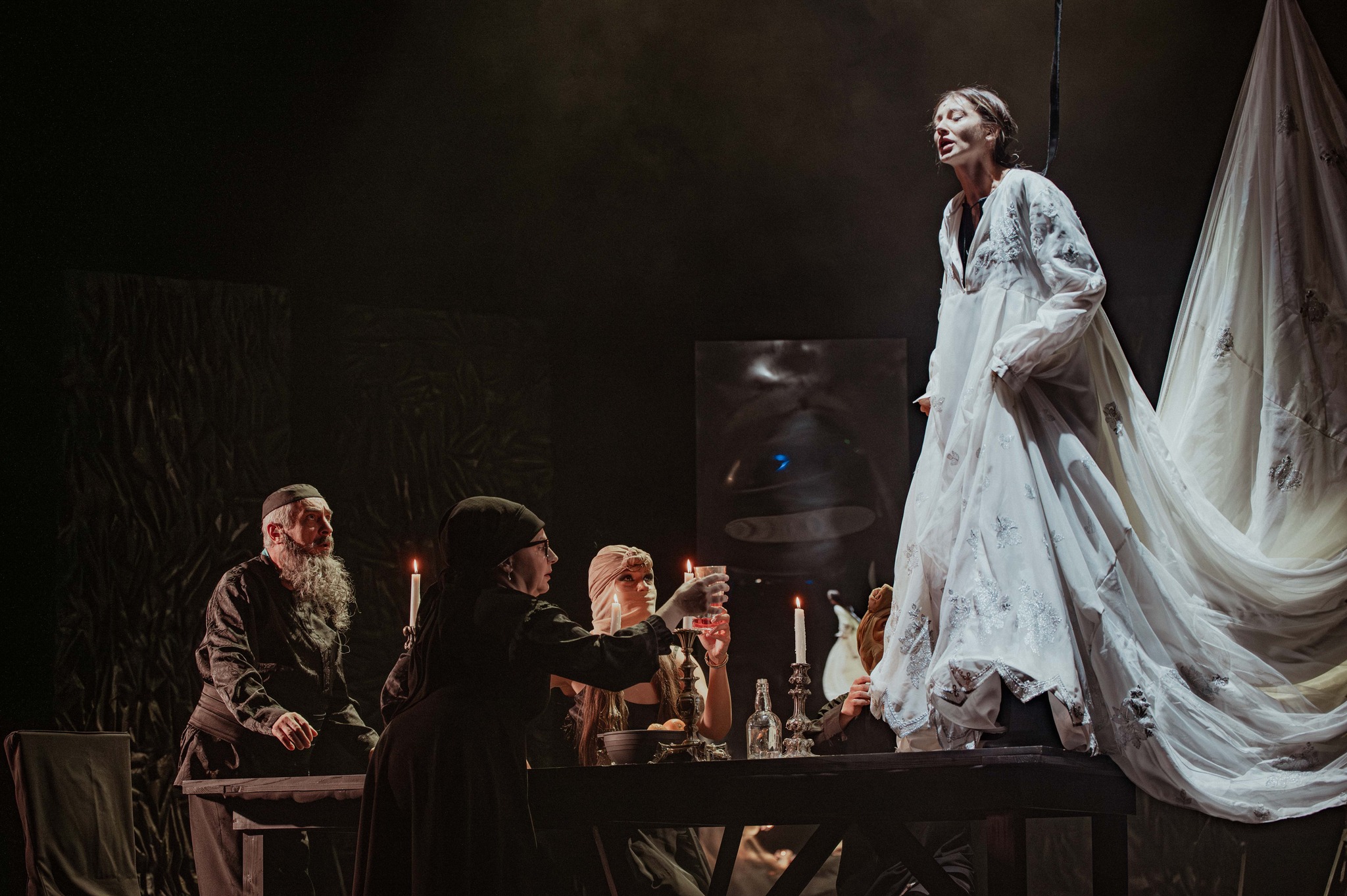 Și pentru a risipi în general fricile tuturor, minunat mișcați prin scenă de Daniel Dragomir în fotografii low-key ce le păstrează misterul negrului sub lumina de obicei puțină (light design Andrei Ignat și Andrei Măjeri), uneori doar a lumânărilor pe care actorii le țin în mână, decupând memorabil portrete single sau de grup pe care puținele pete de culoare (de obicei fructe!) le fixează negreșit în memoria vizuală a spectacolului. Încurajați (și foarte bine pregătiți muzical de Antonela Barnat) ori măcar îmblânziți de Politiki Lyra (fermecător mângâiată live de arcușul lui Feras Sarmini, pentru mine la o excelentă primă întâlnire cu instrumentul și vibrația lui înaltă) care completează tabloul acustic a capella al spectacolului (unde excelează, din nou, Lorena Luchian alături de Vlad Corb, cele două voci care mi-au înfipt în timpan acest sppectacol).