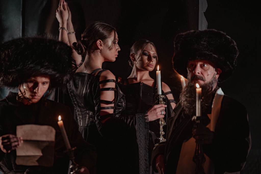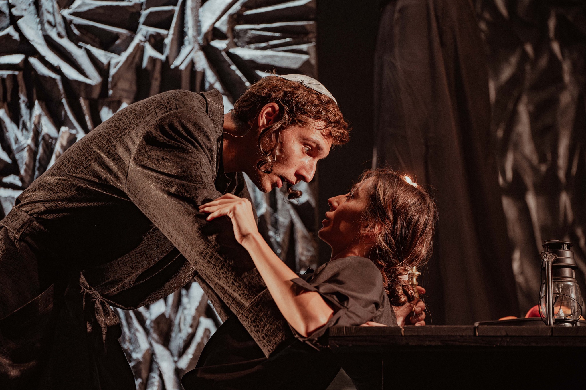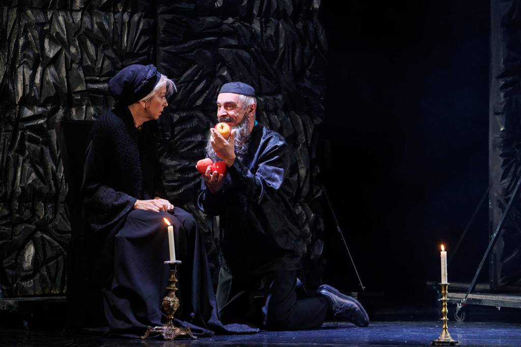 De cealaltă parte Rahela, o fată frumoasă cu haine cernite (Lorena Luchian într-un rol memorabil, care cred că va face carieră lungă pe scena Teatrului Evreiesc!) ridicată ca o speranță din toată pulberea asta neagră cu miros de tămâie și ceară arsă, parcă numai să urzească întruna giulgiuri din fire de doliu în rama neagră a războiului de țesut cu care-și întreține modest existența, în timp ce sufletul ei poartă cuminte moștenirile altor războaie. Rămase murmurând de durere sub privirile satisfăcute ale diavolului, mereu de față, prin crăpăturile pereților de jar poate abia stins, în mobilele și ele îndoliate de dor și jălanie (după ultima trecere a cazacilor care a măcelrit populația evreiască în acest colț polonez de lume – acțiunea este plasată în anul 1665 în Yultishk, un mic orășel polonez de la granița cu Ucraina), în glasul stins și mințile rătăcite ale mamei căreia îi alină tot mai greu spaimele amintirilor.