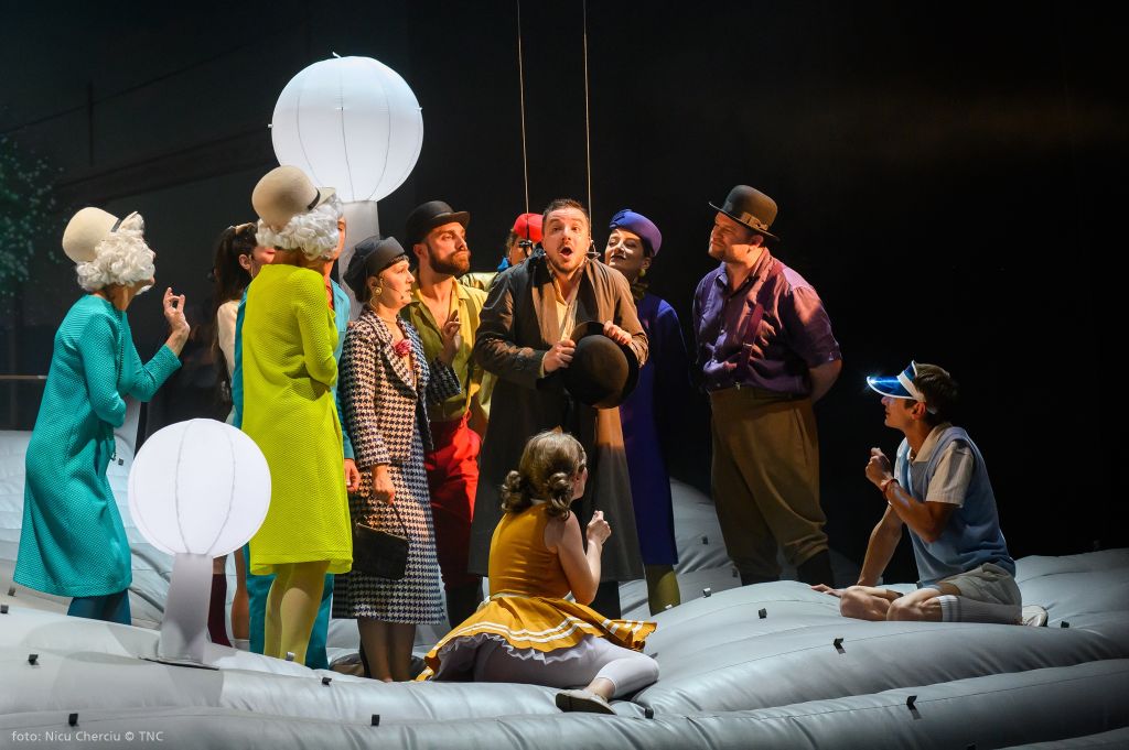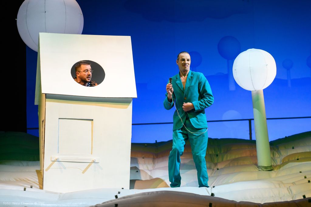 La capătul celălalt al aceluiași uman, obiectul urii sale, mereu alături numai spre a-i face posibile definițiile: Visătorul. Cu toată nevoia lui de joc, cu nădejdea naivă că va putea să zboare, cu tot curajul de a se desprinde și a se înălța, cu toată forța gândirii sale și curiozitatea ființei lui de a scruta orizonturi mai largi, de a vedea dincolo de dealuri, poate o nouă vale pe care să o deschidă vraiște spre a fi admirată și de omul înțepenit în certitudini căruia nu-i pot fi profețite decât nenorociri. Așa că se ridică preventiv zeci de centimetri deasupra pământului (și certitudinilor sfintei scânduri), gonflând naiv (!), întru derută, un mirific peisaj englezesc cu look de pictură de Henri Rousseau le Douanier, preferat de Adrian Damian în ingenioasa lui soluție scenografică (excepțional pusă regizoral în valoare și întipărită în vizual de costumele viu colorate ale Luizei Enescu) lui Chagall, cealaltă indicație a dramaturgului după cum zice la carte. Coline gonflabile pline de văzduhul prietenos al visării și imaginației creatoare, înțesate de pomi, personaje și dialoguri absurde, englezești, străjuite de un cottage primitiv din carton alb (ca o căsuță pentru păsărele) numai bun de aruncat în aer, în care Gábor Tompa l-a vârât magistral pe deja veteranul personaj ionescian Bérenger, într-un spectacol genial de teatru absurd. Un eseu teatral-filosofic despre visele de eliberare și glorie ale omului și o excelentă satiră a vieții sociale ce pre(și post)fațează regimurile abuzive totalitare. O joacă de-a timpul și de-a ipotezele ciocnirilor de toate felurile (din universuri absolut paralele!) în cel mai articulat discurs teatral ionescian despre condiția umană și condiția artistului, într-un cadru oniric ce are să ne adăpostească pentru aproape două ceasuri toate spaimele din absurdul cunoscut.