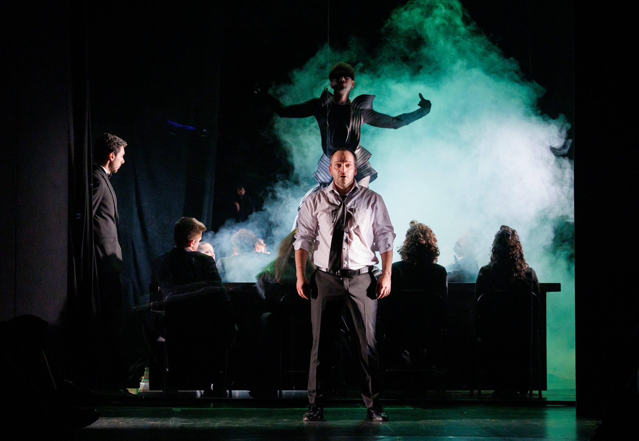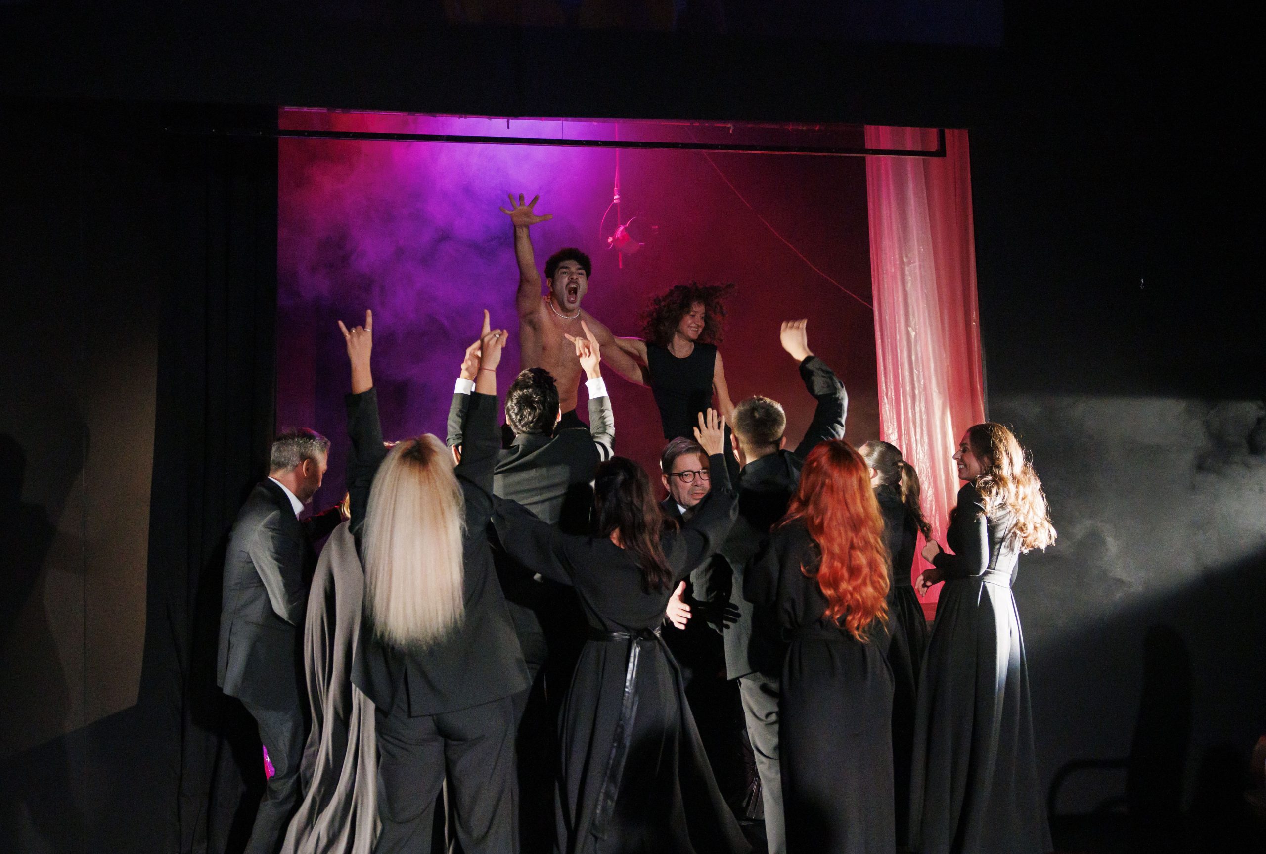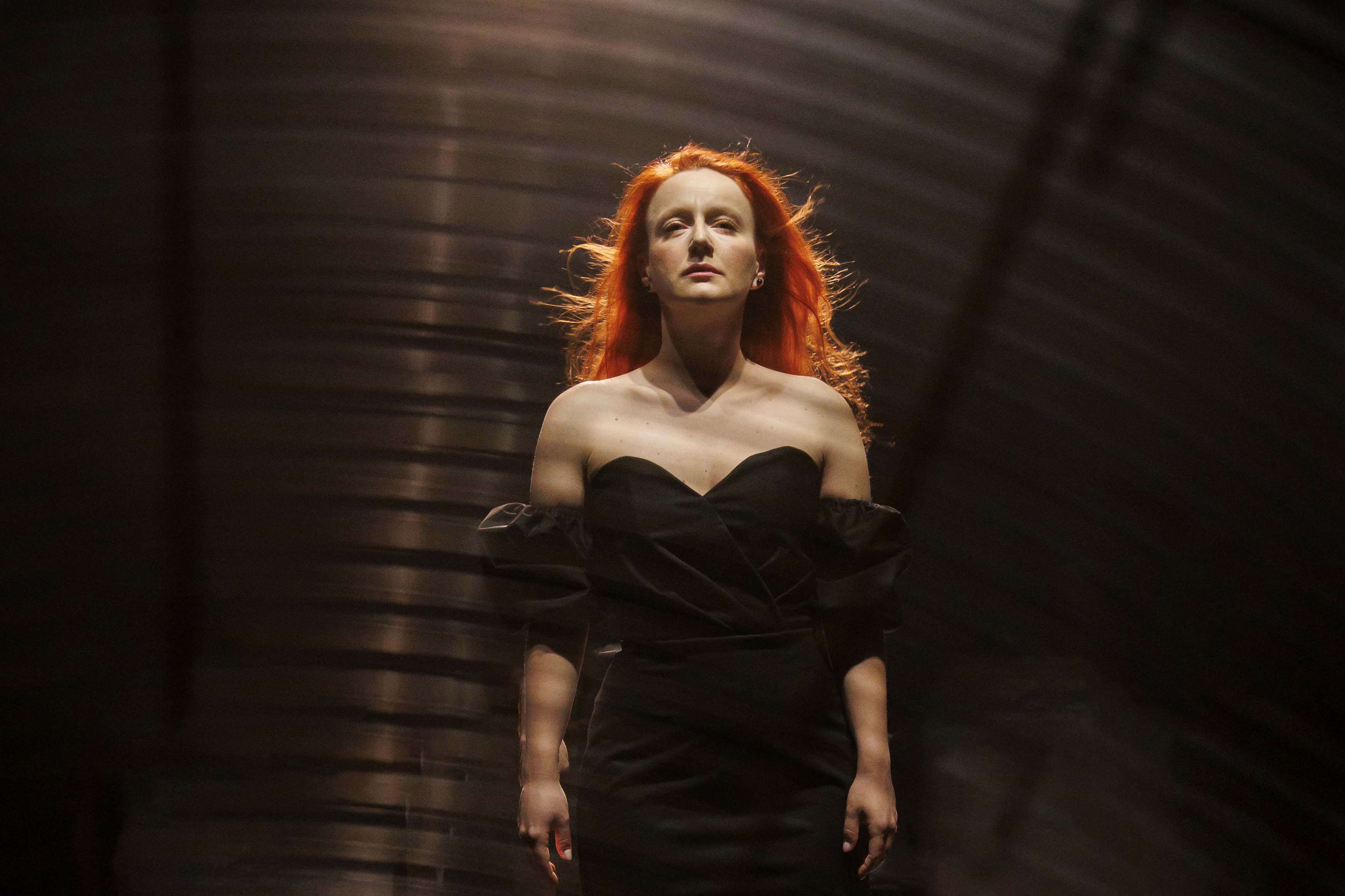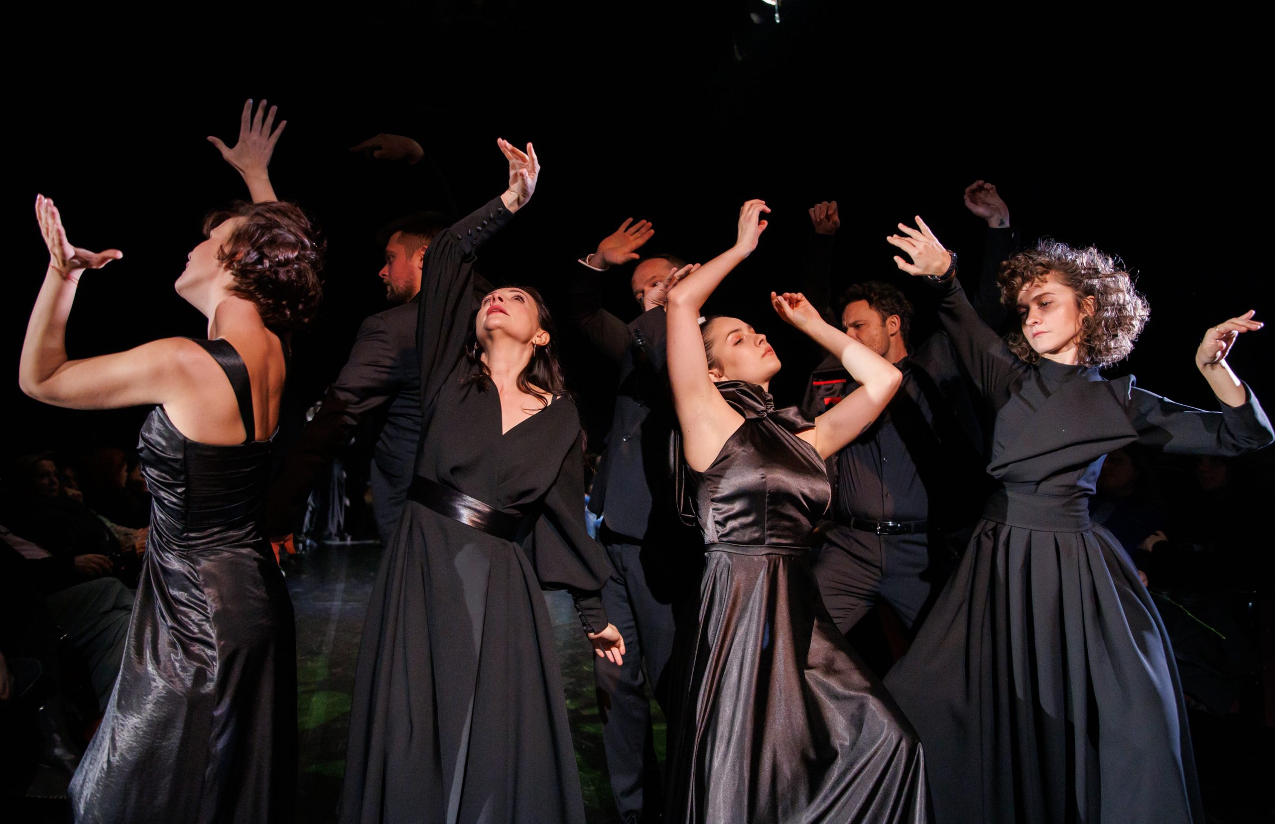 Așteptări care vor fi cu mult întrecute de formatul propus, în care predomină austerul scenografic (doar cantitativ, pentru economia unui spectacol de aproape patru ore) și bogăția de idei, ceea ce face cu atât mai spectaculoase prestații aproape impecabile ale unor actori printre puținele pete de culoare, păstrate în general pentru fundal (unde i se va deschide spectacularului un locativ generos, în spatele oglinzii în care suntem siliți să ne privim), prelungit în câteva scene în spațiul de joc în care dau uneori năvală toți călătorii, aglomerându-l până la sufocare (în general cu scurte coregrafii de grup care individualizează momente din desfășurarea acțiunii și sporesc sau sparg tensiunea dramatică, după caz), ori pe pereții negri îmbrăcați vremelnic cu imagini ale unui prezent continuu ce-și cere drepturile atemporalului atent supravegheat din care se revendică. Al mărturiilor, al mirării, al îndoielii, al interogării, al iscodirii, al dovedirii și al răzvrătirii umanului, atent ascuns în personaje sub măștile sociale pe care sunt nevoite să le poarte și sub costumele negre care le îmbracă pertinent și elegant diferențele (de vârstă și de clasă socială, foarte bine gândite) într-un doliu esențializat, inteligent spart de culoare în momentele cheie ce se cer celebrate prin multă viață. Un negru resimțit la toate nivelurile, prin care se va mișca agitat roșul de neuitat din buclele de foc ale Annei Karenina, o superbă Ana Bianca Popescu care-și confirmă încă o dată statutul de mare actriță, dispusă să joace și să se joace pe viață și pe moarte cu toate culorile și nuanțele acestui personaj labil, orbecăind cu demnitate după ieșirea din matrix. Un personaj tragic în toată splendoarea rătăcirilor sale pe cărările întortocheate ale inimii în care locuiește cea mai autentică iubire, necondiționată, din care e greu să drămuiască celor așezați la masă să se înfrupte și să-și potolească foamea. Cerându-și fără încetare dreptul la viață și la iubire.
