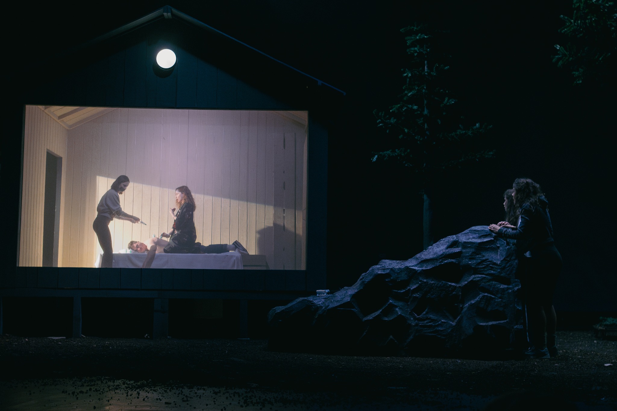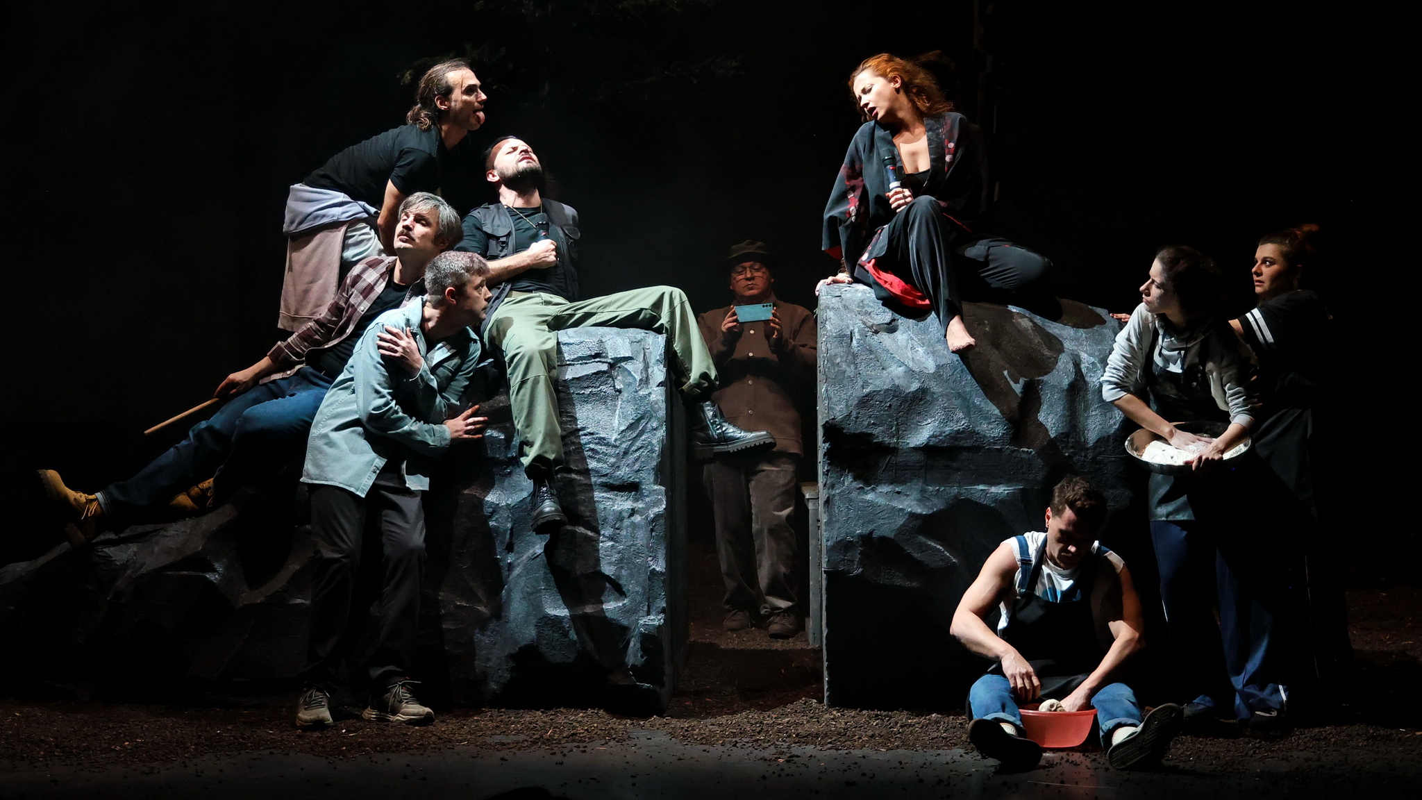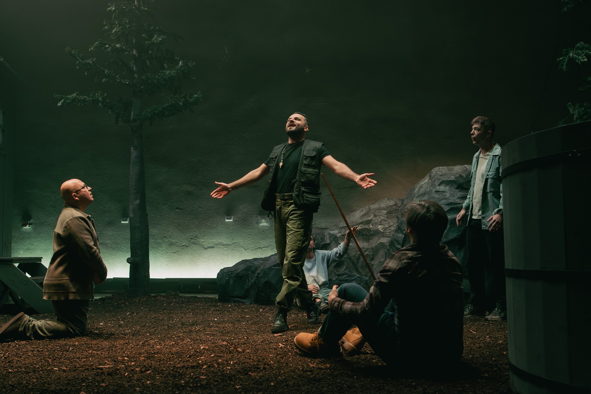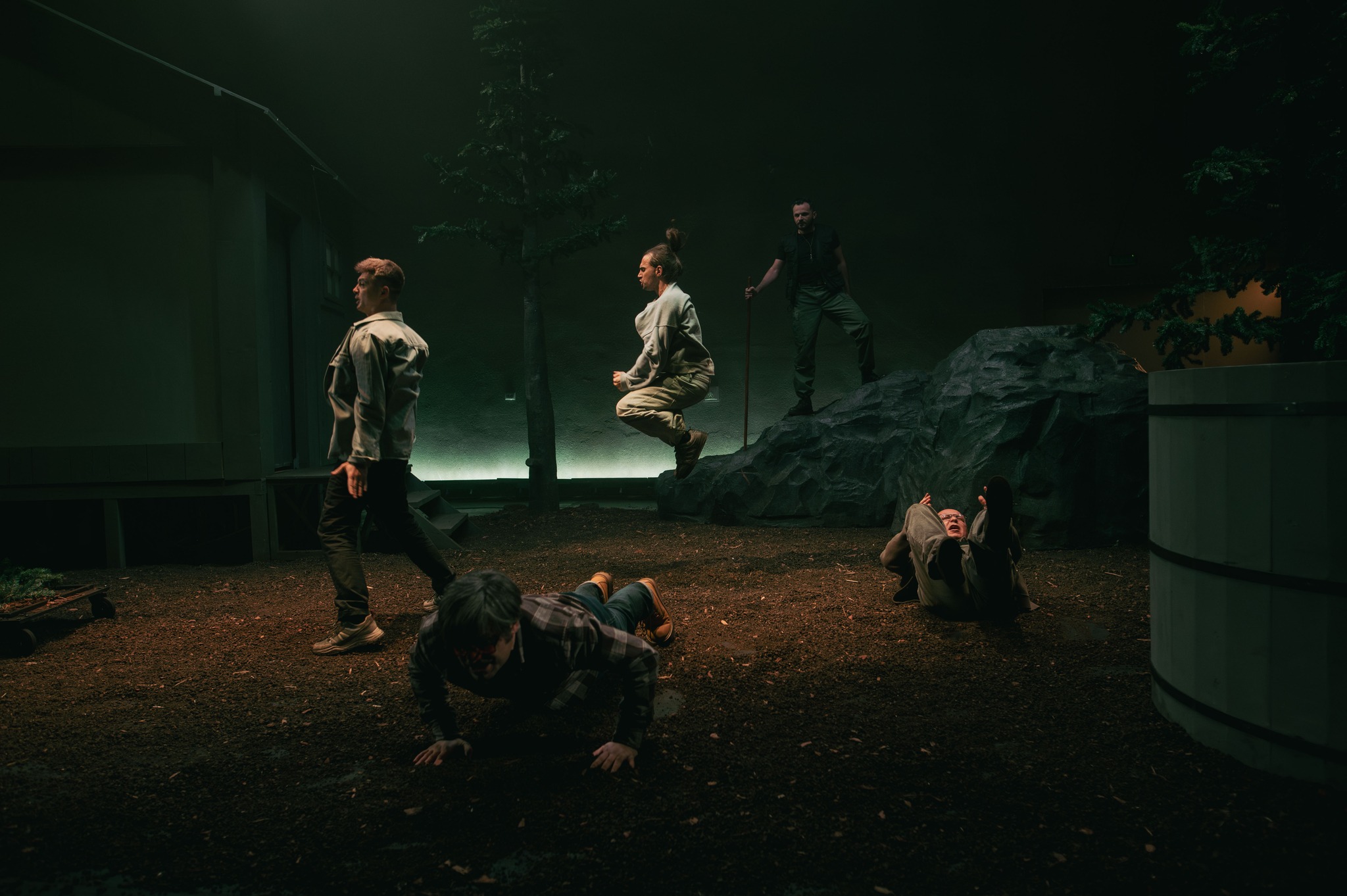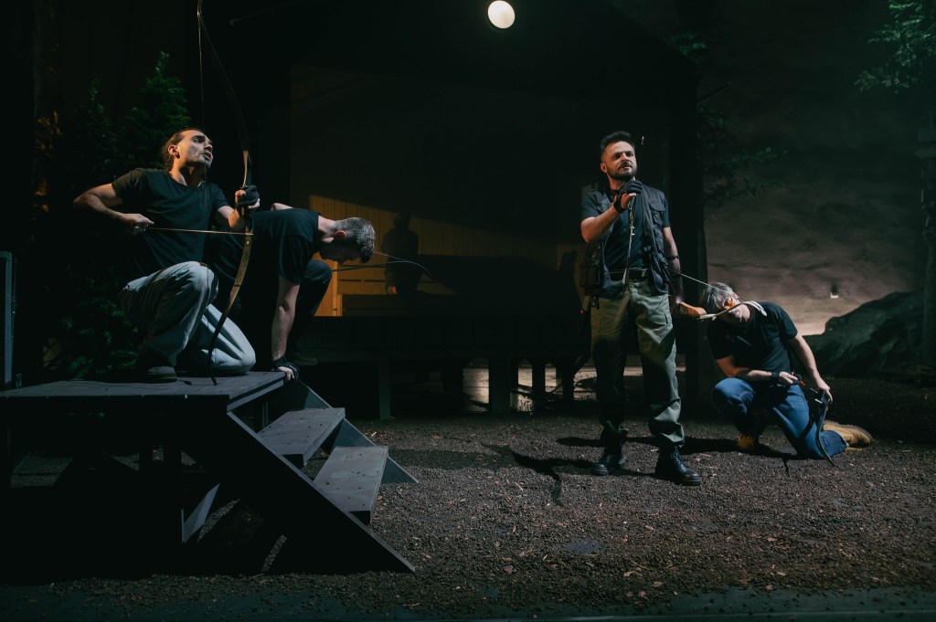 Departe de ochii neasumaților, în două tabere distincte de trezit femeia, respectiv bărbatul, ca ultime redute pierdute ce se cer recucerite în lupta cu civilizația, rupți de o vreme de rădăcinile din natura mamă și aruncați în afara pădurii, printre tot felul de neasumări și simulări caraghioase de definiții personale, regrupați acum în jurul cabanei-saună sau al ciubărului cu apă rece. Foarte ingenioasă soluția scenică găsită de Andrei Măjeri împreună cu Sabina Reus, care permite individualizarea scenelor nu doar fără ca grupurile să se incomodeze unul pe altul, ci pregătindu-le temeinic apropierea pentru marea confruntare (într-o geografie ofertantă și pentru micile întâlniri care o preced și-i îmblânzesc pornirile), comentând prin decupaje și încărcare cu sens obiectele scenice, împinse cu umor asortat și către simbolistica autohtonă, puternic susținută de universul sonor al lui Magor Bocsárdi care s-a jucat asumat pe teme folclorice (permițându-i minunate asumări coregrafice și lui Alice Veliche, materializate în sincronizări ale ludicului ce particularizează grupurile după gen, preocupări, teme și ierarhii ad-hoc, în care prevalează antrenamentele fizice tip sală (!) învelite în mișcări de dansuri tradiționale). Augmentând prin dispunerea lor (chiar și a celor mobile, precum copacii și stâncile) particularitățile opozabile și provocările feminin/masculin (lumină/întuneric, cald/rece, comfy/incomod, plat/abrupt) definite prin câte un element central care asigură intimitatea de grup în chip delicat sau aspru (sauna respectiv ciubărul) și permit descompunerea în tablouri vizuale pertinente, precum icoanele sau advertorialele TV în rama cabanei ori hora și glumele practice din ciubăr, devenit în cele din urmă tabla pe care este demonstrată teorema lui Lagrange (teoria grupurilor!), ce pune în superbă paranteză teatrală toate luptele lor pentru egalitate, altele decât cea de șanse (comentată și ea prin stâncile în oglindă ale celor două tabere).