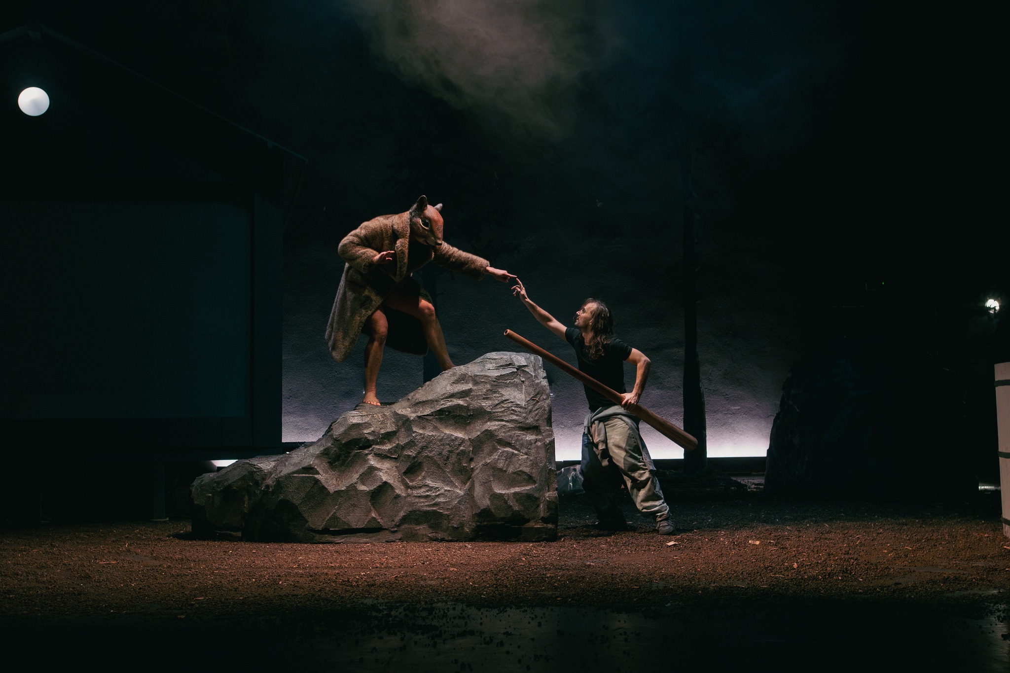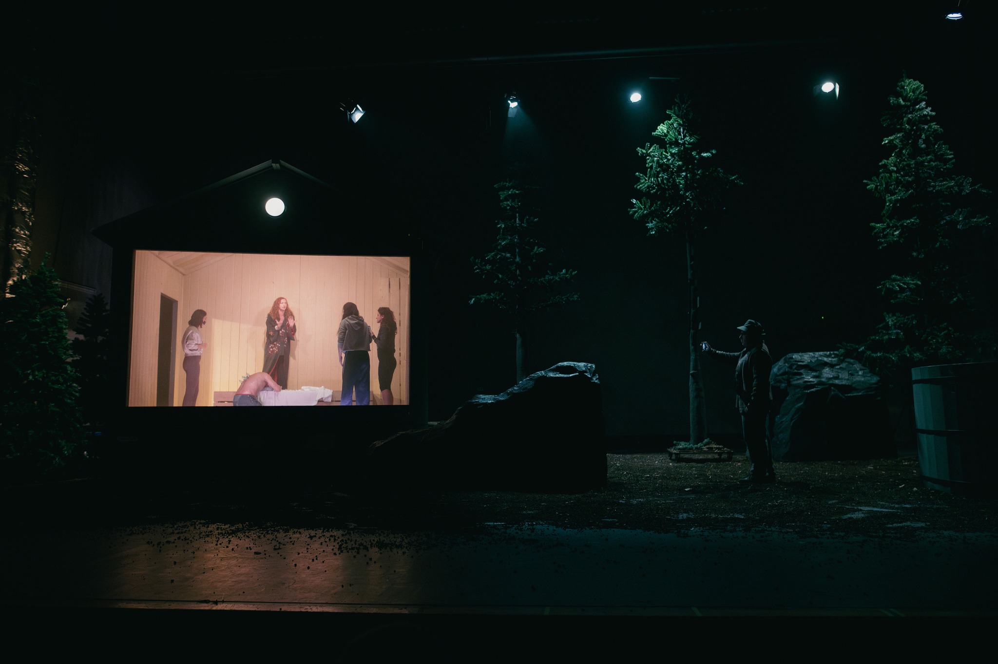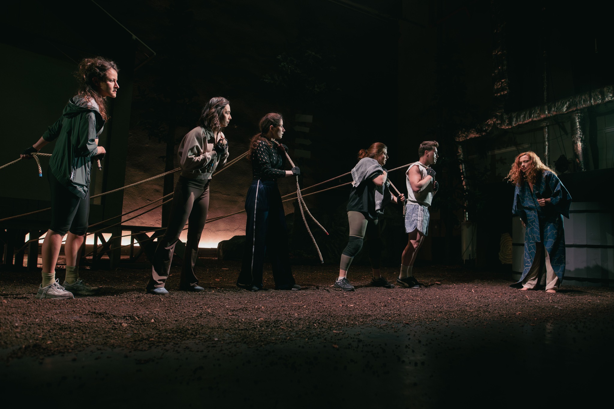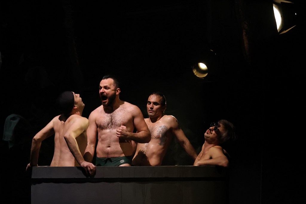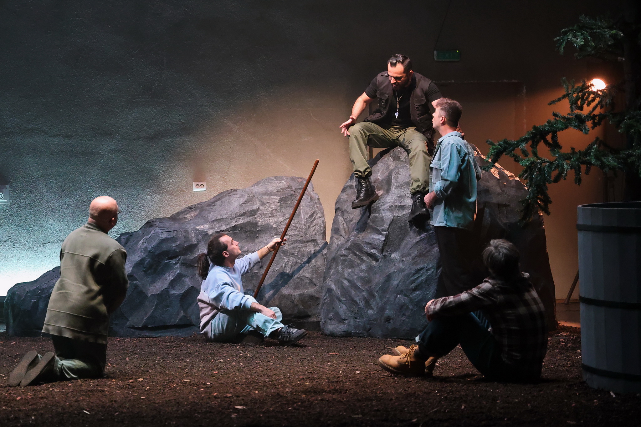 Departe de ochii neasumaților, în două tabere distincte de trezit femeia, respectiv bărbatul, ca ultime redute pierdute ce se cer recucerite în lupta cu civilizația, rupți de o vreme de rădăcinile din natura mamă și aruncați în afara pădurii, printre tot felul de neasumări și simulări caraghioase de definiții personale, regrupați acum în jurul cabanei-saună sau al ciubărului cu apă rece. Foarte ingenioasă soluția scenică găsită de Andrei Măjeri împreună cu Sabina Reus, care permite individualizarea scenelor nu doar fără ca grupurile să se incomodeze unul pe altul, ci pregătindu-le temeinic apropierea pentru marea confruntare (într-o geografie ofertantă și pentru micile întâlniri care o preced și-i îmblânzesc pornirile), comentând prin decupaje și încărcare cu sens obiectele scenice, împinse cu umor asortat și către simbolistica autohtonă, puternic susținută de universul sonor al lui Magor Bocsárdi care s-a jucat asumat pe teme folclorice (permițându-i minunate asumări coregrafice și lui Alice Veliche, materializate în sincronizări ale ludicului ce particularizează grupurile după gen, preocupări, teme și ierarhii ad-hoc, în care prevalează antrenamentele fizice tip sală (!) învelite în mișcări de dansuri tradiționale). Augmentând prin dispunerea lor (chiar și a celor mobile, precum copacii și stâncile) particularitățile opozabile și provocările feminin/masculin (lumină/întuneric, cald/rece, comfy/incomod, plat/abrupt) definite prin câte un element central care asigură intimitatea de grup în chip delicat sau aspru (sauna respectiv ciubărul) și permit descompunerea în tablouri vizuale pertinente, precum icoanele sau advertorialele TV în rama cabanei ori hora și glumele practice din ciubăr, devenit în cele din urmă tabla pe care este demonstrată teorema lui Lagrange (teoria grupurilor!), ce pune în superbă paranteză teatrală toate luptele lor pentru egalitate, altele decât cea de șanse (comentată și ea prin stâncile în oglindă ale celor două tabere).