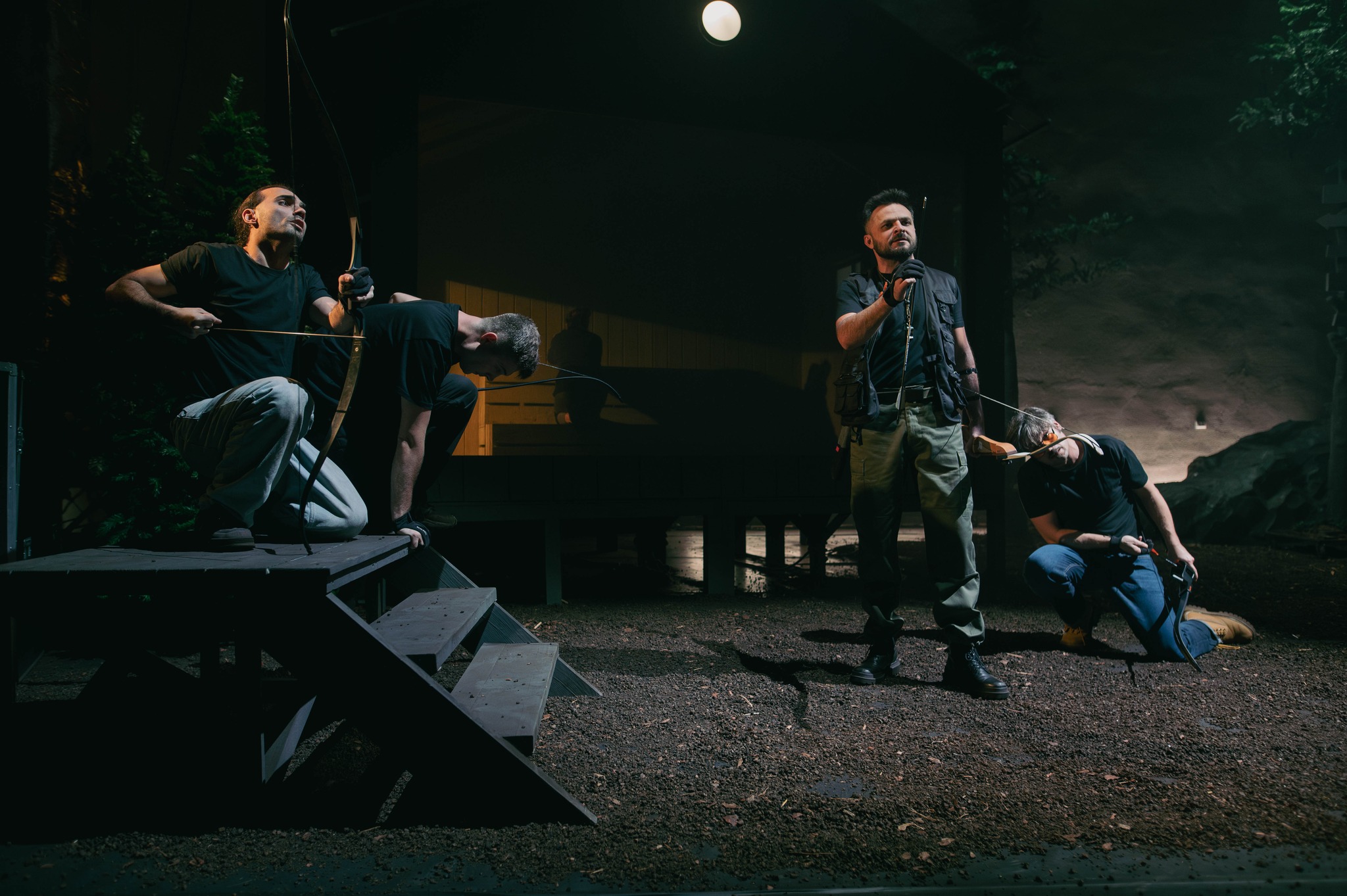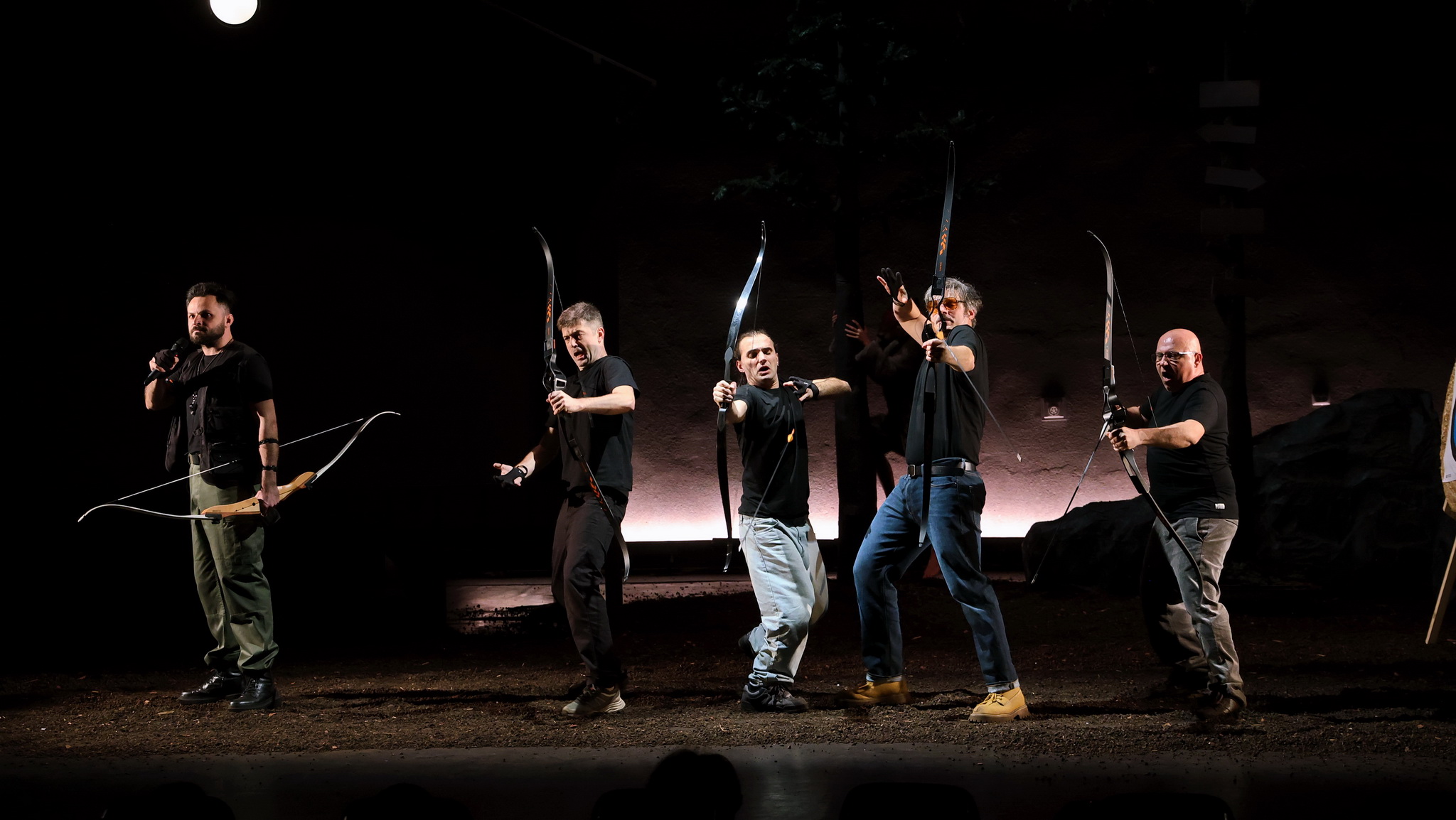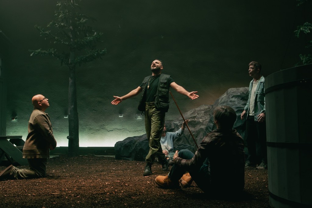 Cu masculinul, adunat hau lângă hau pentru experiență, adrenalină și disciplină în tabăra lupilor alături de pildele lui Arian (puse în valoare pe fundal canto!), care-i va antrena să-și ia puterea înapoi înfruntând epuizarea fizică, frigul și foamea până vor învăța din nou să-și marcheze corect teritoriul bărbăției (în jurul femeilor pe care vor dori să le însămânțeze). Teritoriu ocupat vremelnic de tarabele cu mărțișoare, bijuterii și invitații de nuntă ale lui Felix (Horia Butnaru, care deschide și spectacolul cu Imnul cetățeanului suveran în plin proces de afirmare de sine, altfel încă rătăcind înarmat virtual pe culoarele jocurilor video în care a crescut (!)), standurile cu uleiuri esențiale ale lui Emilian (simpaticul Răzvan Bănuț care-și prezintă delicios momentul de iluminare), dar și petrecerile psy, goa și tehno organizate de David (Bogdan Amurăriței, singura schimbare reală de vibe!), reșițeanul care a cutreierat lumea învățând și el să-și ridice spiritual clienții la un alt nivel, prelungit acum în puterea buciumului (!). Un teritoriu acum select, căruia e nevoit să-i dea multă vreme ocol Lucian (Cătălin Ștefan Mîndru), membrul non grat al grupului proaspăt format, un tip aparent fragil și complexat, adept al diminutivelor, pedepsit de maestru încă de la prima slăbiciune a vezicii, păstrat la îndemână pentru a întocmi lista de așa nu-uri ale lui Arian. Care-și prezintă și așa da-urile din filosofia de viață în scena de tir cu arcul, ce stabilește esența măreției bărbătești (fă-te mic, să te cuprindă lumea!), puțin înainte ca Galina să prezinte filosofia feminină de viață și să arunce durerea cumulată proaspăt colorată spre a fi lepădată în Univers de cursantele ei.