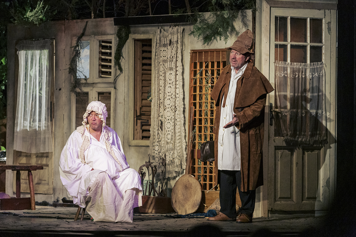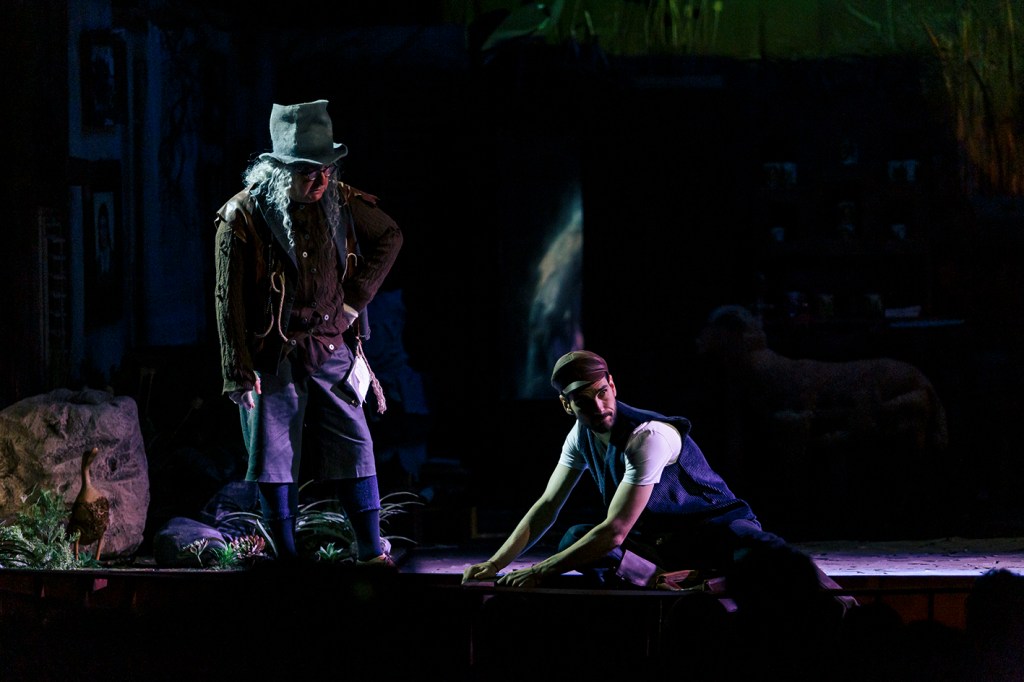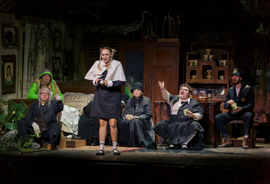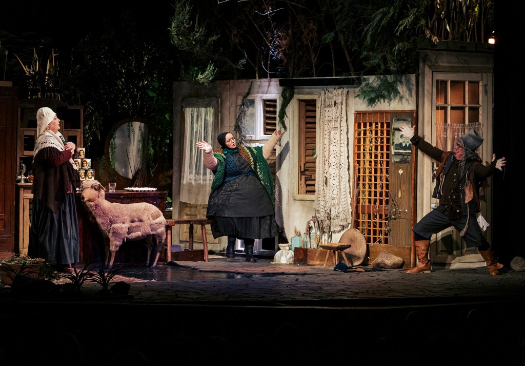Combinate ingenios în istoriile personale ratate ale celor ce-și ciocnesc cu chiot destinele hilare, prinse în spațiul dezolant al unei prăvălii lacustre înțesată de tot felul de obiecte (unele de-a dreptul spectaculos puse în rame teatrale, precum oaia sau Fecioara și scaunul de WC din dulap (!)), bine adaptată de Iuliana Vîlsan la scena Sălii „Radu Beligan” a Comediei, invadată de vegetația care-și continuă drumul către sălbăticie prin ușile și ferestrele acestui magazin/locuință, mărginit în avanscenă de debarcaderul unde este ancorată o ambarcațiune arareori folosită (curach, una dintre bărcile cu cadru de lemn acoperit cu pânză sau piele impermeabilizată, specifice zonei, un mijloc obișnuit de transport prin care se face conectarea cu alte insule și cu continentul). Pregătită să aducă spre noi, de partea civilizată a lucrurilor, reprobabilul și reproșabilul pe care se pune atent degetul în fiecare colțișor adus împreună aici de pe această insulă sărăcăcioasă și primitivă (bine articulată în costume și machiaje), loc ideal de joacă pentru mitizări și credințe locale mărunte, explorate atent, cu lumină puțină, de light design-ul lui Alin Popa și video design-ul Dilmanei Yordanova, care-i pun în valoare micimile de toate felurile. Și mângâiate tradițional irish de arcușurile lui Adrian Piciorea.