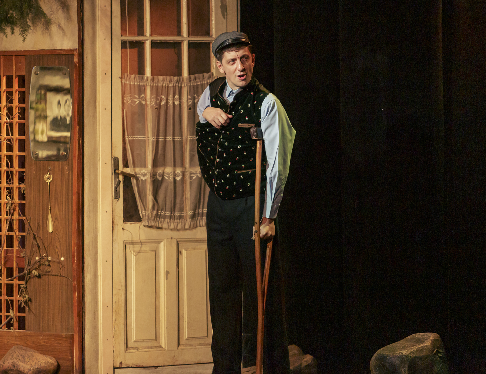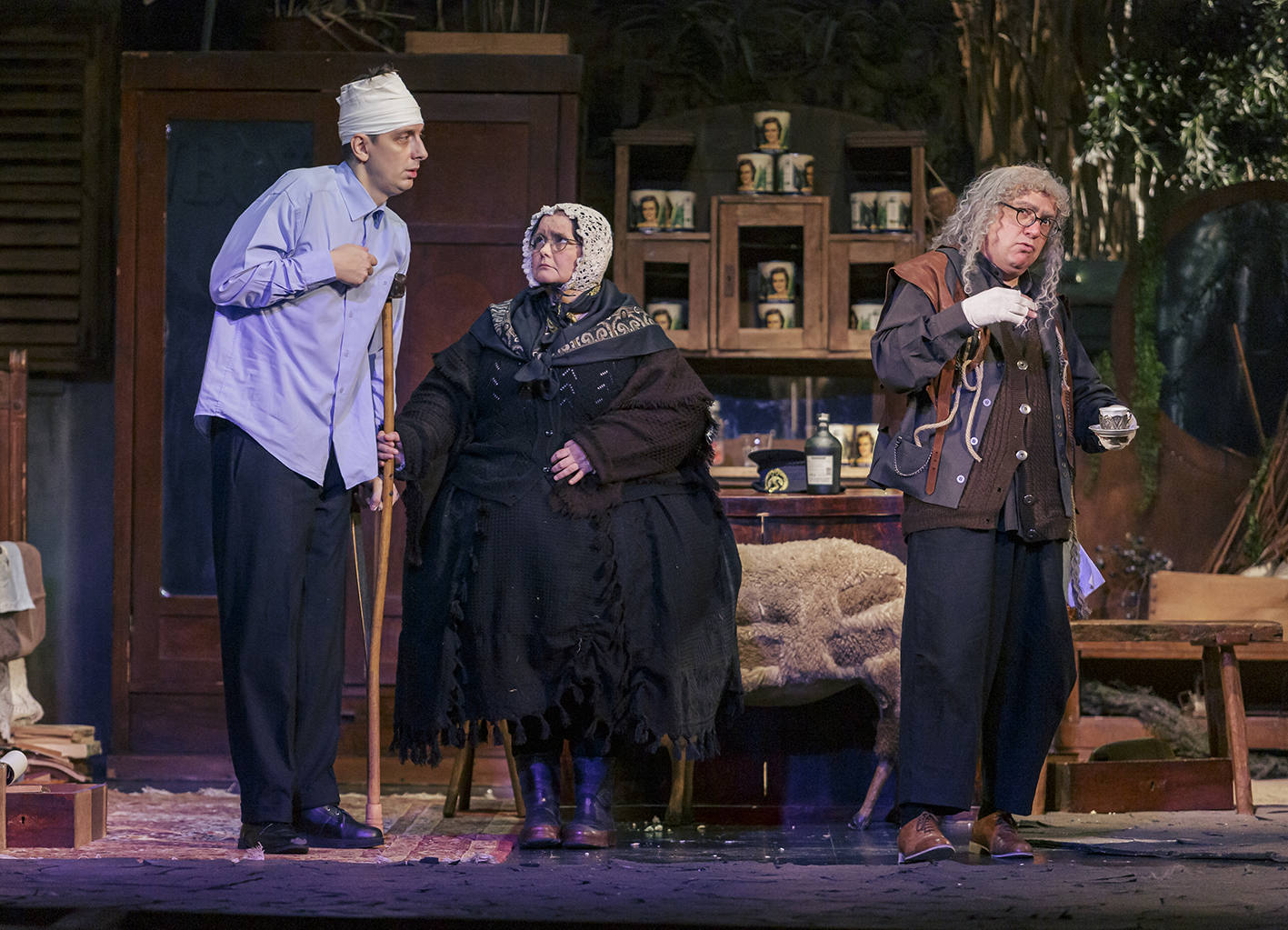 Un cadru ideal în care un personaj precum orfanul Billy Claven (Bogdan Cotleț rezervat și delicat, pregătește cu grijă momentul de contrapunct care vine firesc peste constructul personajului lui), cu gravă infirmitate fizică și socială (și deci cel mai îndreptățit să caute soluții de evadare pe care le găsește între cărți și vaci ori pe platourile de filmare) are să-și târâie piciorul sprijinit în cârjă până să-și sfârșească existența banală visând la normalitate și civilizație (nu înainte să-și încerce norocul!), alături de mătușile lui de împrumut, una care vorbește cu pietrele (Kate Osbourne), alta care ascunde dulciuri (Eileen Osbourne), așa cum sunt consemnate chiar în Arhiva sociologică Inishmaan și prezentate în caietul-program (!). Cărora le dau savuros viață Emilia Popescu și Dorina Chiriac, excelente actrițe ale genului comic, în rolul unor personaje complementare suport pentru crearea atmosferei sociale de pe insulă, pe care le completează exagerat zgomotos efervescentul Marius Florea Vizante (stridentul, infinit melodramaticul și logoreicul Johnnypateenmike, strămoș al jurnalismului profesionist (!), lansatorul de bombe informaționale pândite și culese cu trudă și prezentate emfatic într-un gestual ultrageneros), într-un trio care reprezintă cu succes și foarte mult umor (precis decupat în fiecare scenă după personalitatea lor artistică) sexagenarii de pe insulă, reprezentanți de seamă ai istoriei instituției bârfei pe aceste meleaguri. Acea parte a populației prea bătrână să mai apuce calea nouă pe care ar putea să o deschidă revoluția cinematografică propusă în destinele personajelor lor înțepenite între cutii de mazăre, de unde-și pretind fără încetare ascendentul moral asupra generației tinere, cea care visează să iscodească lumea cu telescopul în timp ce se dă în bărci, doar-doar o prinde vreunul un rol în vestitul film care le poate deschide navigația către Pământul Făgăduinței („tot tineretul nostru frumos și talentat care o să-și facă veacul în America”, după cum îi prezintă Johnnypateenmike).