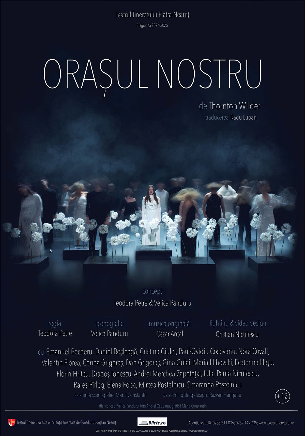 Descompus sub greutatea vieților groaznice și minunate deopotrivă, orașul nostru se recompune după nouă ani pentru reevaluare (mai ales emoțională) pe creasta dealului, sub semnul fatidicului pe care Velica Panduru îl ridică fascinant în scenă în actul final în costumele albe ale fantomelor personajelor ce au trecut pe aici, adăpostite vremelnic sub lespezile negre ce le susțin păpădiile de aducere-aminte, într-o scurtă trecere în revistă – pe care o semnează într-un firesc gest de recuperare pe aleile cimitirului supraviețuitorii Samantha Craig (Elena Popa) și Joe Stoddard (Daniel Beșleagă) – a oamenilor și evenimentelor ce urmează să fie date uitării. Nu înainte de a trage un important semnal de alarmă asupra spectacolului vieții ce se cere celebrată în fiecare clipă însoțită de suflare, într-un dialog cutremurător acum/atunci și aici/dincolo lansat tulburător de Smaranda Postelnicu în discursul despre ființă și neființă prin care Emily Webb își caută împăcarea sub atenta supraveghere a celor în a căror lume pășește (Ecaterina Hâțu, acum Doamna Gibbs de dincolo), însoțită de durerea insuportabilă a celor pe care-i lasă în urmă, mai ales a soțului doborât de povara pierderii (tulburătoare scena în care soții Webb,Corina Grigoraș și Dragoș Ionescu în rolul cuplului care pierde al doilea copil, reconstituie aniversarea de doisprezece ani a fetei, legând cu emoție tristețile una de alta, ca pe o poveste de demult din care s-a șters orice urmă de bucurie), care au acum cea mai mare nevoie de sprijin și de reflecție.