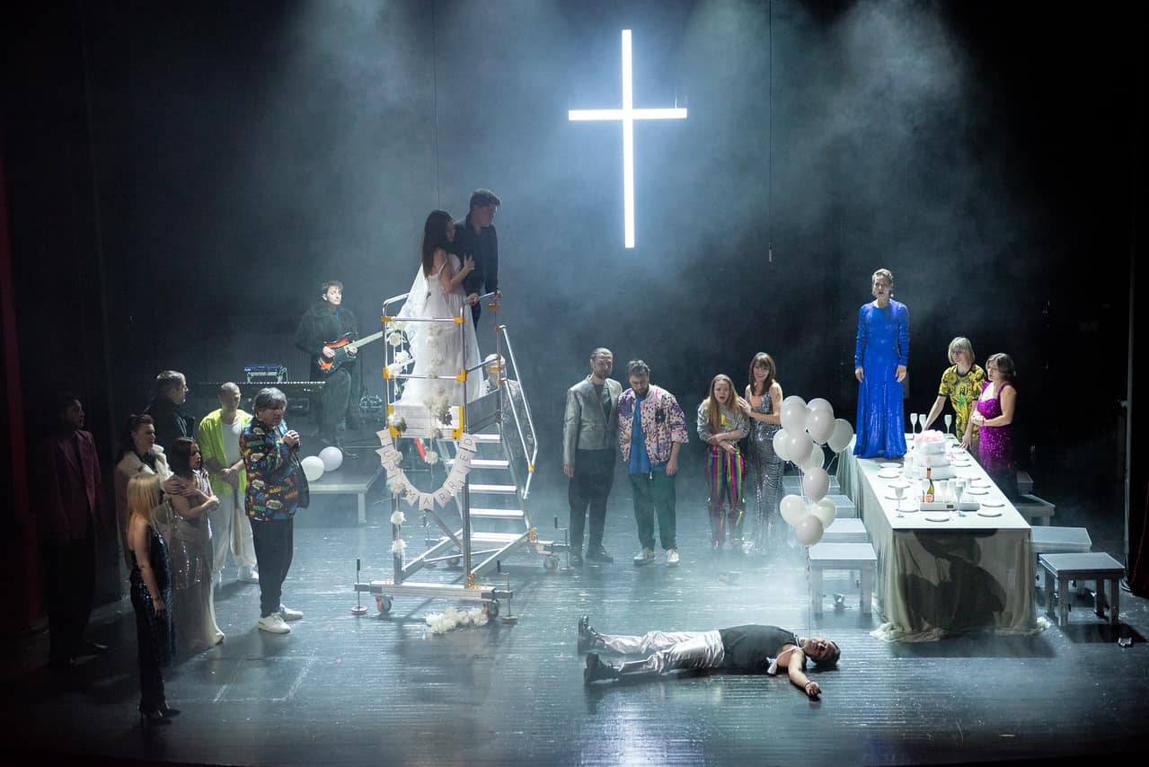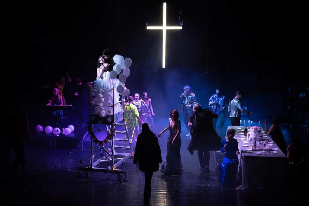 De previzibilul alături de soții lor (care-și impun autoritatea mai degrabă în fața copiilor și a străinilor) nu le poate salva decât retragerea în admiratele grădini proprii ce le gâdilă vanitatea sau evadarea în corul bisericii, în jurul căruia li se învârte aproape tot socialul cunoscut. Și pe care regizoarea îl va pune în valoare în mai multe chipuri, făcând din el un personaj-comunitate căruia Cezar Antal i-a găsit o identitate muzicală (îi păstrează câteva fraze a cappella, atemporale, presărate cu ecouri și invitații la sacru trimise chiar și direct în public (!), care explodează obraznic în câte o răzvrătire – precum cea de clubbing în scena nunții -, impregnată ludic de personalitatea dirijorului corului Simon Stimson – interesantRareș Pîrlog, plimbat între chitară și orgă -). Corul care va însoți atent povestea de dragoste ce se va înfiripa între băiatul familiei Gibbs și fata familiei Webb, George și Emily (Emanuel Becheru și Smaranda Postelnicu, doi minunați parteneri de scenă), care colorează naiv spațiul de joc cu povestea lor de dragoste, pecetluită cu înghețată de fragi (aici există un prea-mult) și legământ în fața Domnului, ducând mai departe (nu foarte!) tradiția și traumele celor două familii (excelentă descriere a căsniciei reușește Dragoș Ionescu, acest domn Webb lăsat să dea sfaturi avizate viitorului ginere), îmblânzind stângaci prin tinerețea și timiditatea lor tot ce ar putea da noimă acestui univers banal, descătușat doar la evenimentele comunității.
