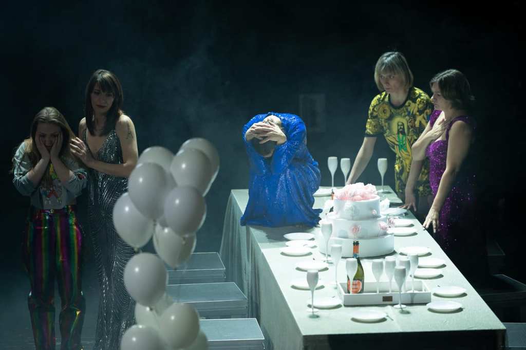 Spre deosebire de alte montări (personal nu am văzut decât două românești și am rămas sub vraja celei semnată de Alexandru Dabija la Excelsior, o convenție funcțională și rotundă ce pune în valoare o comunitate mică și de demult, aproape bicoloră, împinsă excelent în comic, cu o importantă componentă de pantomimă prin care se suplinește magistral lipsa obiectelor în scenă propusă de dramaturg), Teodora Petre optează la Piatra Neamț pentru un derizoriu cotidian recognoscibil, mai de reality show și mai în spiritul teatral al locului, zgomotos, colorat și destul de aglomerat deși păstrează la fel de puține obiecte de decor (efect obținut aproape exclusiv prin folosirea imaginilor video filmate prin teatru și proiectate în timp real pe fundal), dinadins obositor pe alocuri, cu multe stridențe și o accentuată componentă impro, care impune importante ruperi de ritm (ce permit și abordări teatrale foarte diferite stilistic de la o scenă la alta, dar mai ales de la un act la altul, spectacolul transformându-se radical în ultimul act).