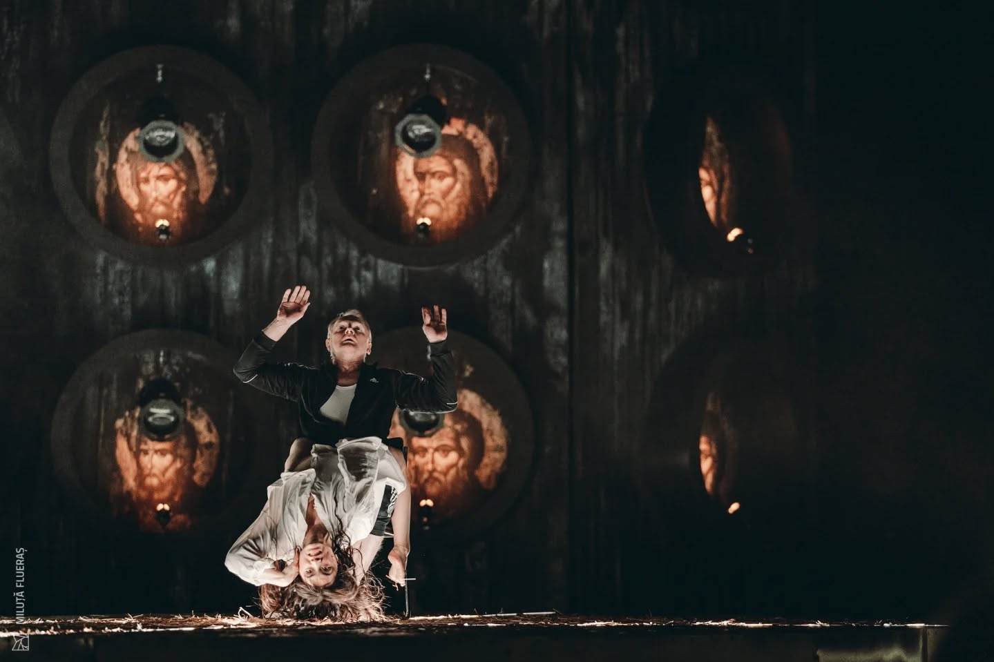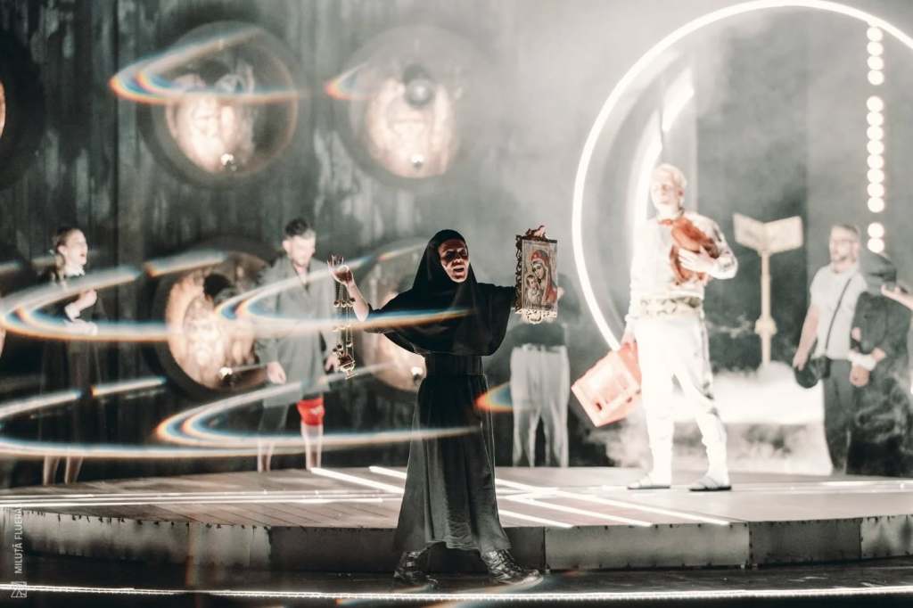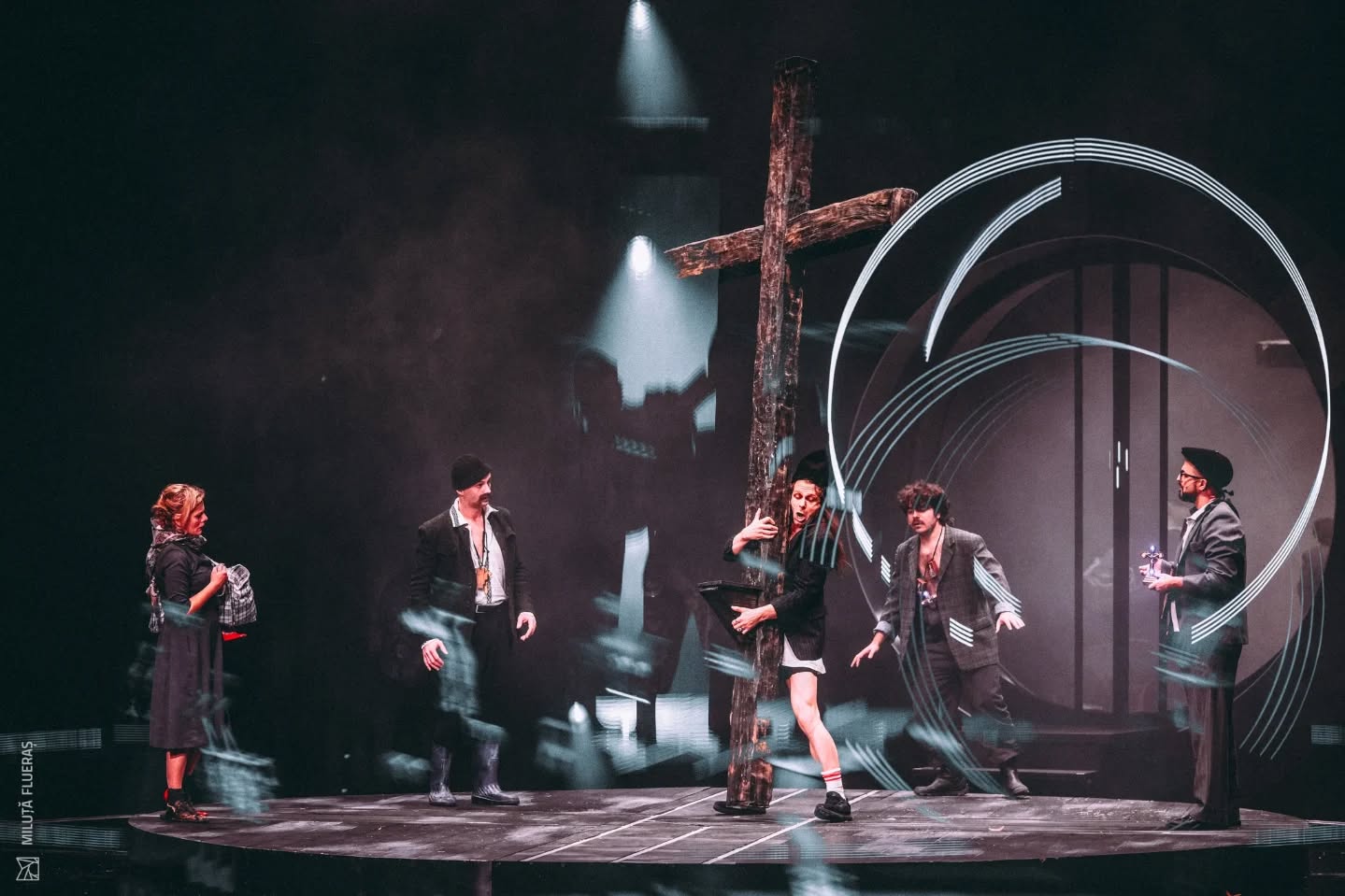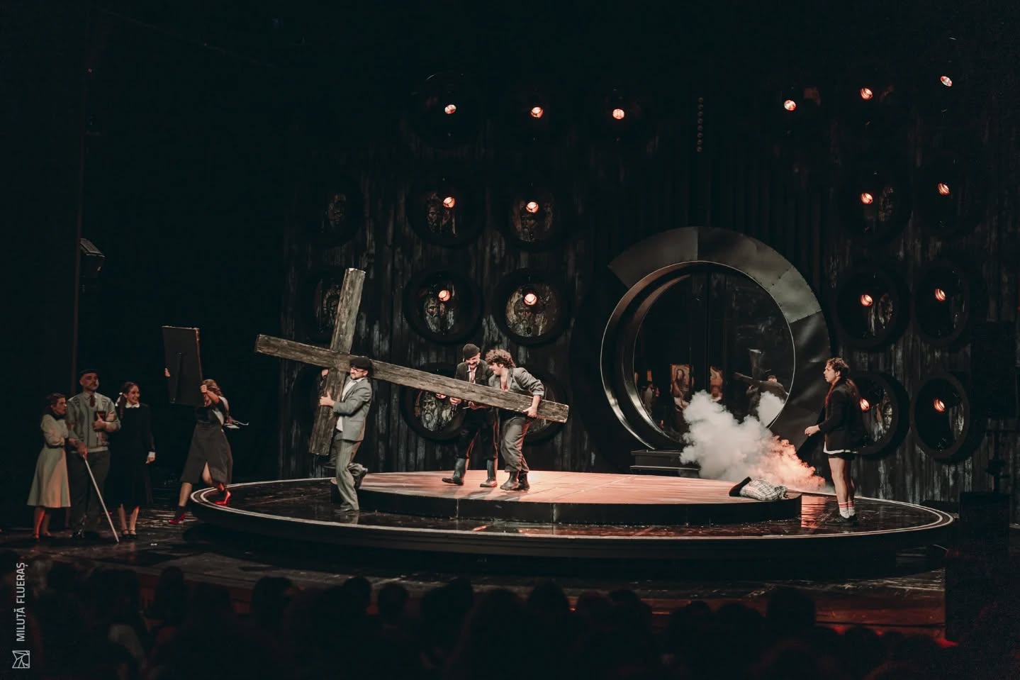 O augmentare vizual-temporală pertinentă a nimbului preaslăvirii deșănțate decupat dintr-o icoană uriașă, expandată parcă din coperta albumului „The Cross of Changes” (Enigma, asociere deloc întâmplătoare!) și replicată la dimensiuni încă și mai generoase pe scândura rotativei care parcă-i amplifică uneori prin mișcare exagerarea pe care i-o descoperi cu uimire printre scrâșnete de dinți încleștându-se revoltat la fiecare nouă întindere de culoare pe pânza îndurerată a habotniciei, fixată în tușe groase de scârțâit apocaliptic, într-un acustic bine înșurubat în posibilitățile vizuale ale contemporanului (excelentă joaca Irinei Moscu de-a consistențele și dimensiunile – mai ales adâncimile – sacrului, care permit un ecleraj foarte special, decupând, prin dispunerea geometrică a elementelor de decor și mixul de reflexii, simboluri pe care se mută lejer accentul poveștii din sacru în profan și invers) din care scenografa smulge cu măiestrie aura uriașă a personajului purtat dincolo și dincoace de veneralul impus (funcțională și ca portal pentru câteva importante declarații regizorale), aducându-l dintre icoanele care-i fixează neatinsul în laicul abrupt pe care Botond Nagy îl imaginează în narativul de-a dreptul folcloric, cu accent unguresc-ardelenesc, căruia Irina Moscu îi înalță cu aceeași debordantă iscusință imaginile de basm popular (excelent punctat și la nivel de costume).