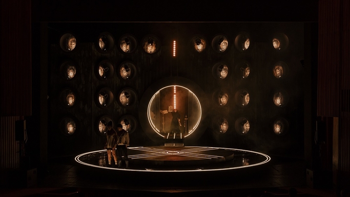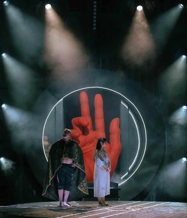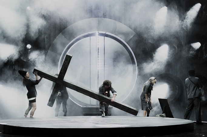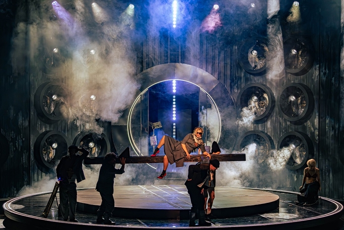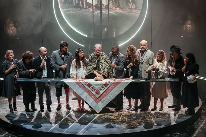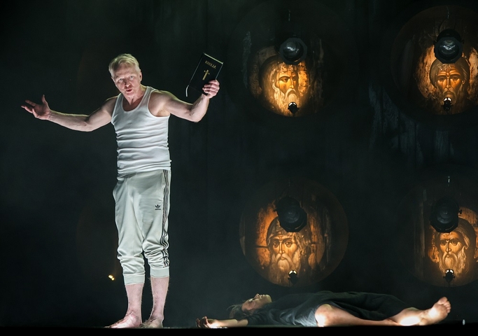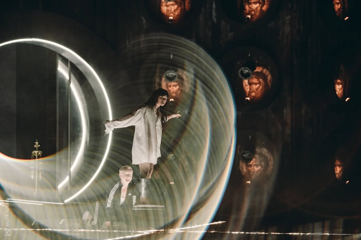 O augmentare vizual-temporală pertinentă a nimbului preaslăvirii deșănțate decupat dintr-o icoană uriașă, expandată parcă din coperta albumului „The Cross of Changes” (Enigma, asociere deloc întâmplătoare!) și replicată la dimensiuni încă și mai generoase pe scândura rotativei care parcă-i amplifică uneori prin mișcare exagerarea pe care i-o descoperi cu uimire printre scrâșnete de dinți încleștându-se revoltat la fiecare nouă întindere de culoare pe pânza îndurerată a habotniciei, fixată în tușe groase de scârțâit apocaliptic, într-un acustic bine înșurubat în posibilitățile vizuale ale contemporanului (excelentă joaca Irinei Moscu de-a consistențele și dimensiunile – mai ales adâncimile – sacrului, care permit un ecleraj foarte special, decupând, prin dispunerea geometrică a elementelor de decor și mixul de reflexii, simboluri pe care se mută lejer accentul poveștii din sacru în profan și invers) din care scenografa smulge cu măiestrie aura uriașă a personajului purtat dincolo și dincoace de veneralul impus (funcțională și ca portal pentru câteva importante declarații regizorale), aducându-l dintre icoanele care-i fixează neatinsul în laicul abrupt pe care Botond Nagy îl imaginează în narativul de-a dreptul folcloric, cu accent unguresc-ardelenesc, căruia Irina Moscu îi înalță cu aceeași debordantă iscusință imaginile de basm popular (excelent punctat și la nivel de costume).